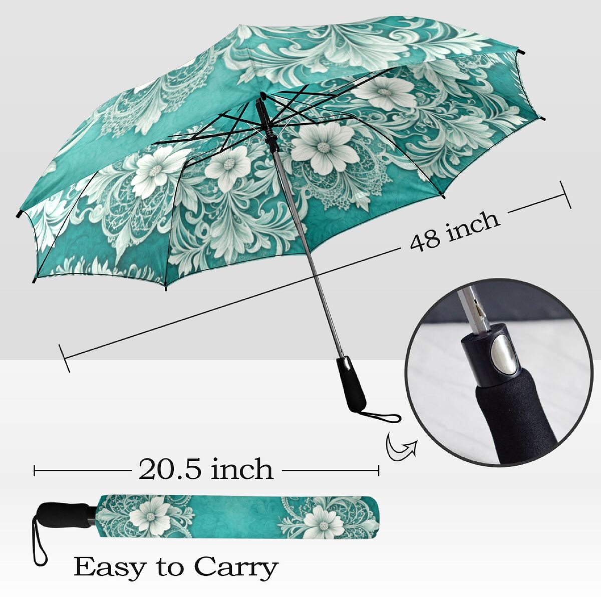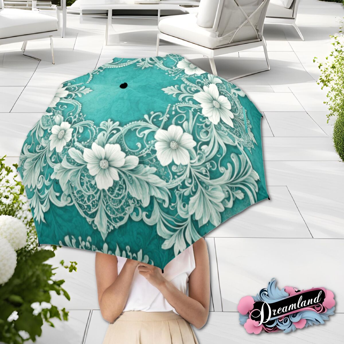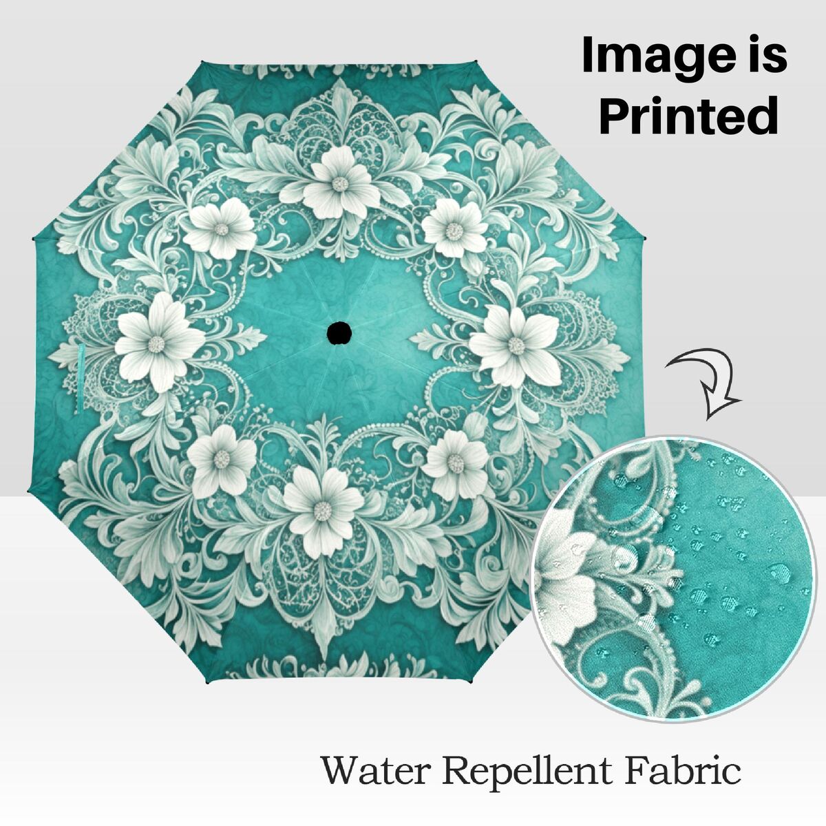 Aqua Blue Umbrella Flower Floral Art Nouveau Printed Faux Lsce Parasol Semi-Automatic Waterproof Foldable Umbrella