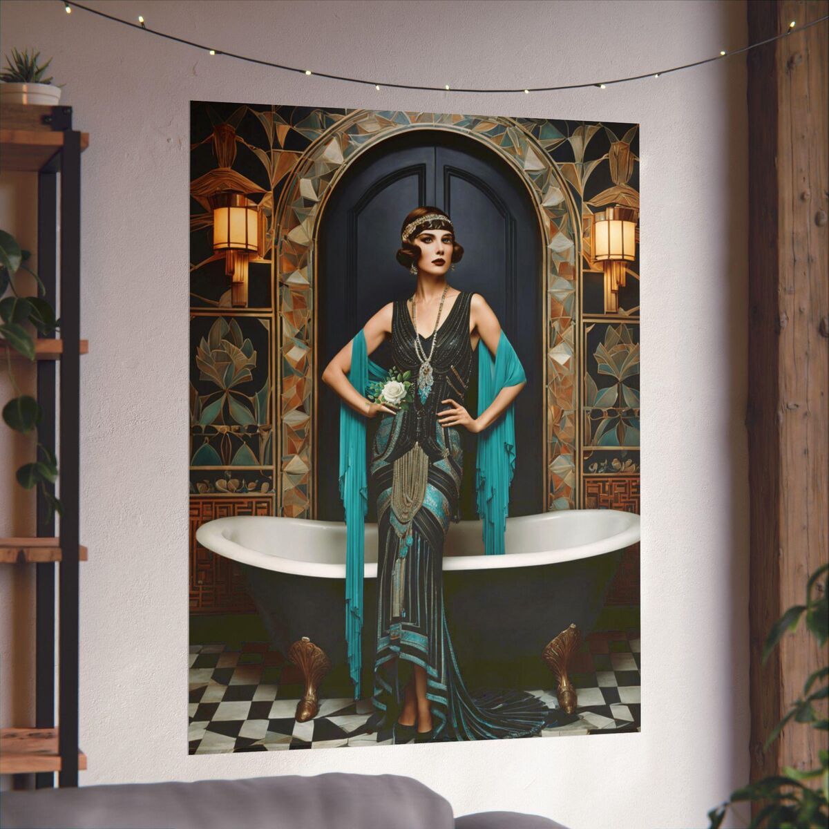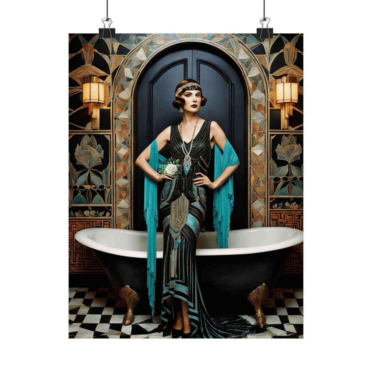 Flapper Art Deco Teal Bathroom Print Gatsby Girl Poster Retro Powder Room Wall Art 1920s Style Home Decor