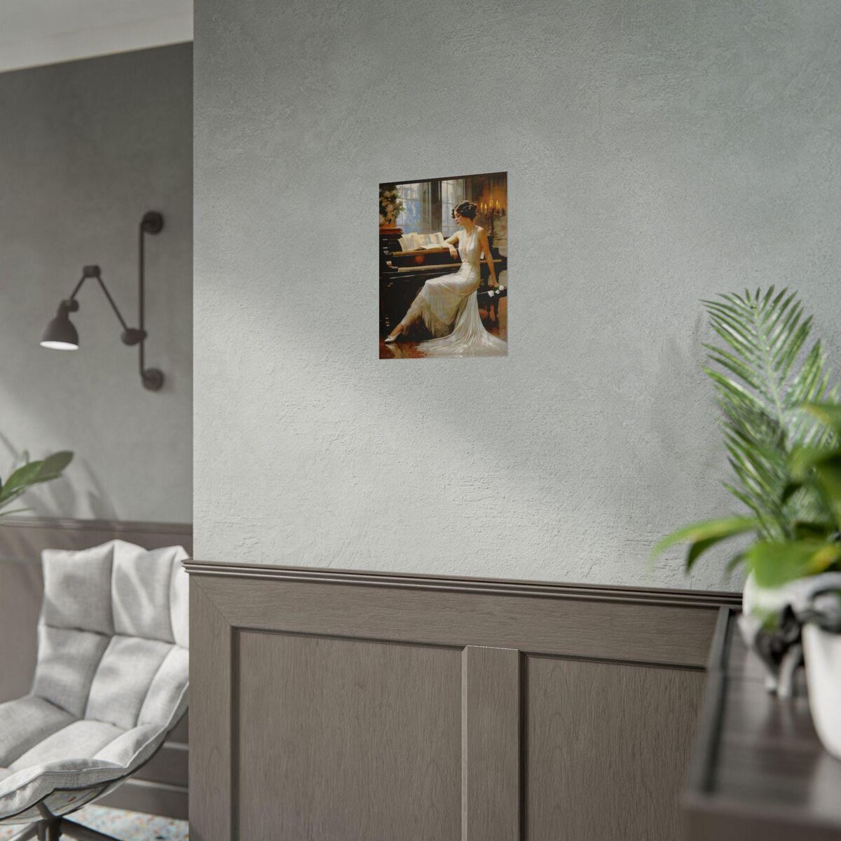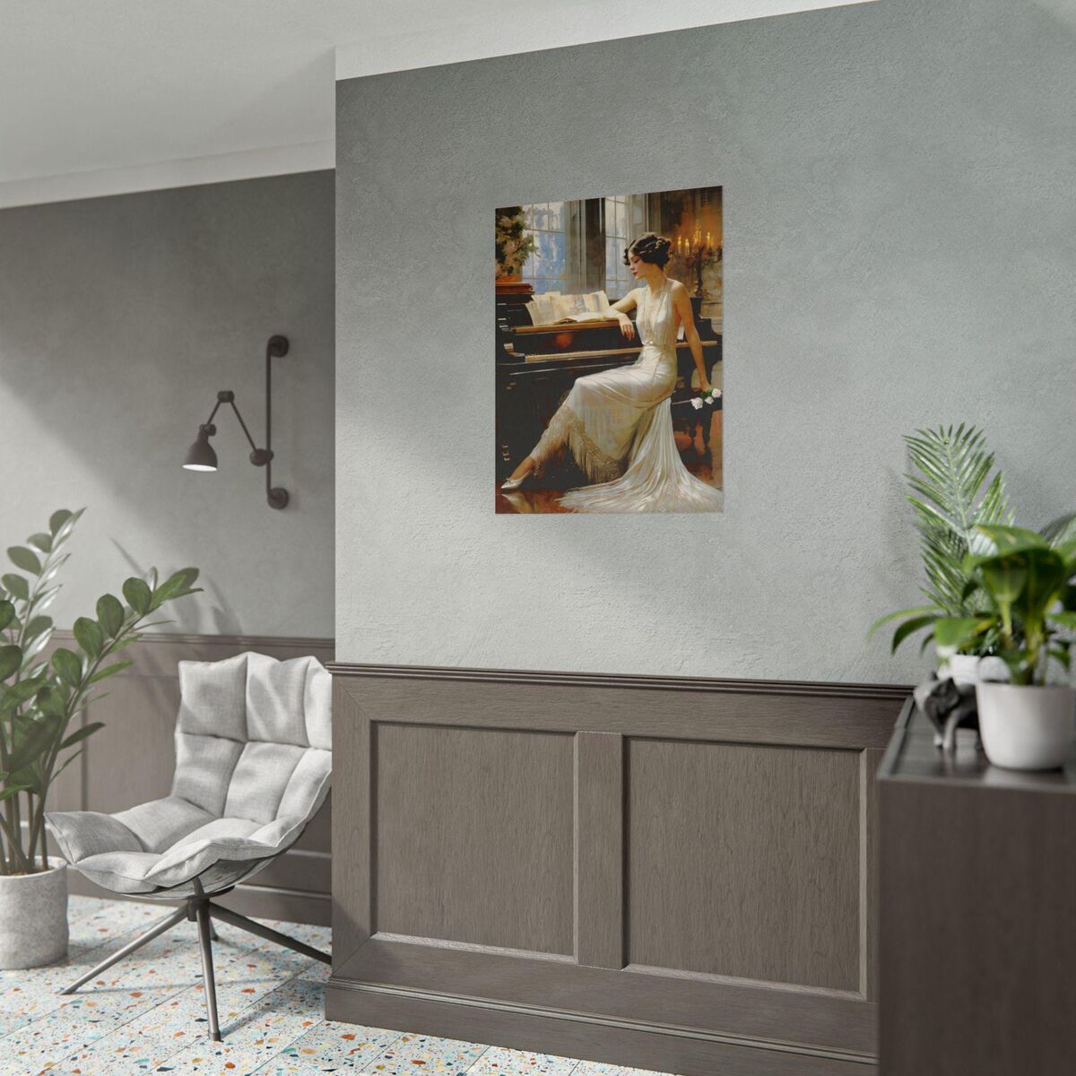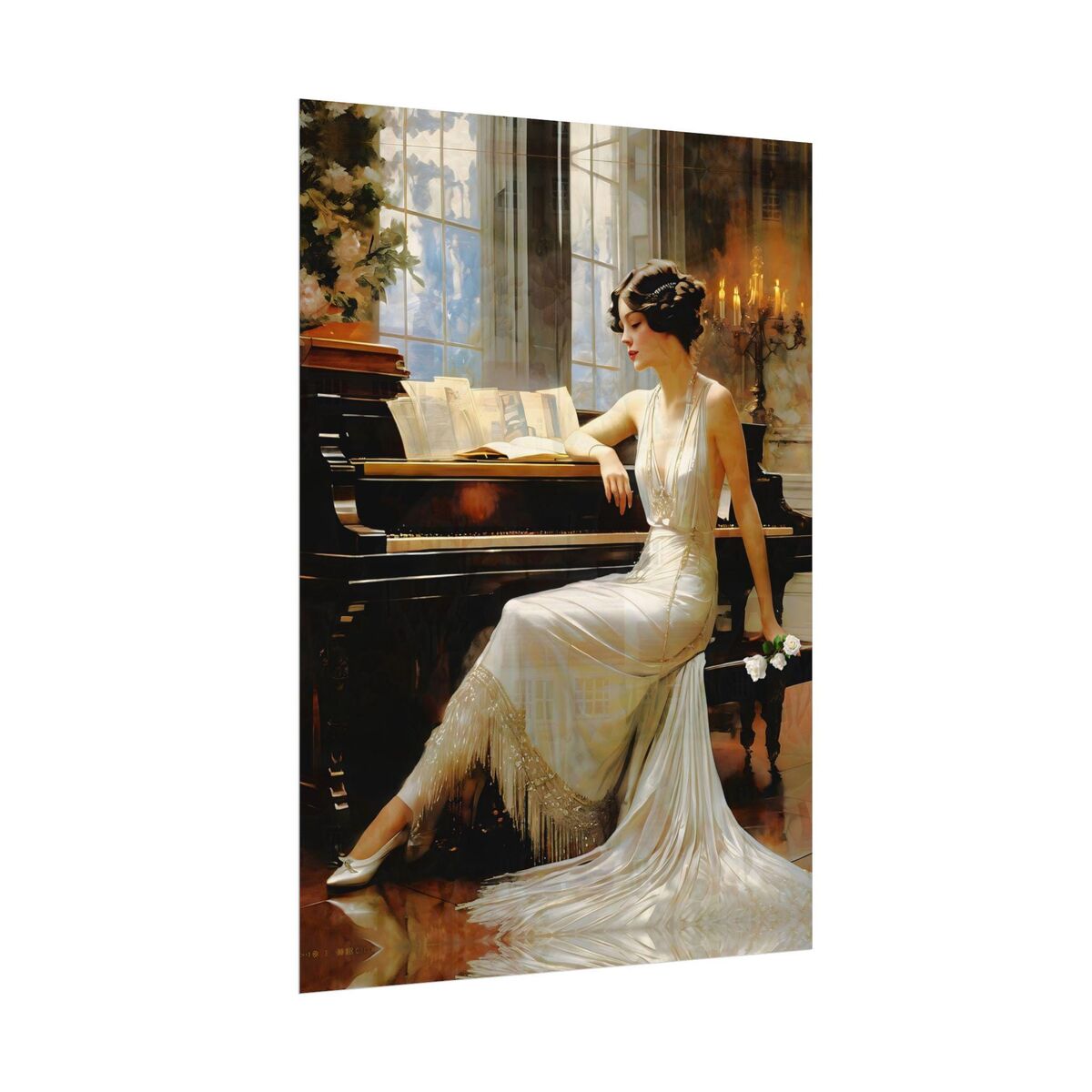 Enhance the ambiance of your living space with this captivating painting Print. This exquisite art deco print features a mesmerizing lady at a piano, exuding an enchanting aura that will add a touch of elegance to any room. This is a print of the original painting, and is exclusive to Dreamland