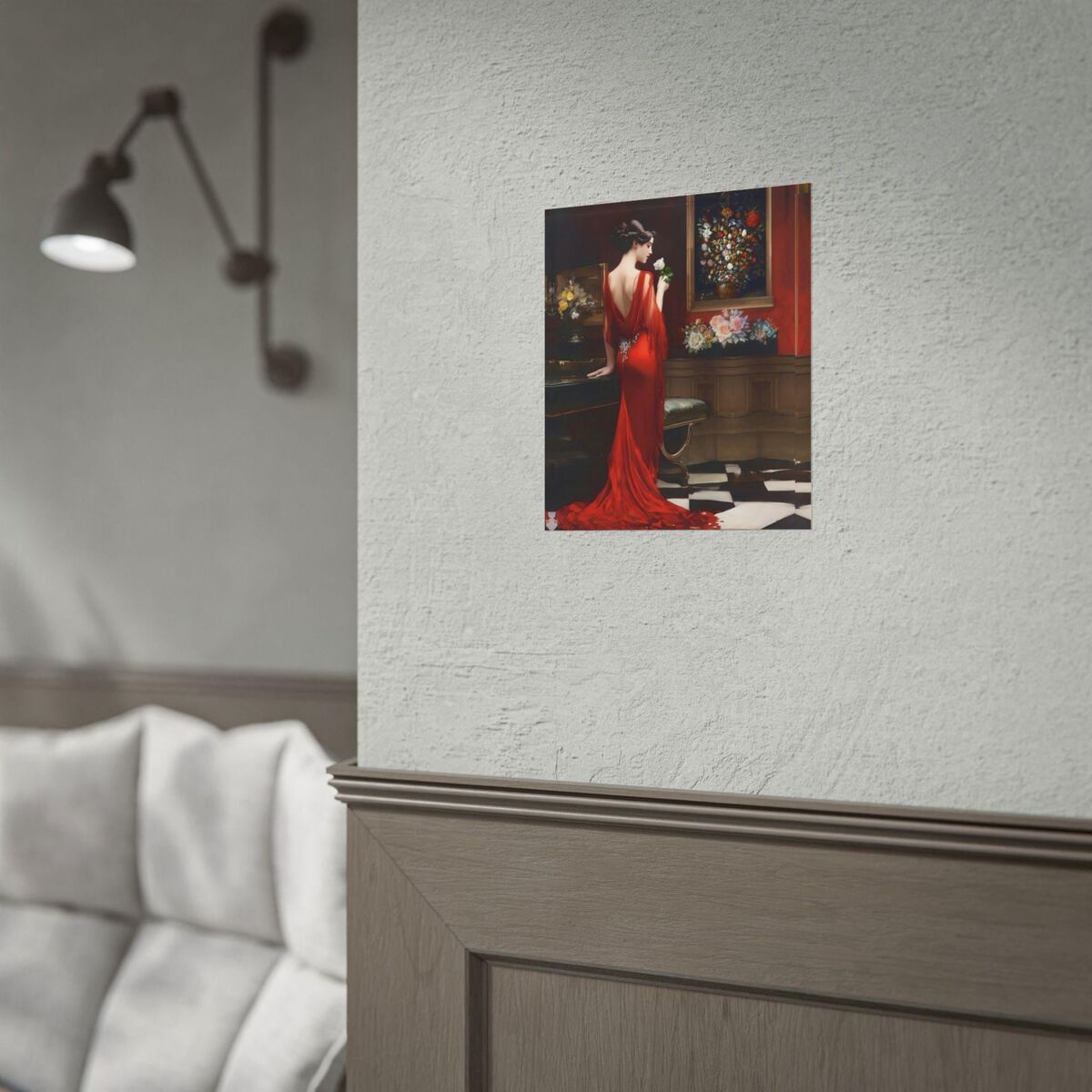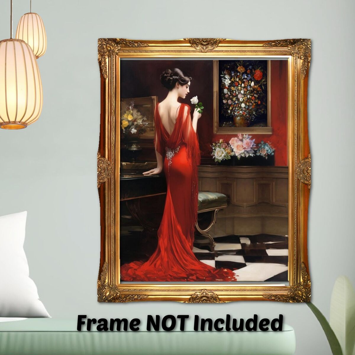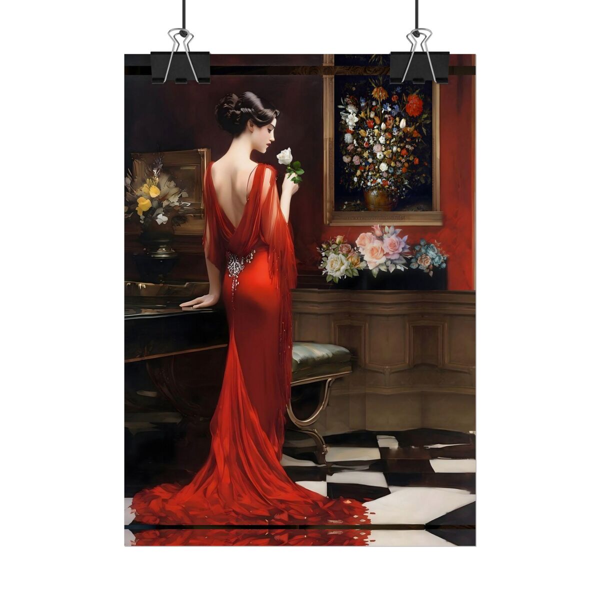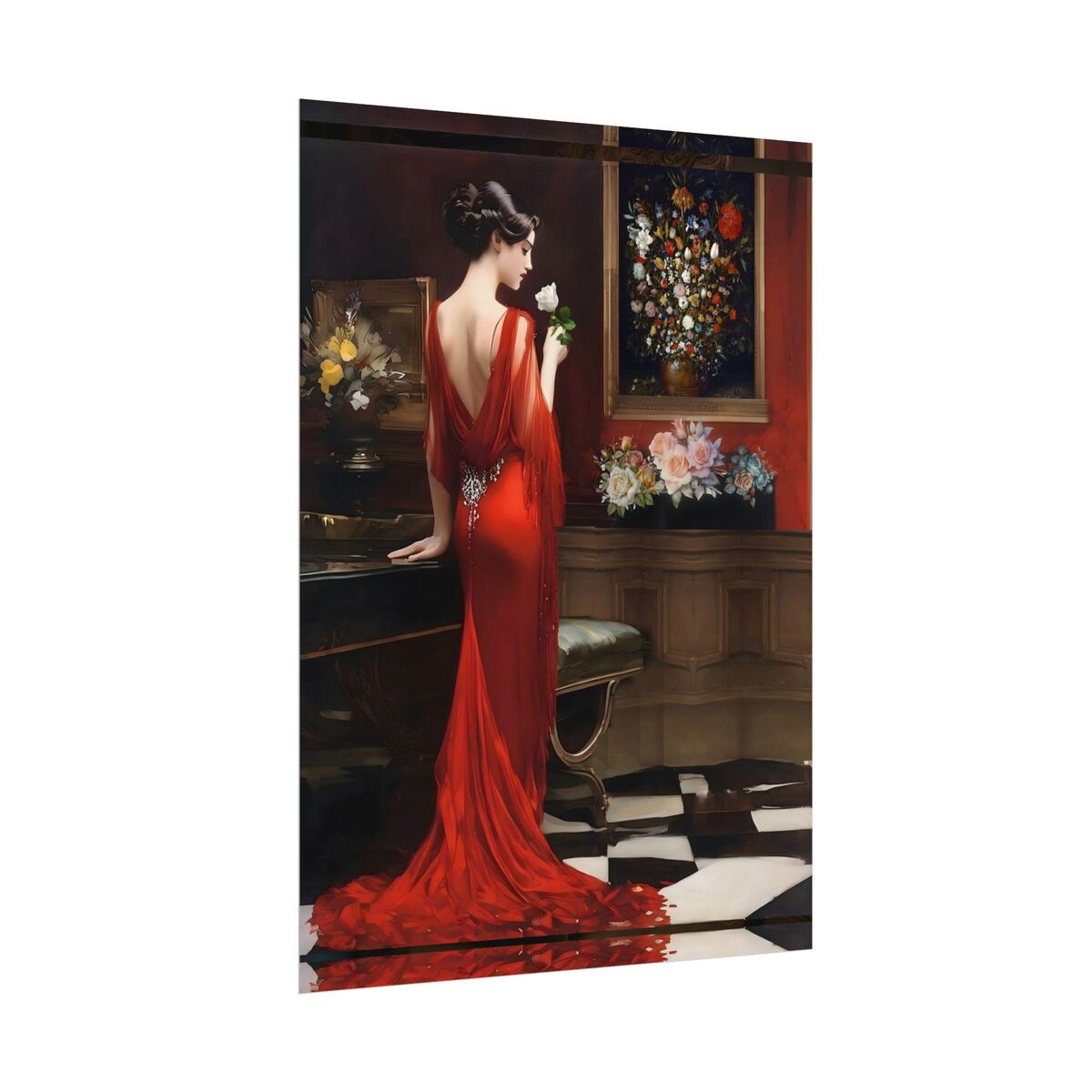 Enhance the ambiance of your living space with this captivating painting Print. This exquisite art deco print features a mesmerizing lady in a room full of roses, exuding an enchanting aura that will add a touch of elegance to any room. This is a print of the original painting, and is exclusive to Dreamland