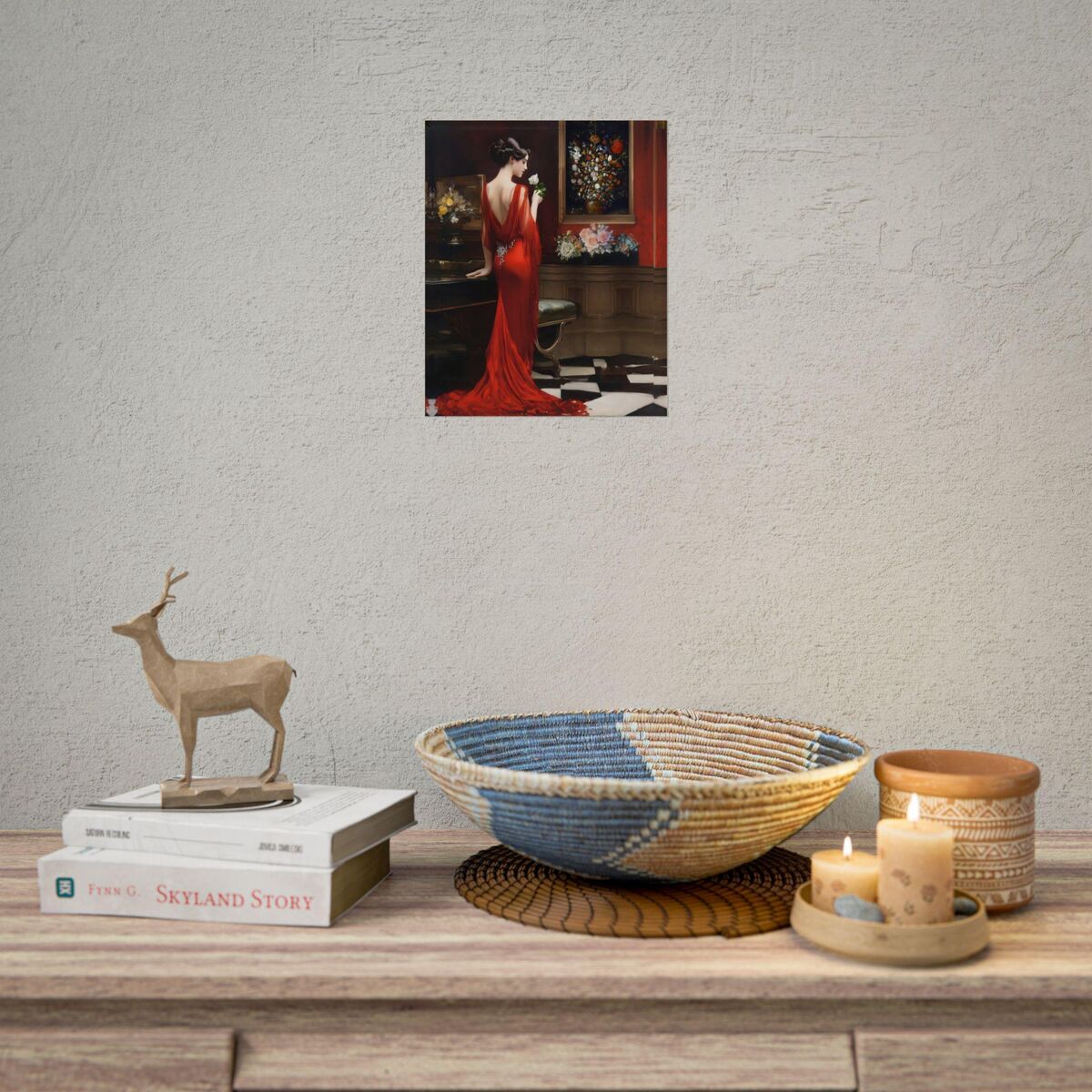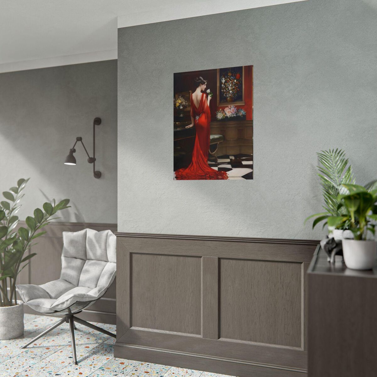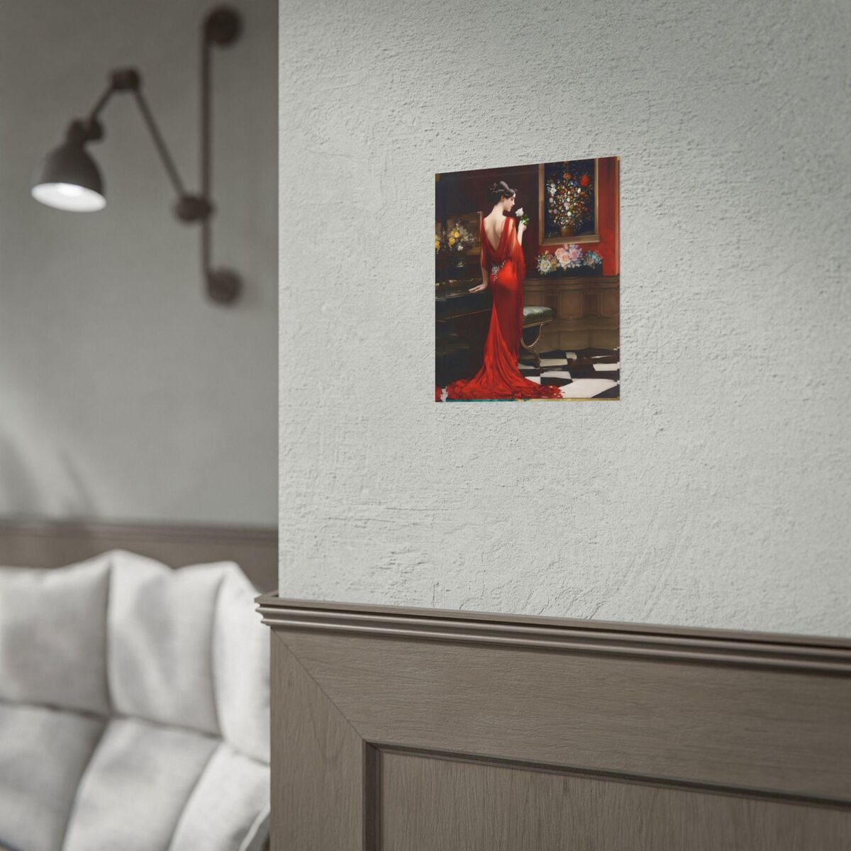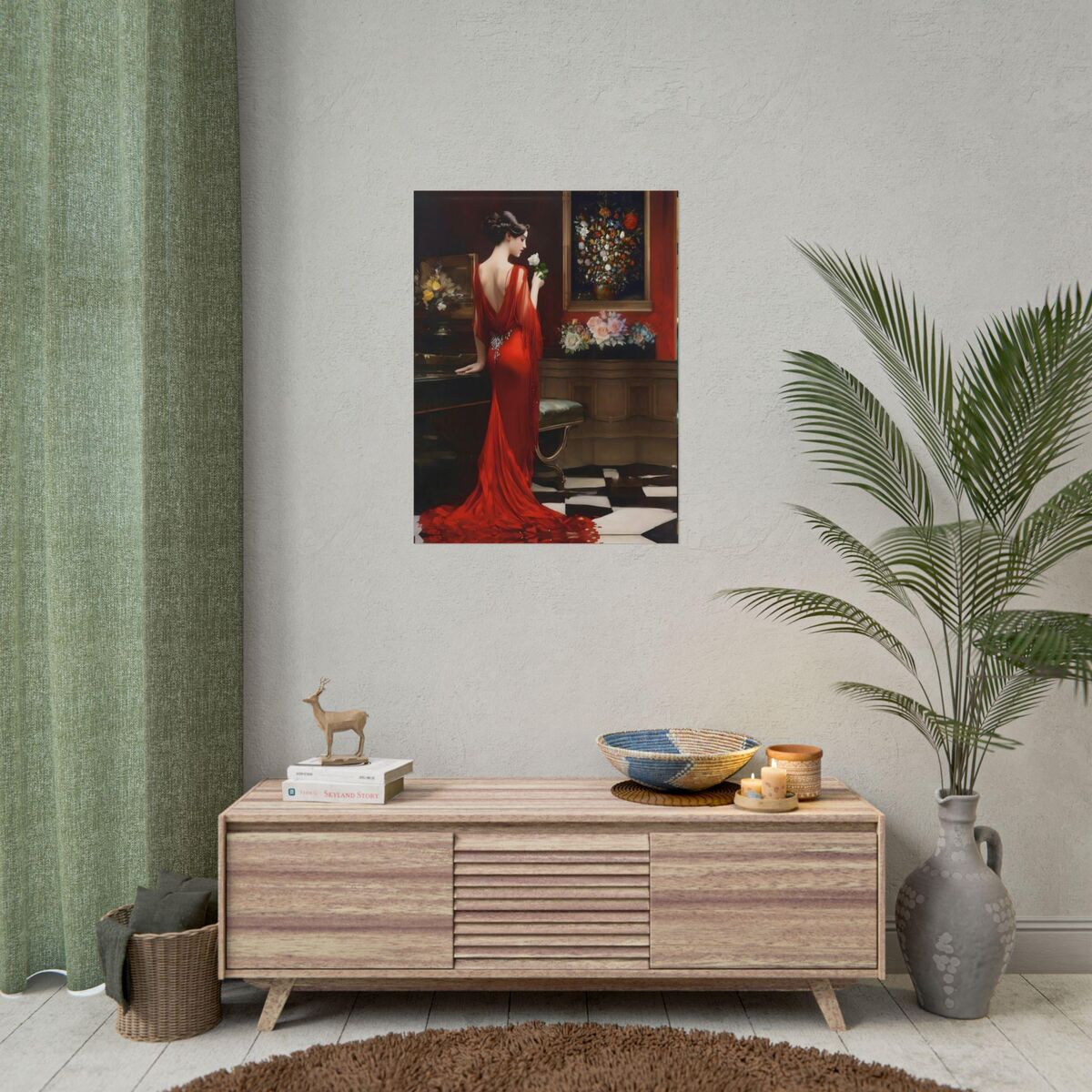 Enhance the ambiance of your living space with this captivating painting Print. This exquisite art deco print features a mesmerizing lady in a room full of roses, exuding an enchanting aura that will add a touch of elegance to any room. This is a print of the original painting, and is exclusive to Dreamland