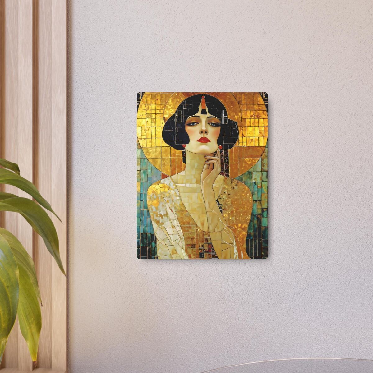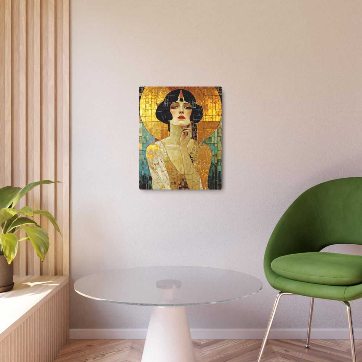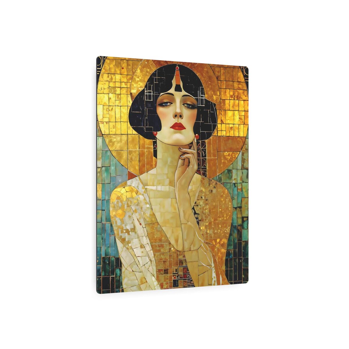 This exquisite Art Nouveau metal art poster features a stunning faux mosaic design, inspired by the iconic works of Mucha and Klimt. The portrait of a woman, elegantly rendered, captures the essence of the Art Nouveau movement, showcasing intricate details and vibrant colors that bring a sense of sophistication to any space.