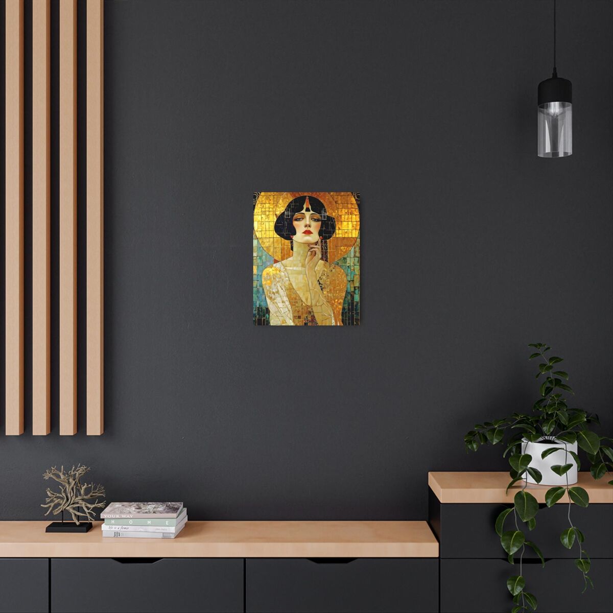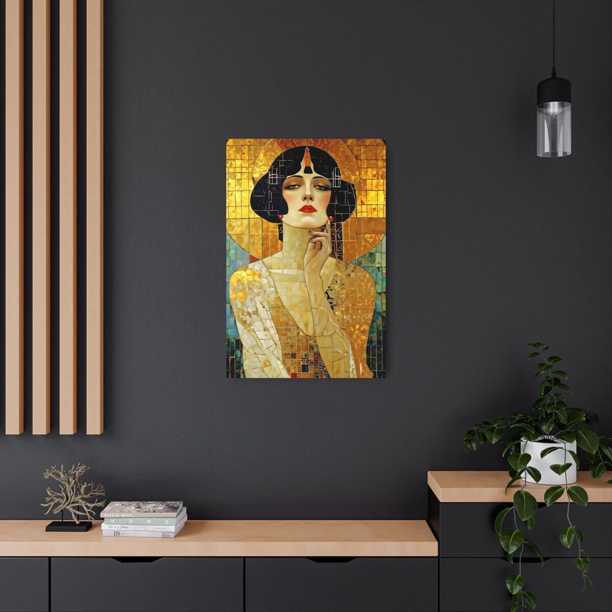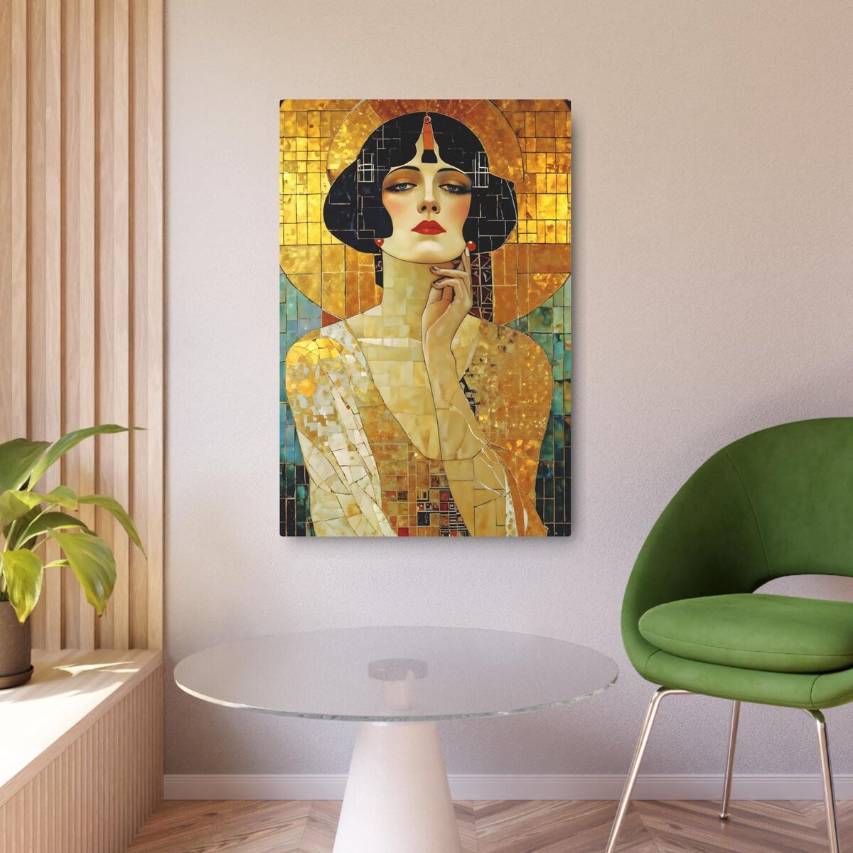 This exquisite Art Nouveau metal art poster features a stunning faux mosaic design, inspired by the iconic works of Mucha and Klimt. The portrait of a woman, elegantly rendered, captures the essence of the Art Nouveau movement, showcasing intricate details and vibrant colors that bring a sense of sophistication to any space.
