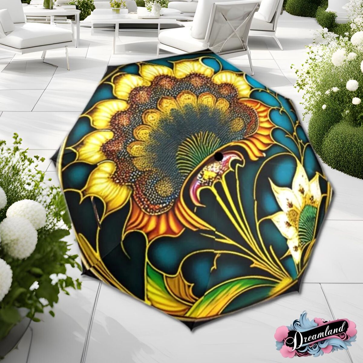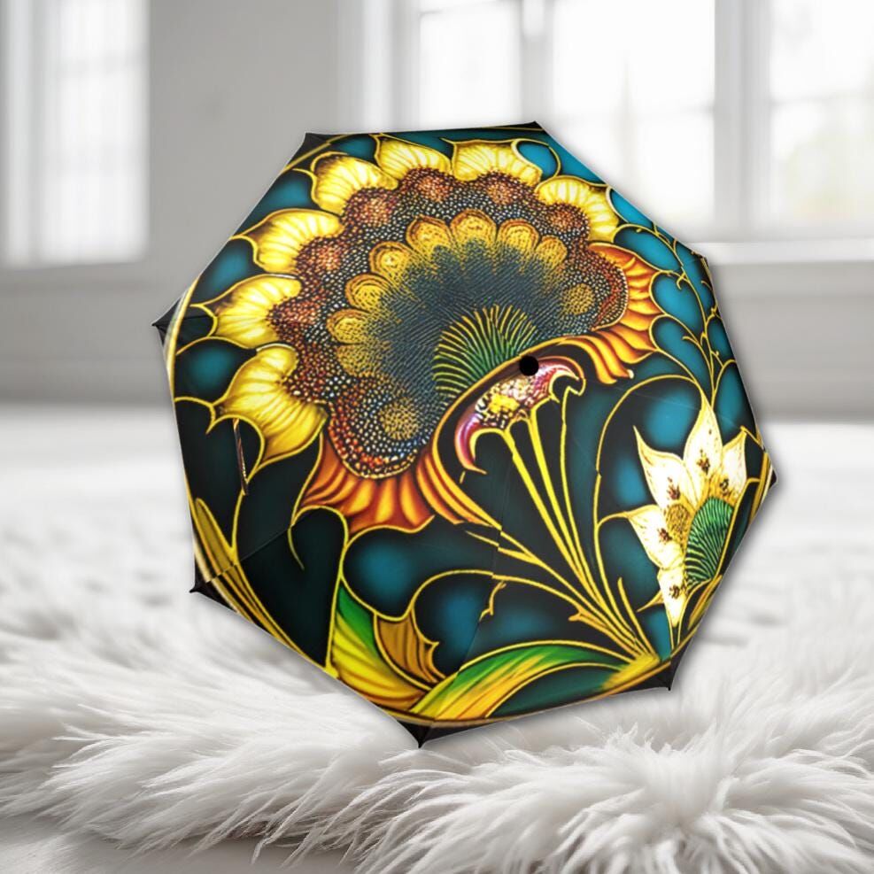 Art Nouveau Romantic Umbrella Faux Stained Glass Flower Parasol Semi-Automatic Waterproof Foldable Umbrella