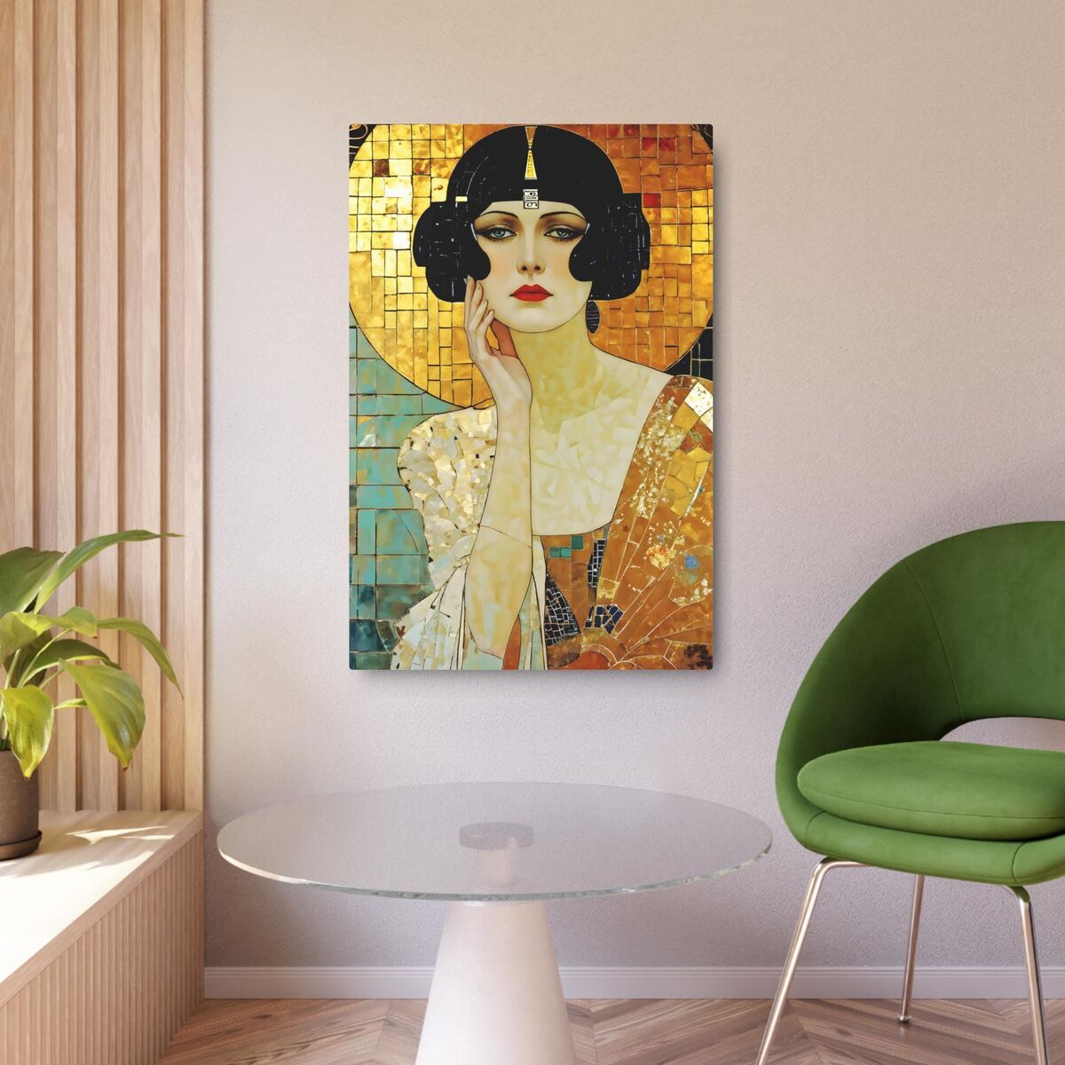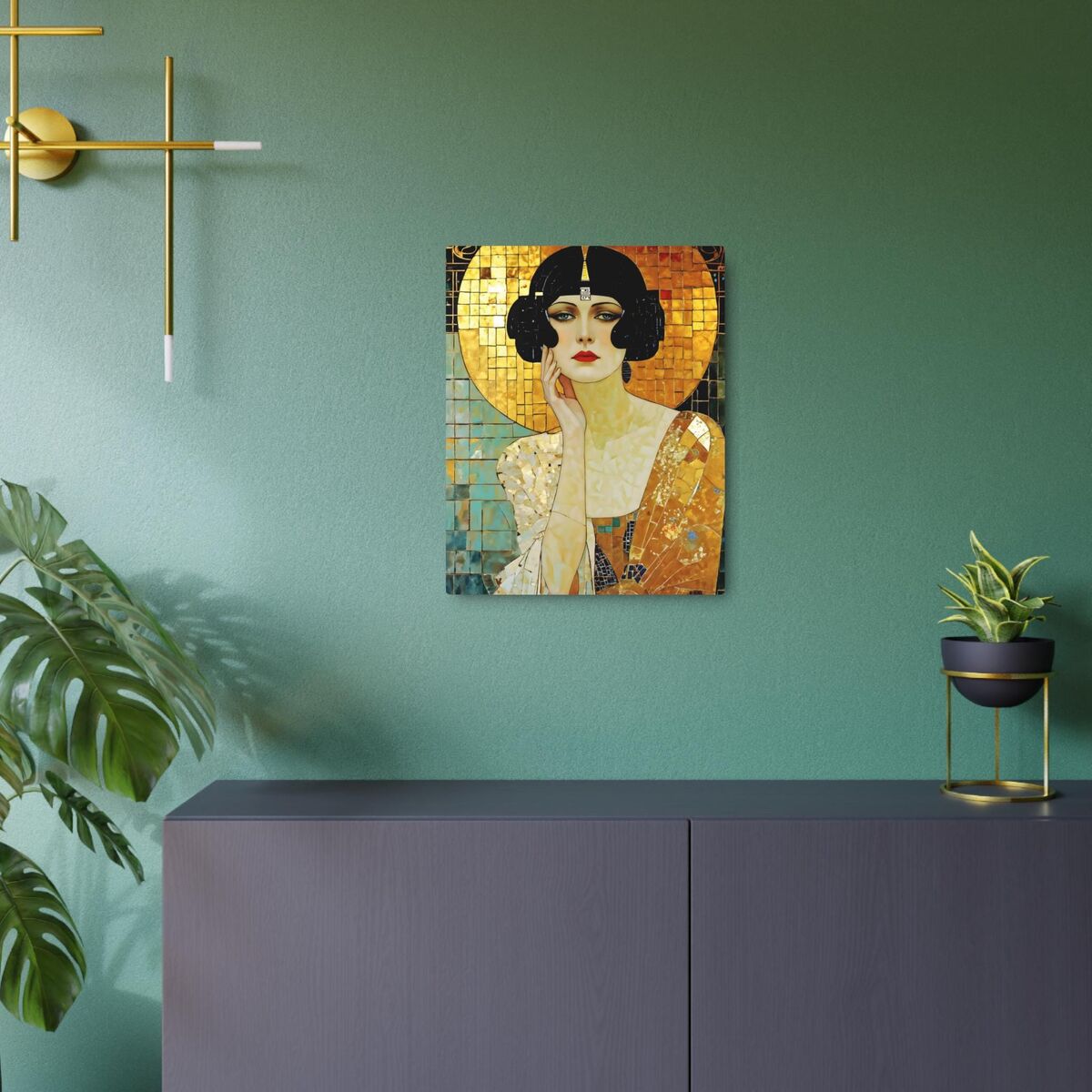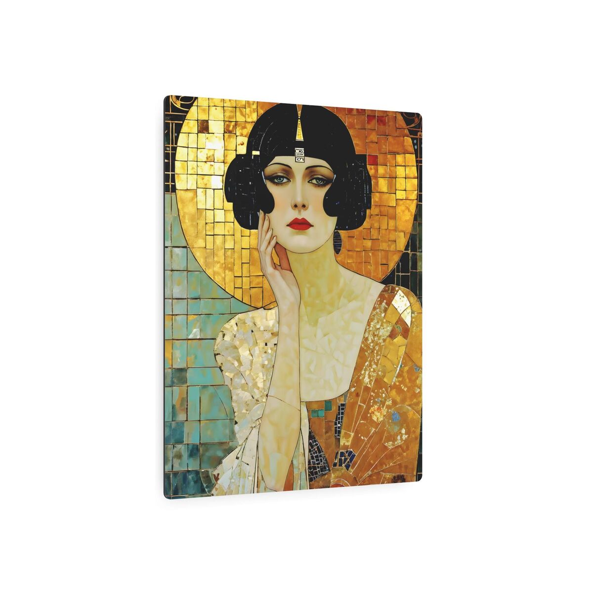 This exquisite Art Nouveau metal art poster features a stunning faux mosaic design, inspired by the iconic works of Mucha and Klimt. The portrait of a woman, elegantly rendered, captures the essence of the Art Nouveau movement, showcasing intricate details and vibrant colors that bring a sense of sophistication to any space.
