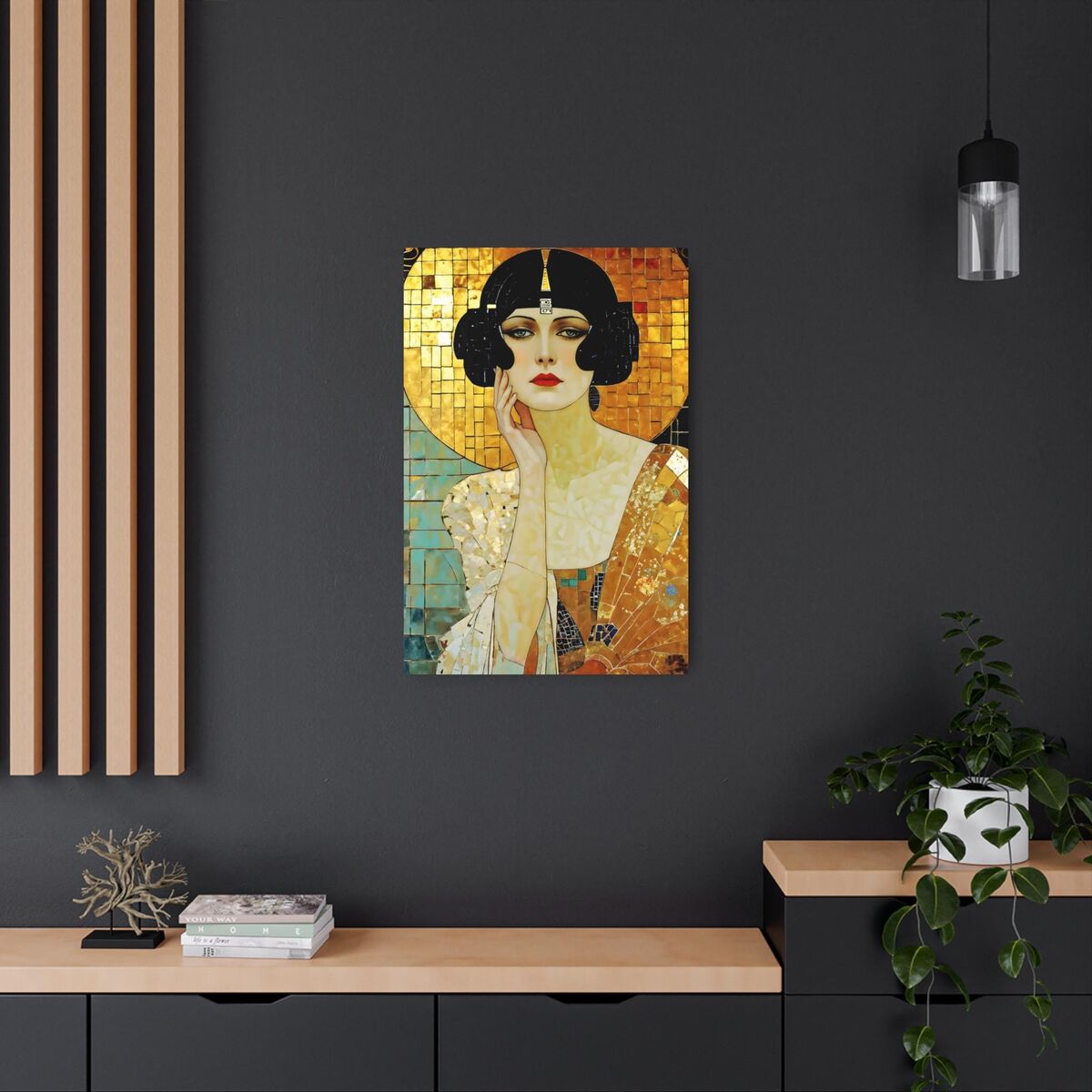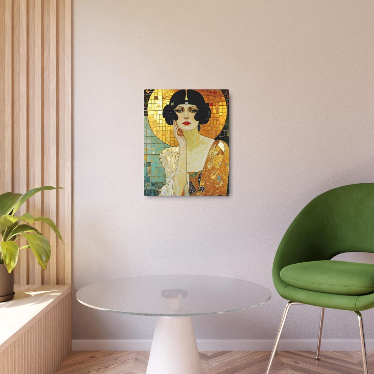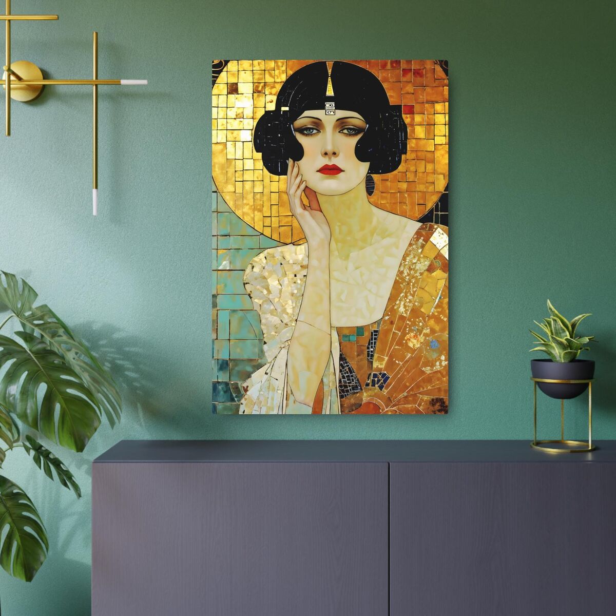 This exquisite Art Nouveau metal art poster features a stunning faux mosaic design, inspired by the iconic works of Mucha and Klimt. The portrait of a woman, elegantly rendered, captures the essence of the Art Nouveau movement, showcasing intricate details and vibrant colors that bring a sense of sophistication to any space.