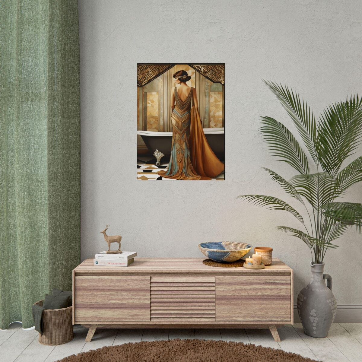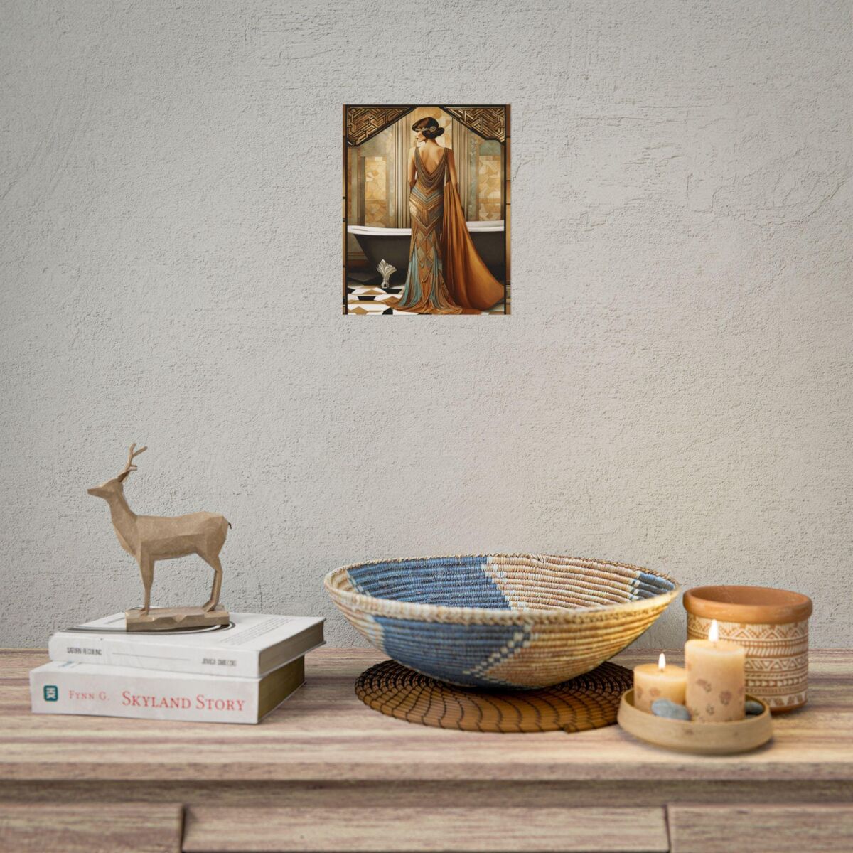 Enhance the ambiance of your living space with this captivating painting Print. This exquisite art deco print features a mesmerizing lady , exuding an enchanting aura that will add a touch of elegance to any room. This is a print of the original painting, and is exclusive to Dreamland