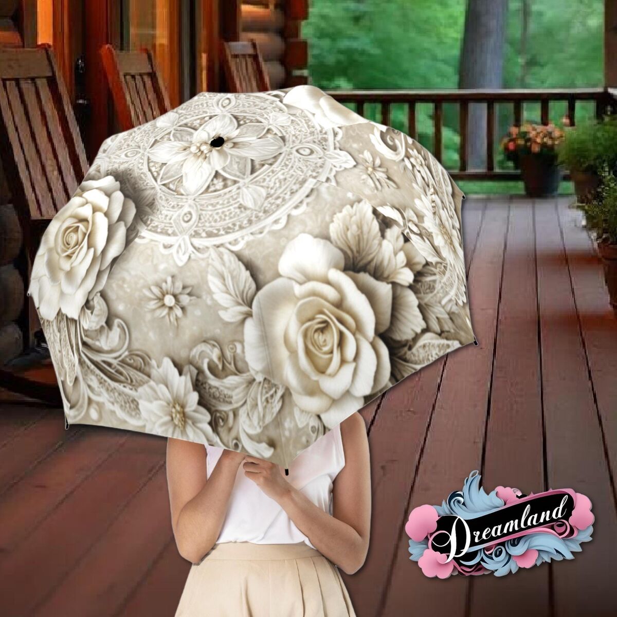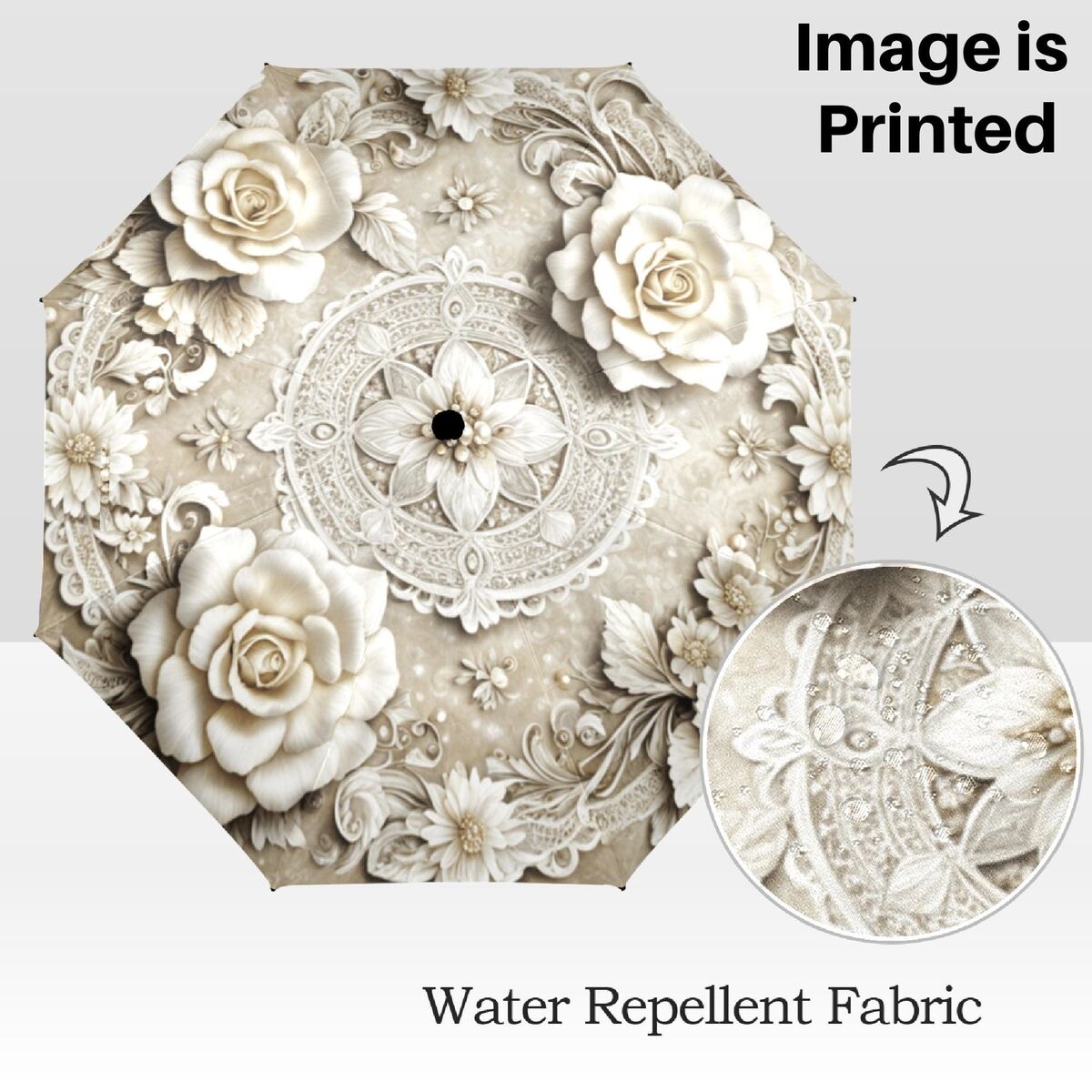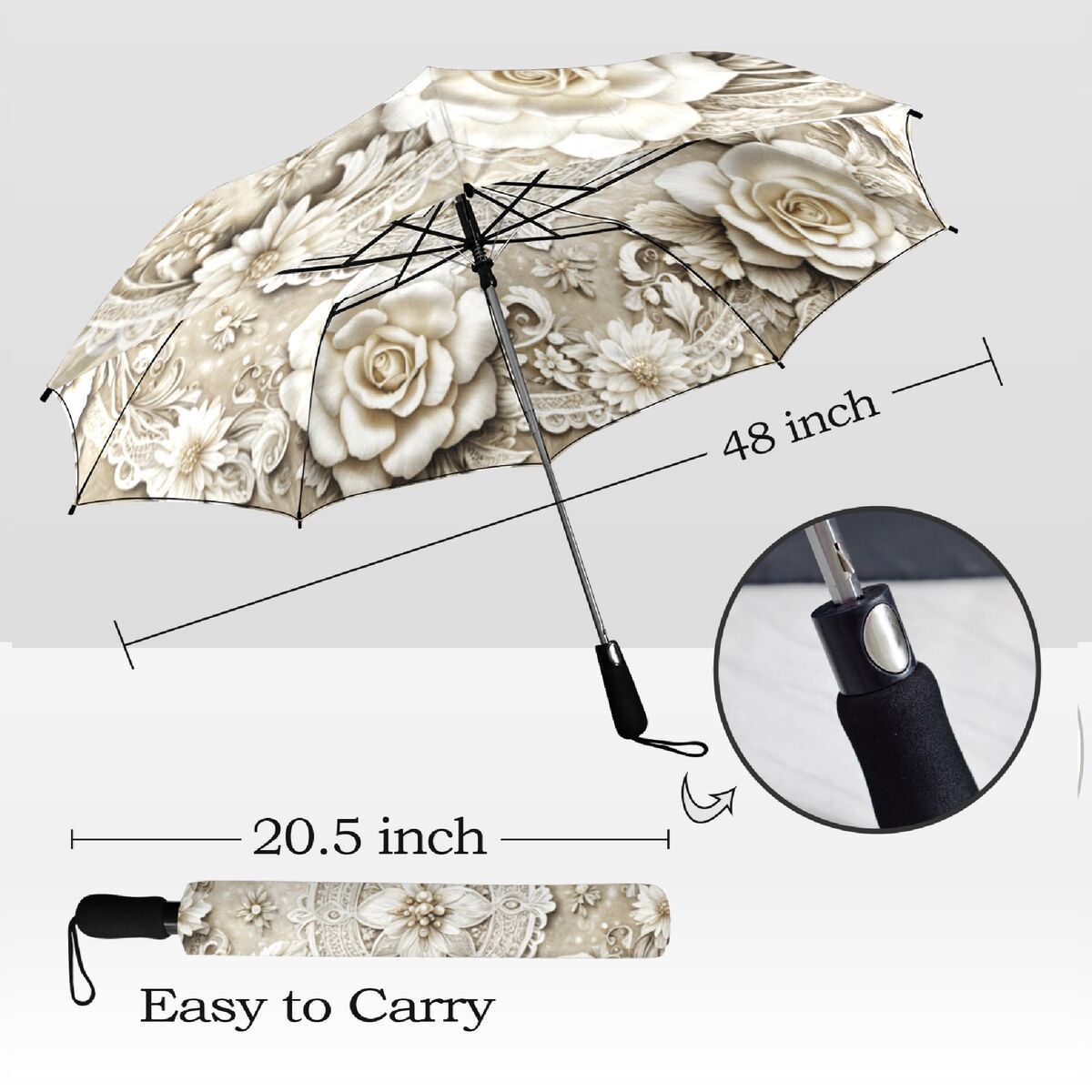 Beige Cream Flower Umbrella Art Nouveau Printed Floral Parasol Semi-Automatic Waterproof Foldable Umbrella