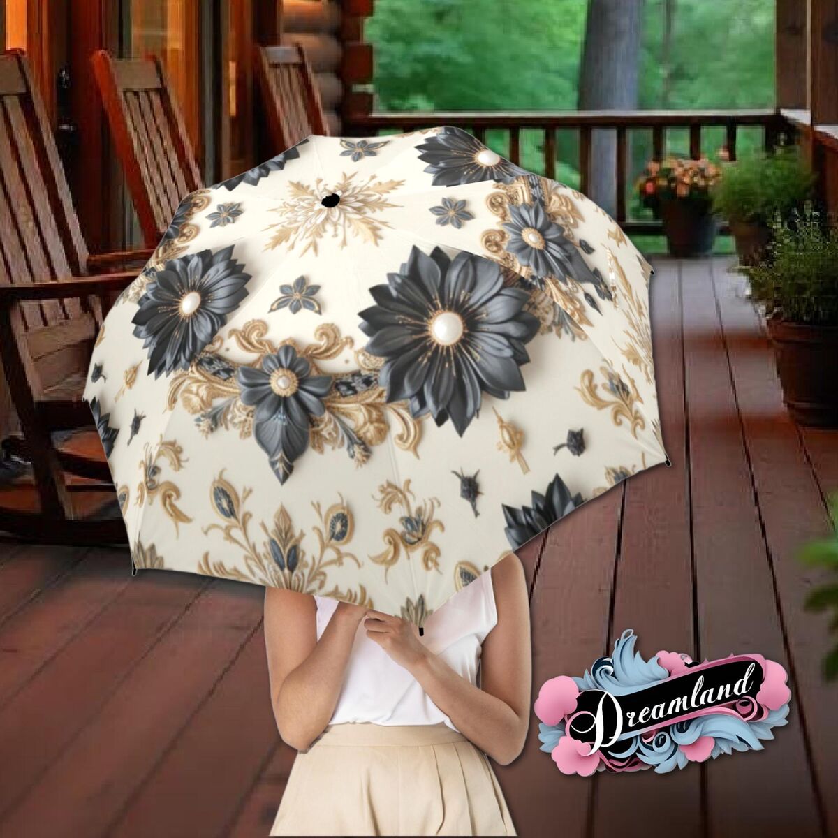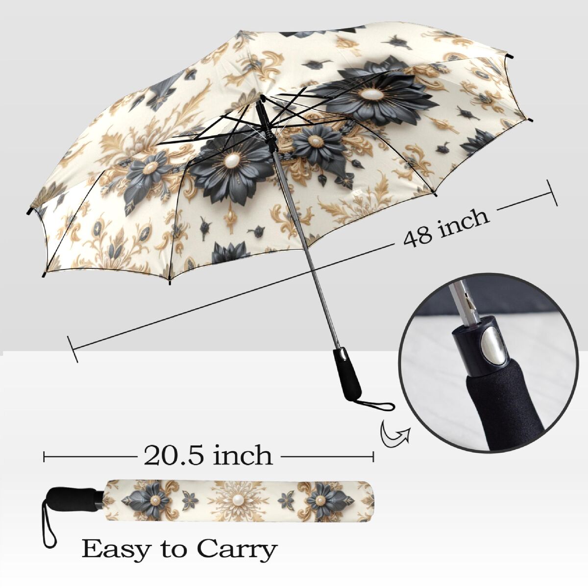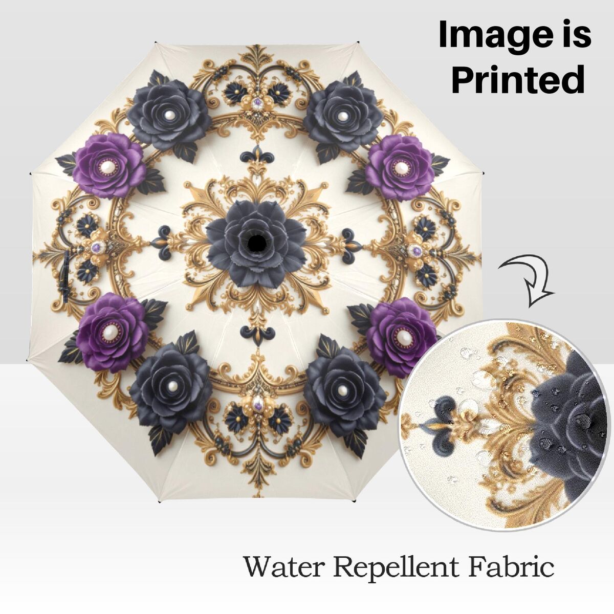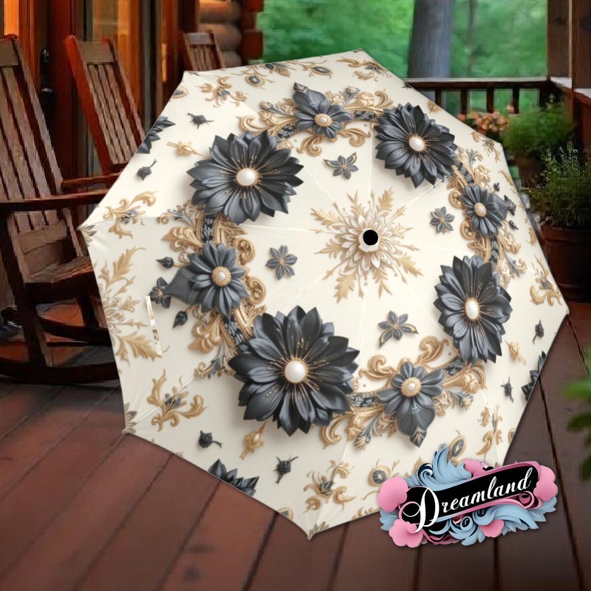 Black Cream Umbrella Romantic Floral Art Nouveau Victorian Gothic Parasol Semi-Automatic Waterproof Foldable Umbrella