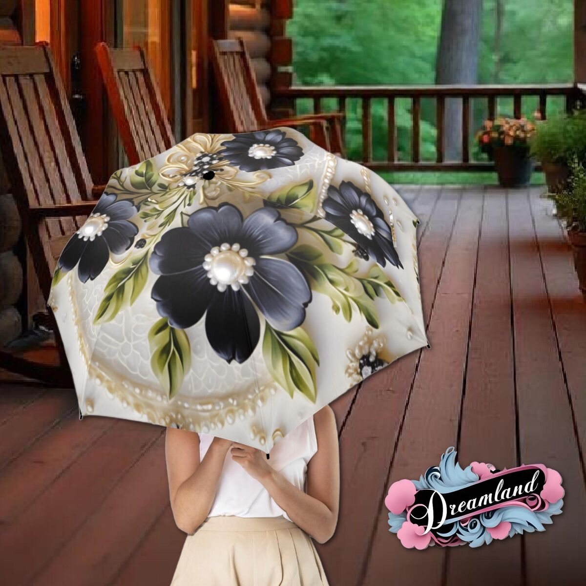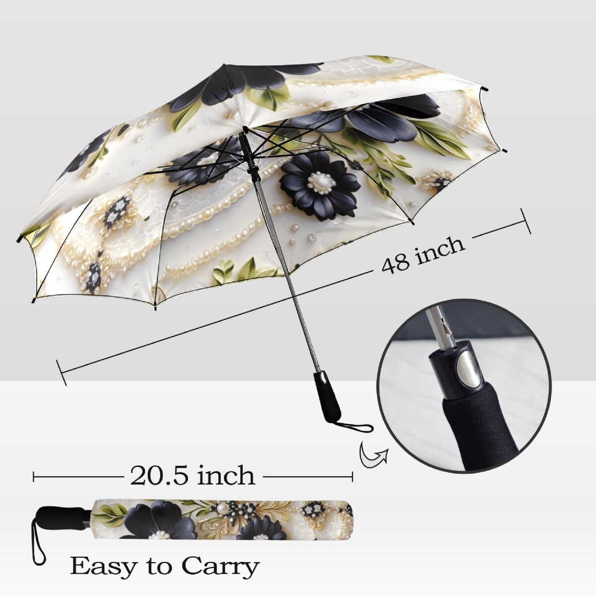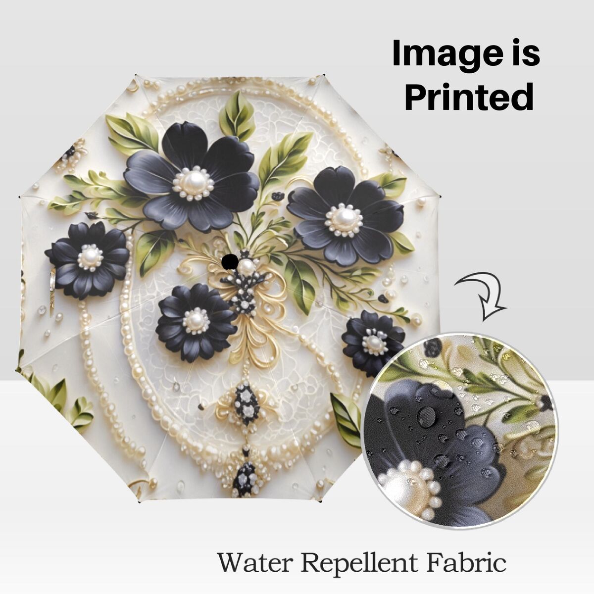 Black Gold Umbrella Art Nouveau Printed Pearls Parasol Semi-Automatic Waterproof Foldable Umbrella