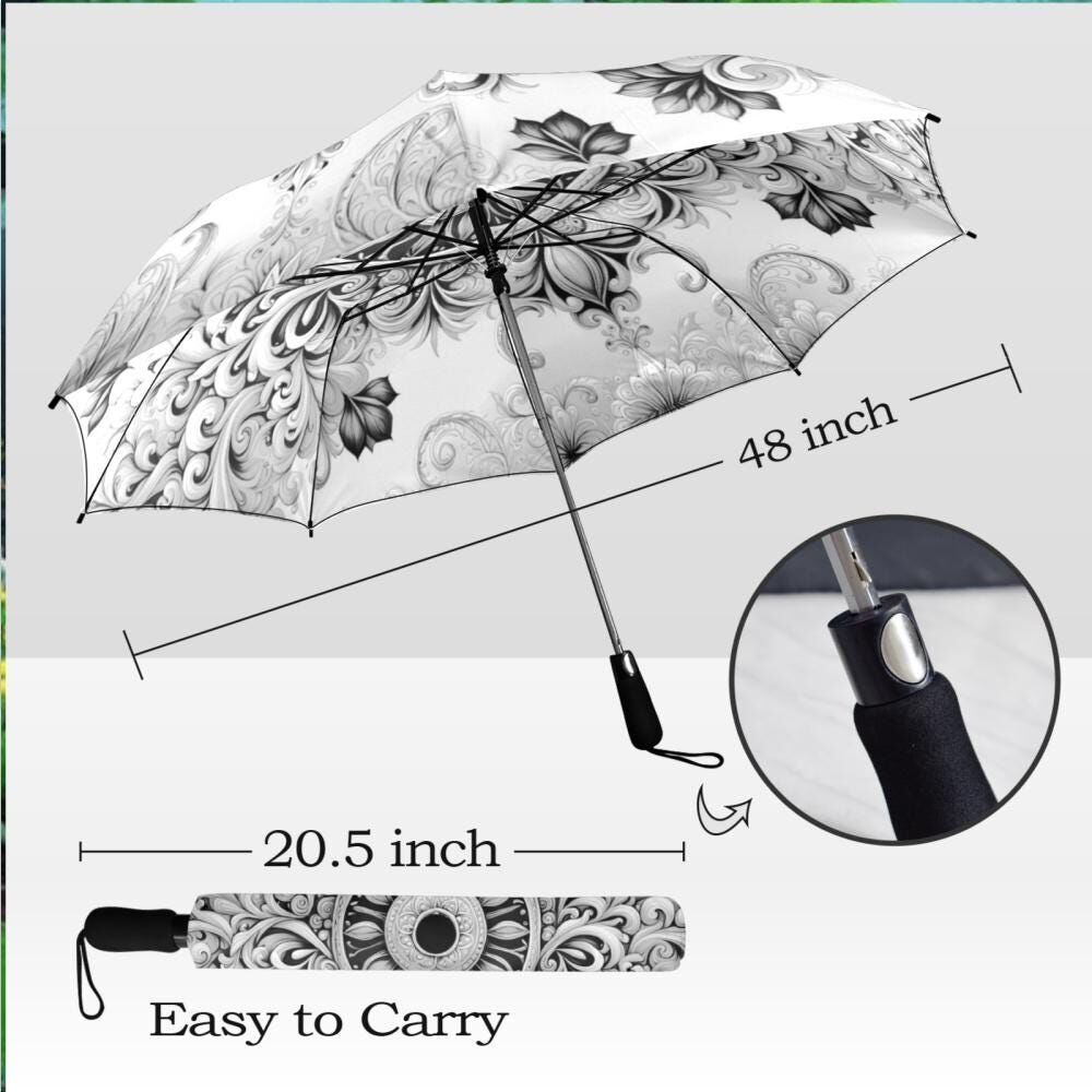 Black Gray Boho Umbrella Rococo Baroque Style Mandela Parasol Semi-Automatic Sun Rain Waterproof Foldable Umbrella