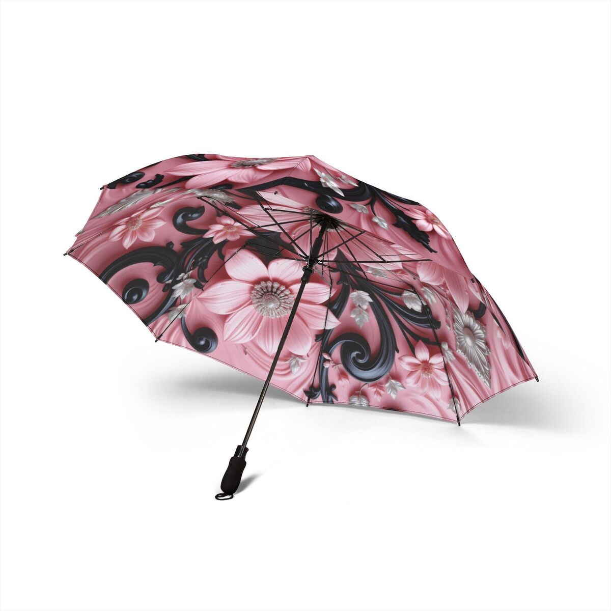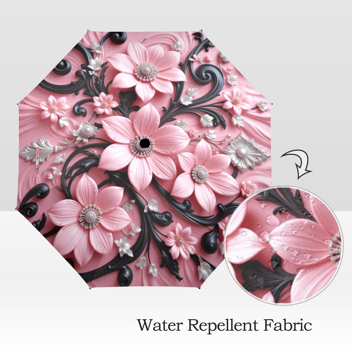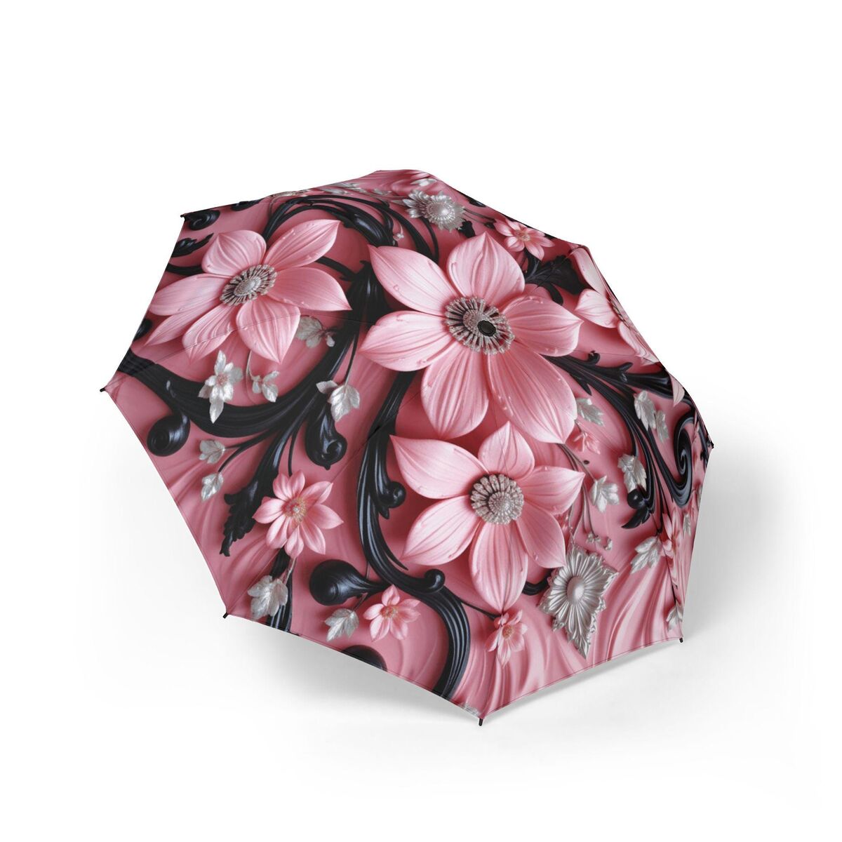Black Pink Flower Umbrella Pink Art Nouveau Printed Flowers Floral Parasol Semi-Automatic Waterproof Foldable Umbrella