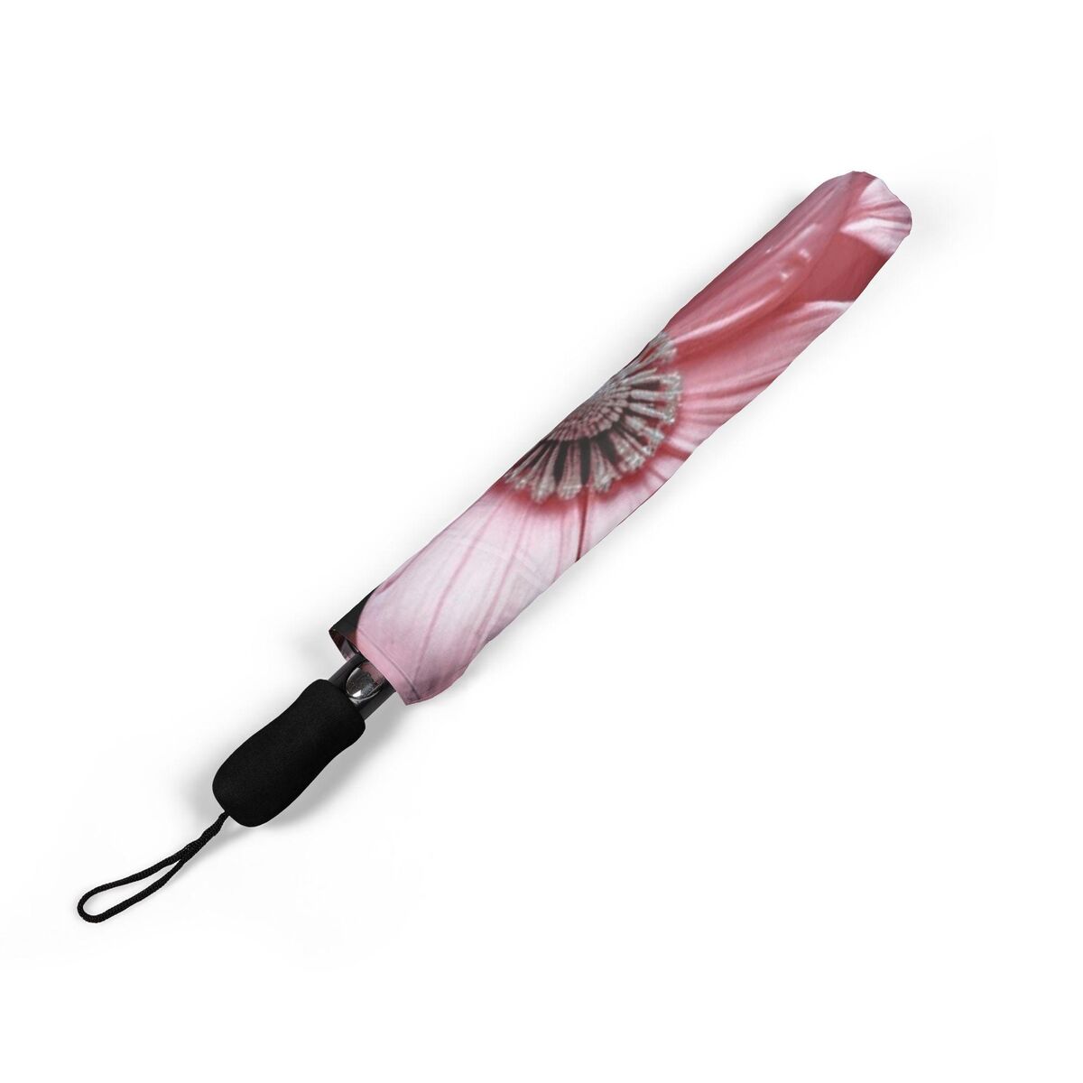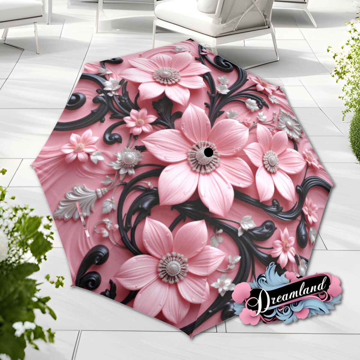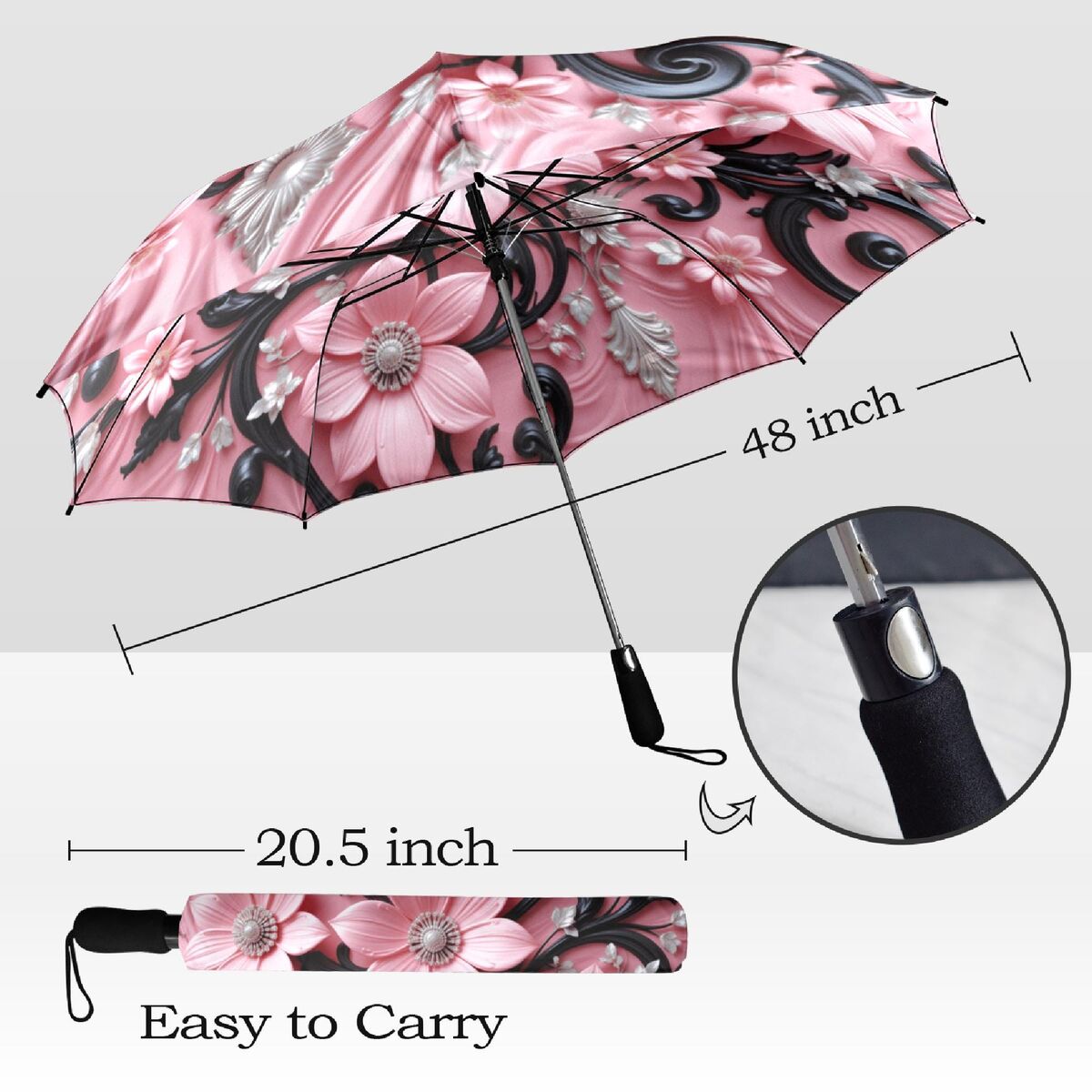 Black Pink Flower Umbrella Pink Art Nouveau Printed Flowers Floral Parasol Semi-Automatic Waterproof Foldable Umbrella