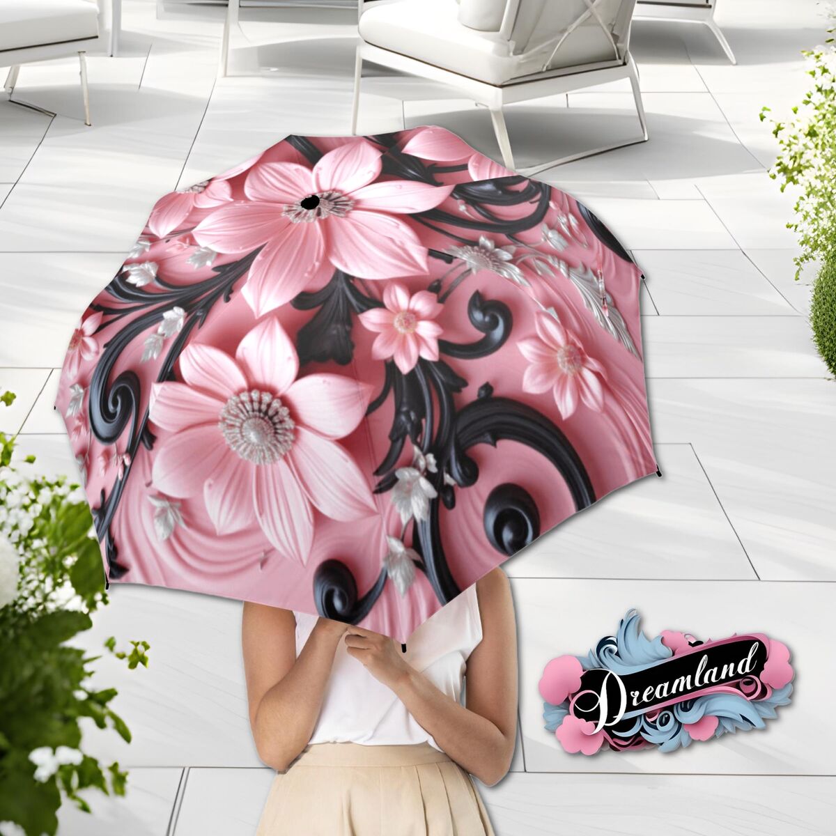 Romantic Pink Umbrella Victorian Inspired Boho Flower Parasol Semi-Automatic Waterproof Foldable Umbrella