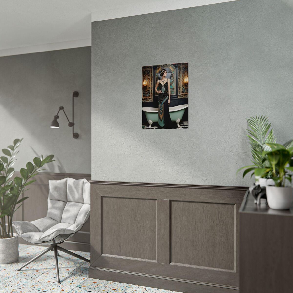 The combination of gold and teal colors creates a luxurious and glamorous look, while the vintage-inspired Gatsby Girl design adds a unique and stylish flair. This wall art print is a must-have for anyone looking to bring a touch of 1920s charm to their bathroom.