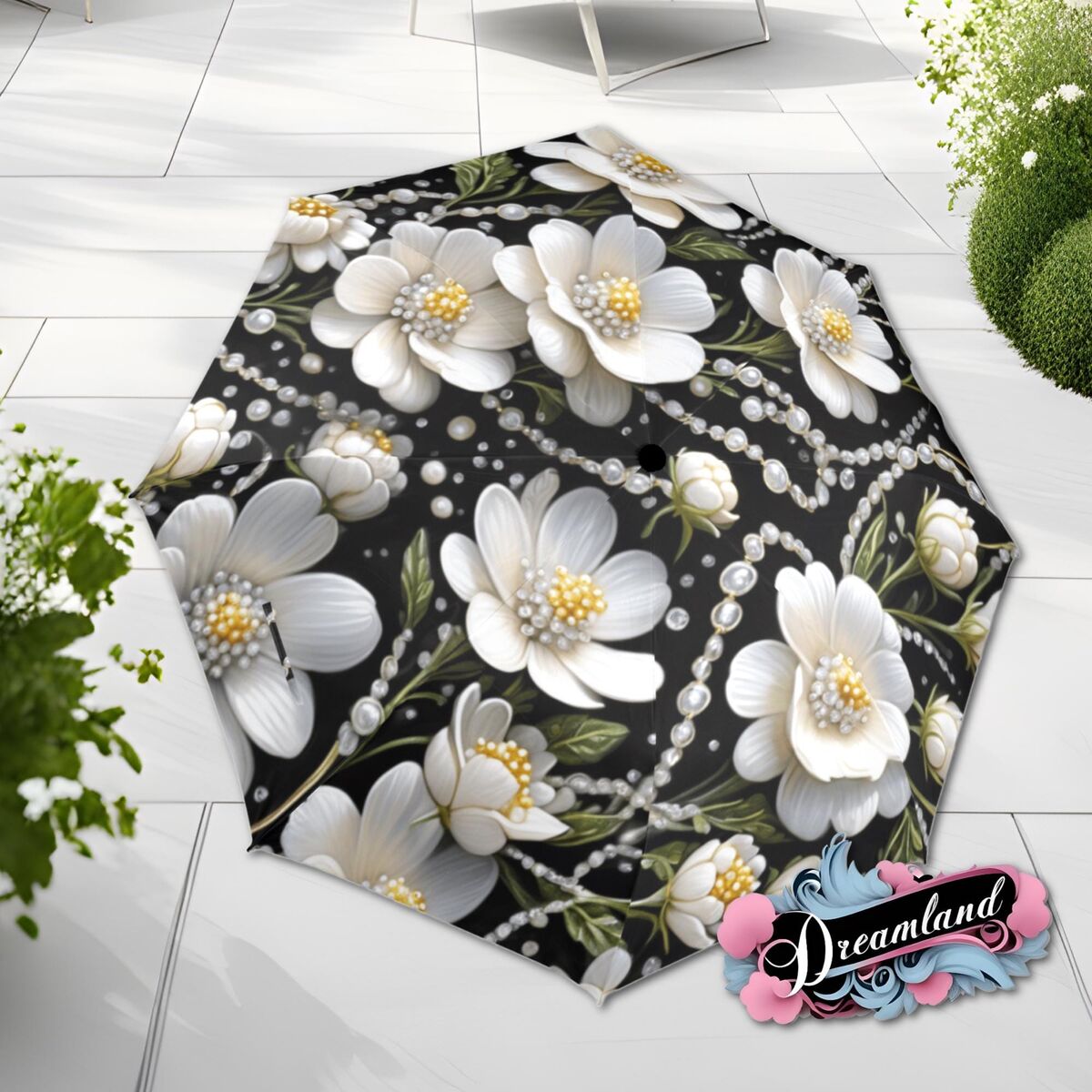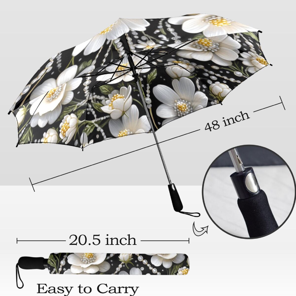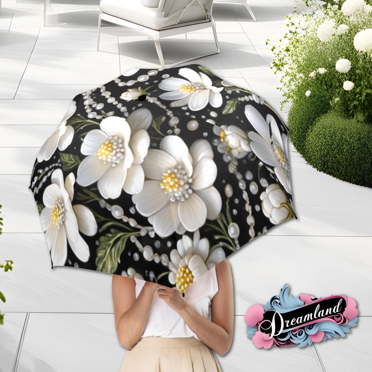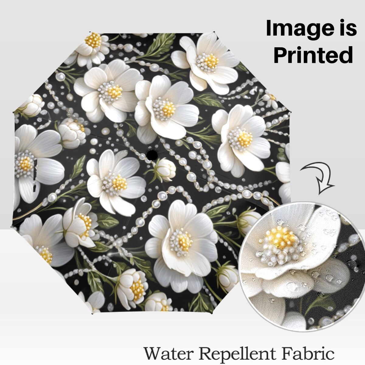Black White Umbrella Art Nouveau Printed Pearls Sakura Flowers Parasol Semi-Automatic Waterproof Foldable Umbrella