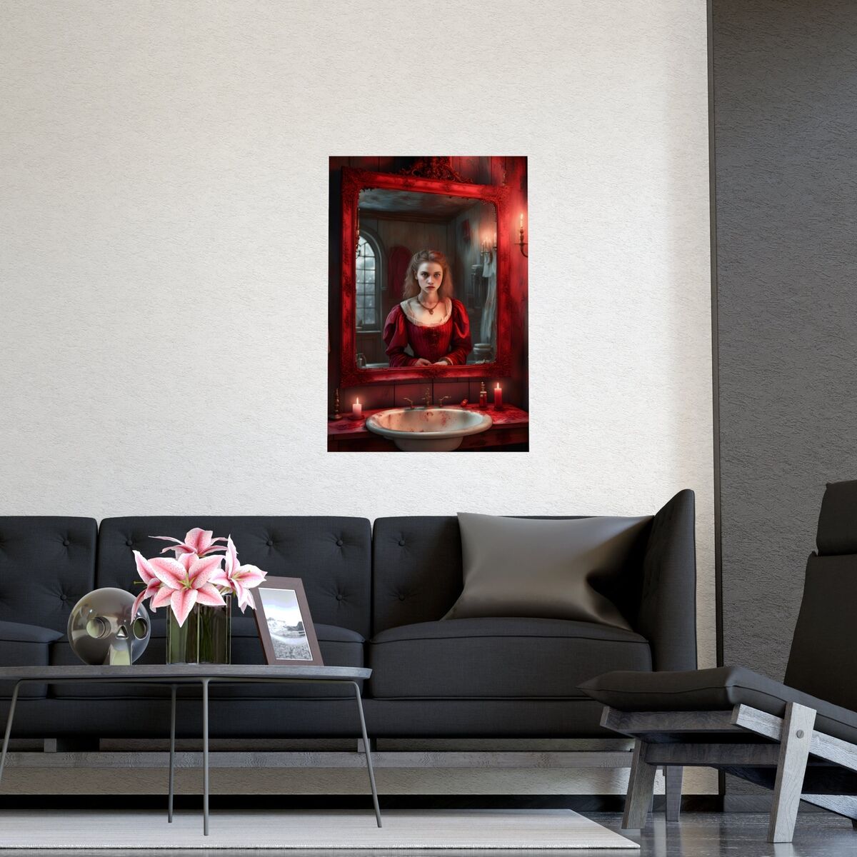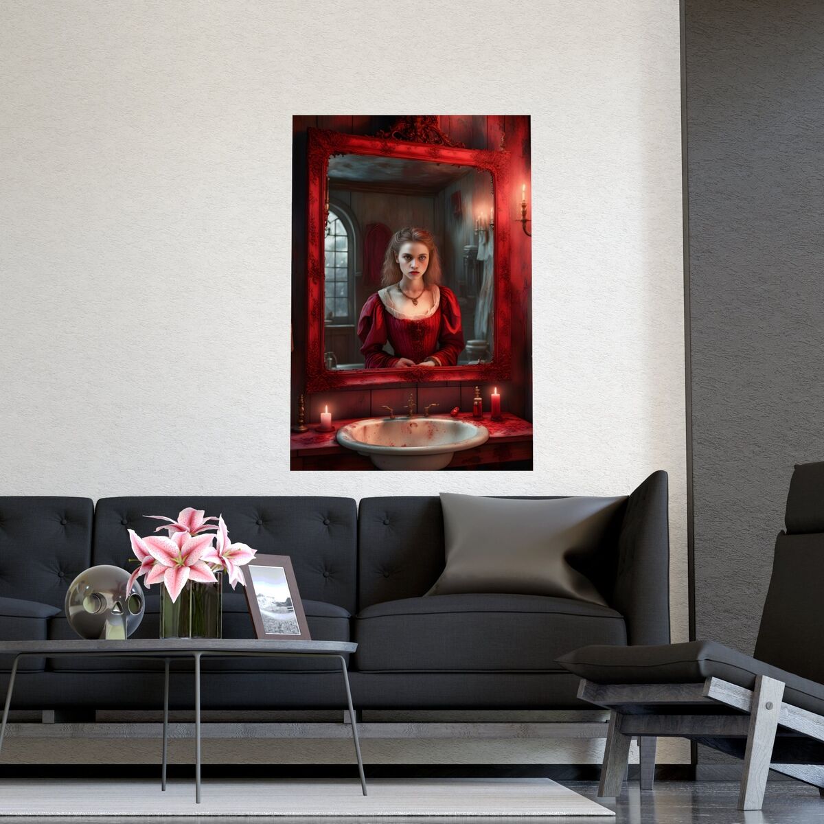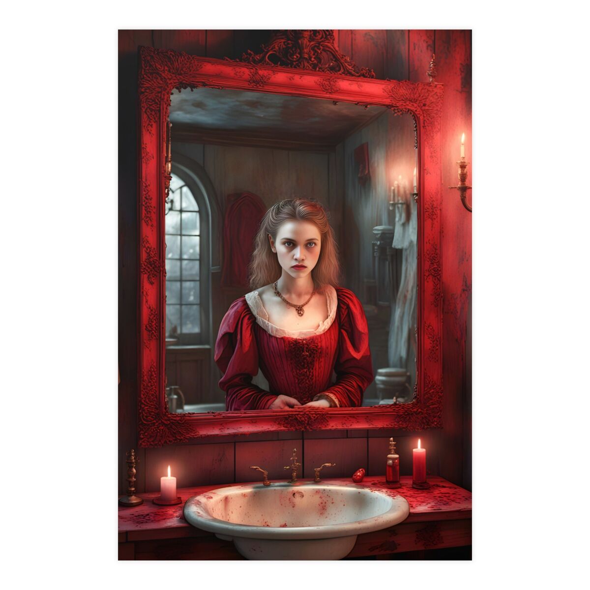 Introducing the exquisitely crafted Gothic Wall Art Poster, featuring a spine-chilling portrayal of a Creepy Bloody Mary, trapped in the mirror. This hauntingly captivating photo captures the essence of Mary, evoking an eerie ambiance that is sure to send shivers down your spine. Meticulously designed, this Horror Print showcases a perfect blend of macabre aesthetics and artistic finesse, making it an ideal addition to any Halloween-themed decor or Gothic art collection. With its intricate details and impeccable craftsmanship, this Goth Art Print Portrait is bound to captivate the imagination of horror enthusiasts and aficionados alike. Embrace the darkness and indulge in the enigmatic allure of this exceptional piece, as it effortlessly infuses an air of mystique and intrigue into any space it graces.