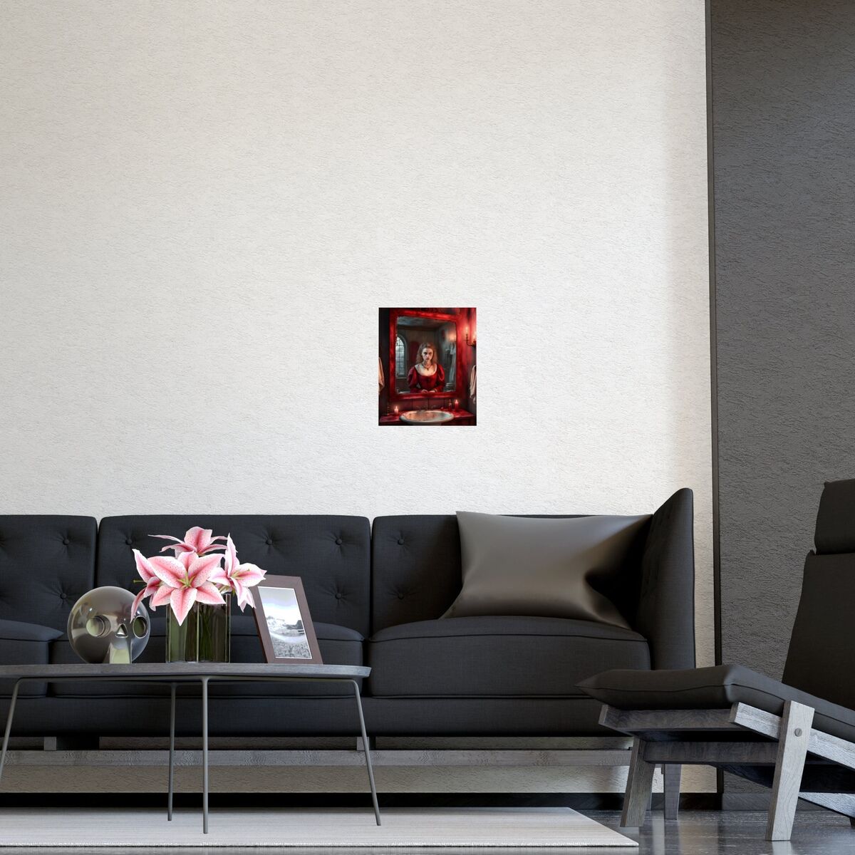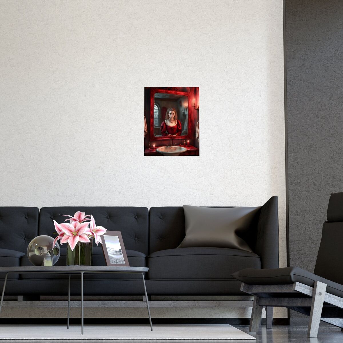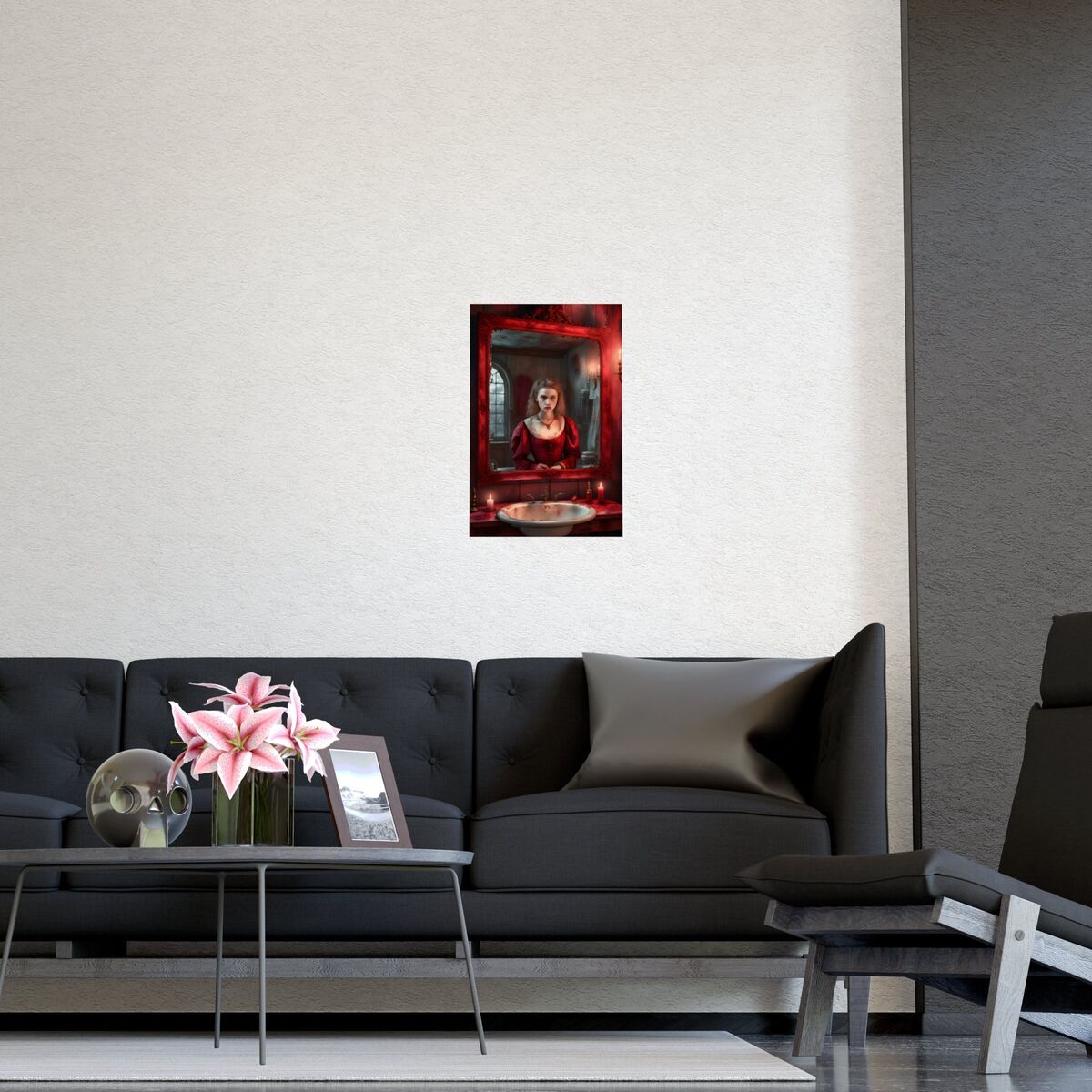 Introducing the exquisitely crafted Gothic Wall Art Poster, featuring a spine-chilling portrayal of a Creepy Bloody Mary, trapped in the mirror. This hauntingly captivating photo captures the essence of Mary, evoking an eerie ambiance that is sure to send shivers down your spine. Meticulously designed, this Horror Print showcases a perfect blend of macabre aesthetics and artistic finesse, making it an ideal addition to any Halloween-themed decor or Gothic art collection. With its intricate details and impeccable craftsmanship, this Goth Art Print Portrait is bound to captivate the imagination of horror enthusiasts and aficionados alike. Embrace the darkness and indulge in the enigmatic allure of this exceptional piece, as it effortlessly infuses an air of mystique and intrigue into any space it graces.