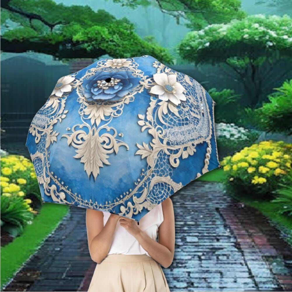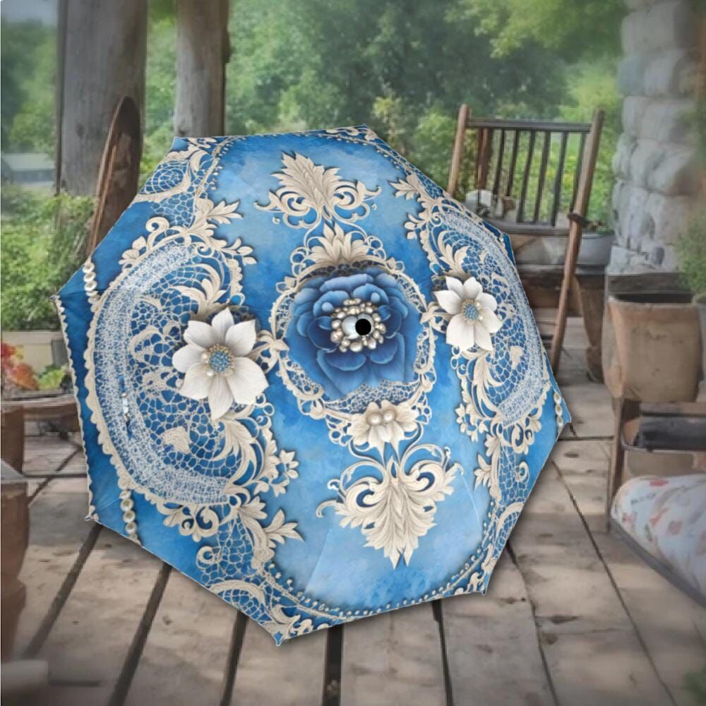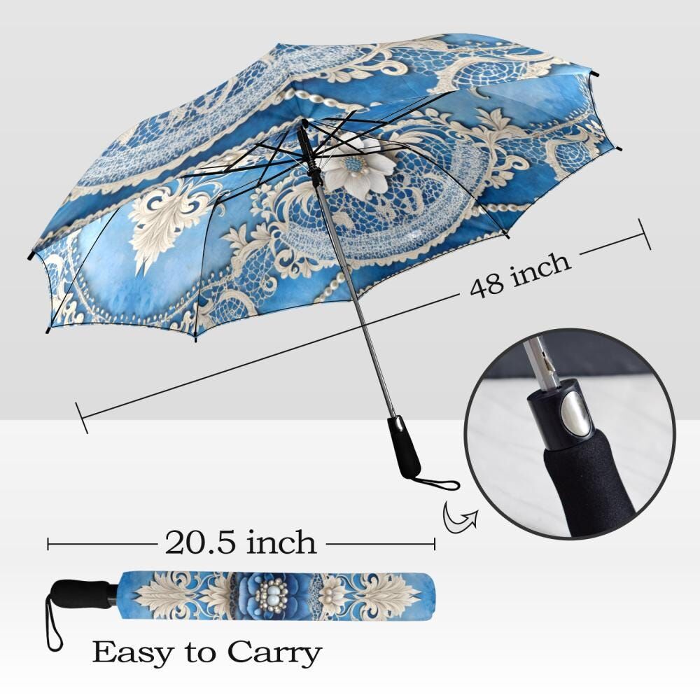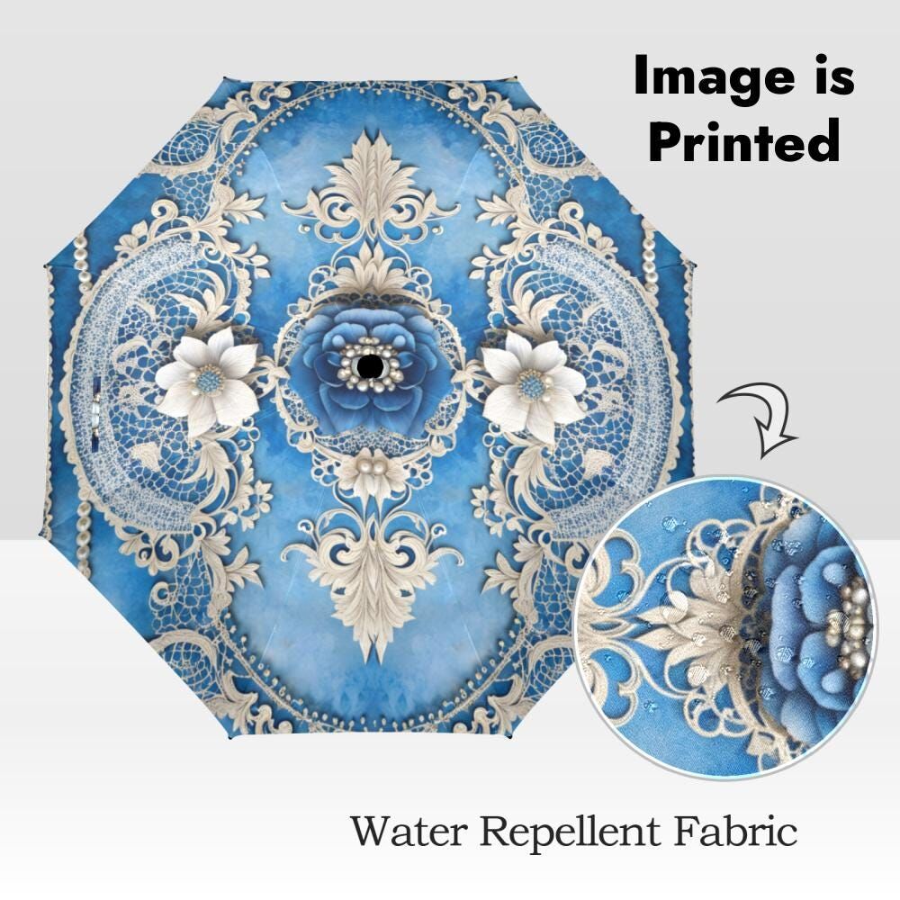 Blue Boho Umbrella Victorian Lace Printed Romantic Parasol Semi-Automatic Sun Rain Waterproof Foldable Umbrella