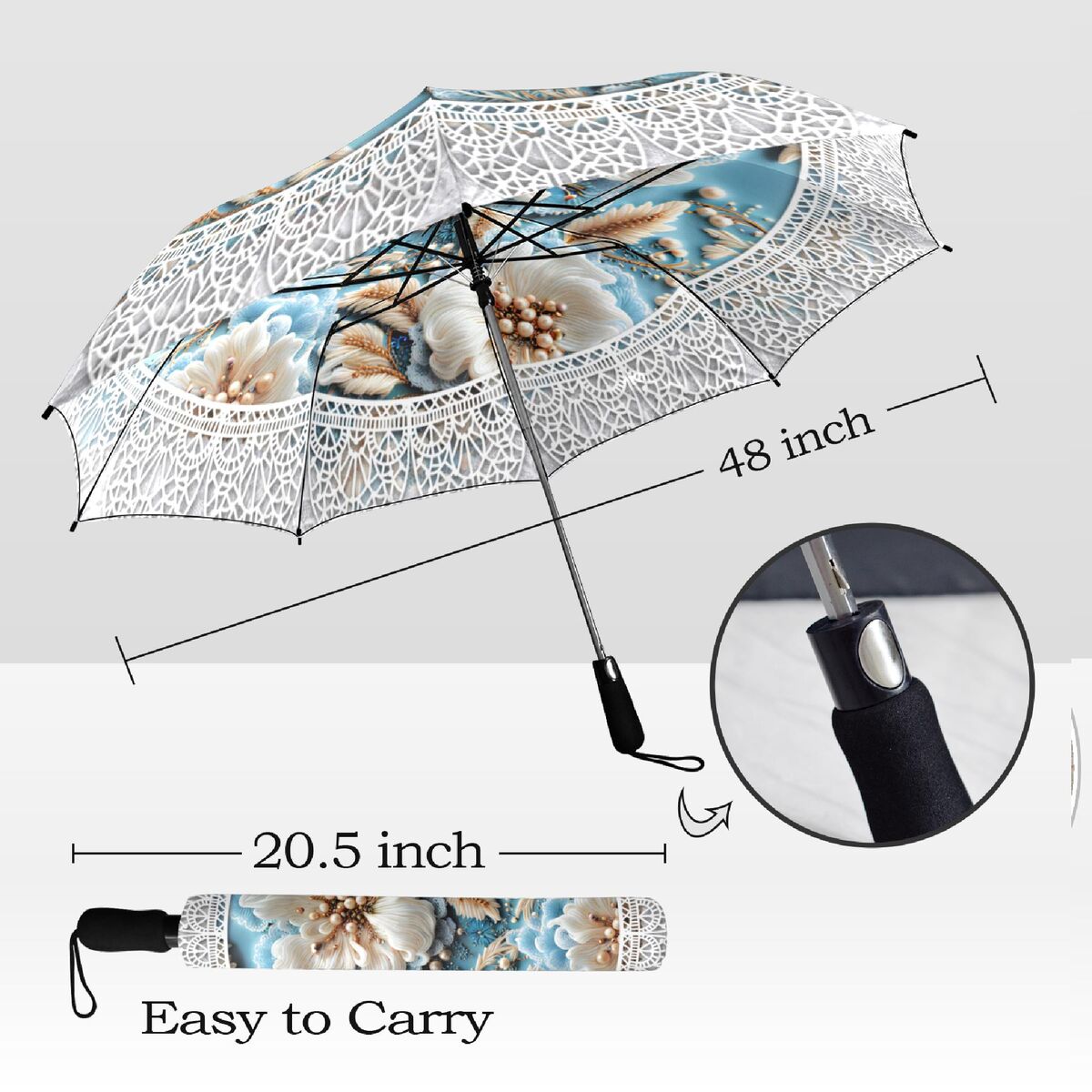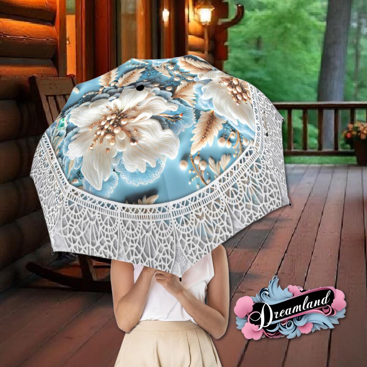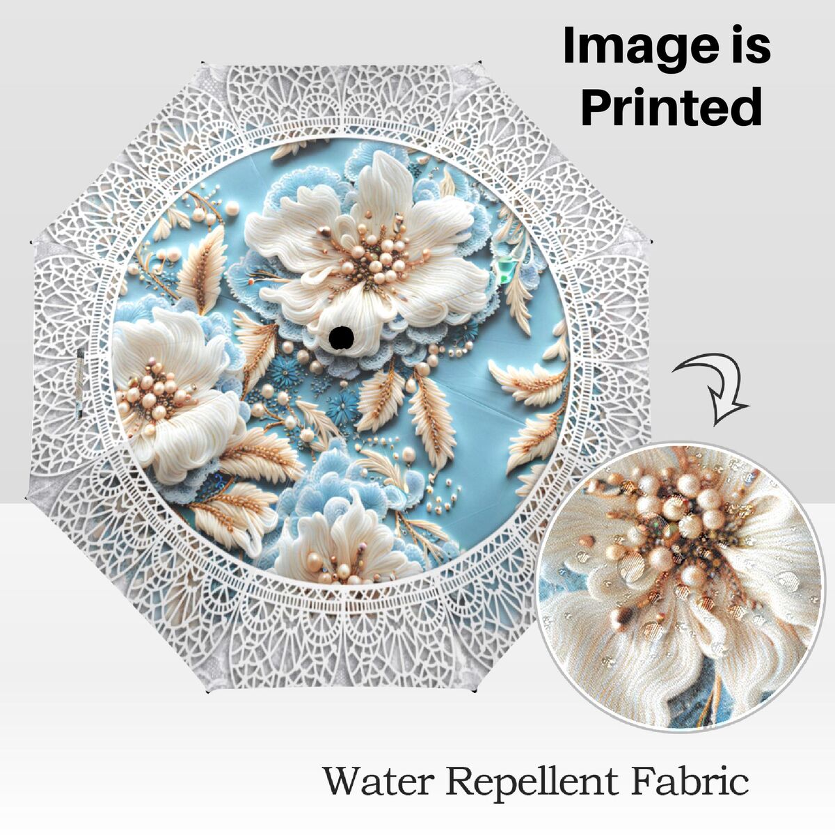 Blue Floral Unique Umbrella Art Nouveau Style Printed Faux Flower Lace Parasol Semi-Automatic Waterproof Foldable Umbrella
