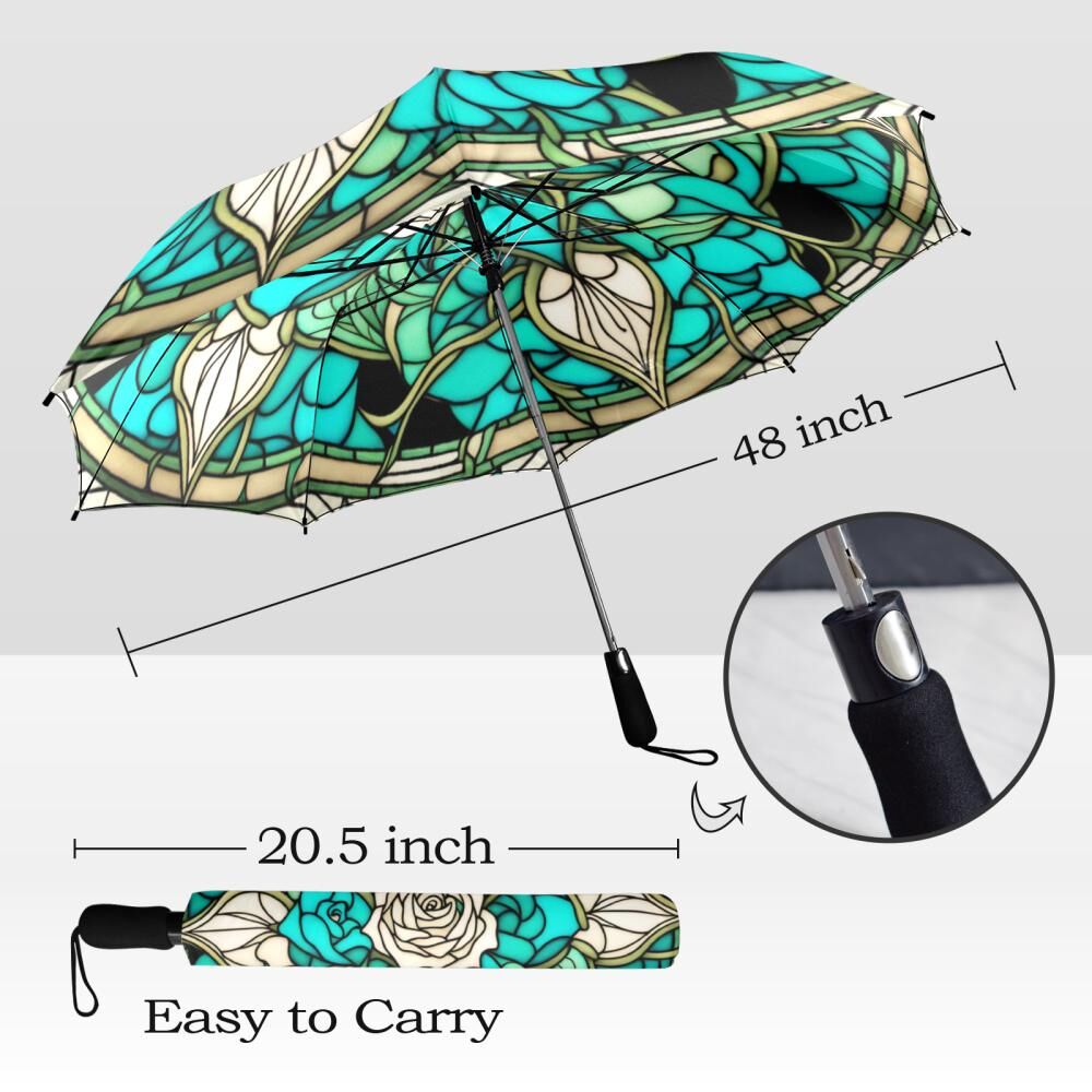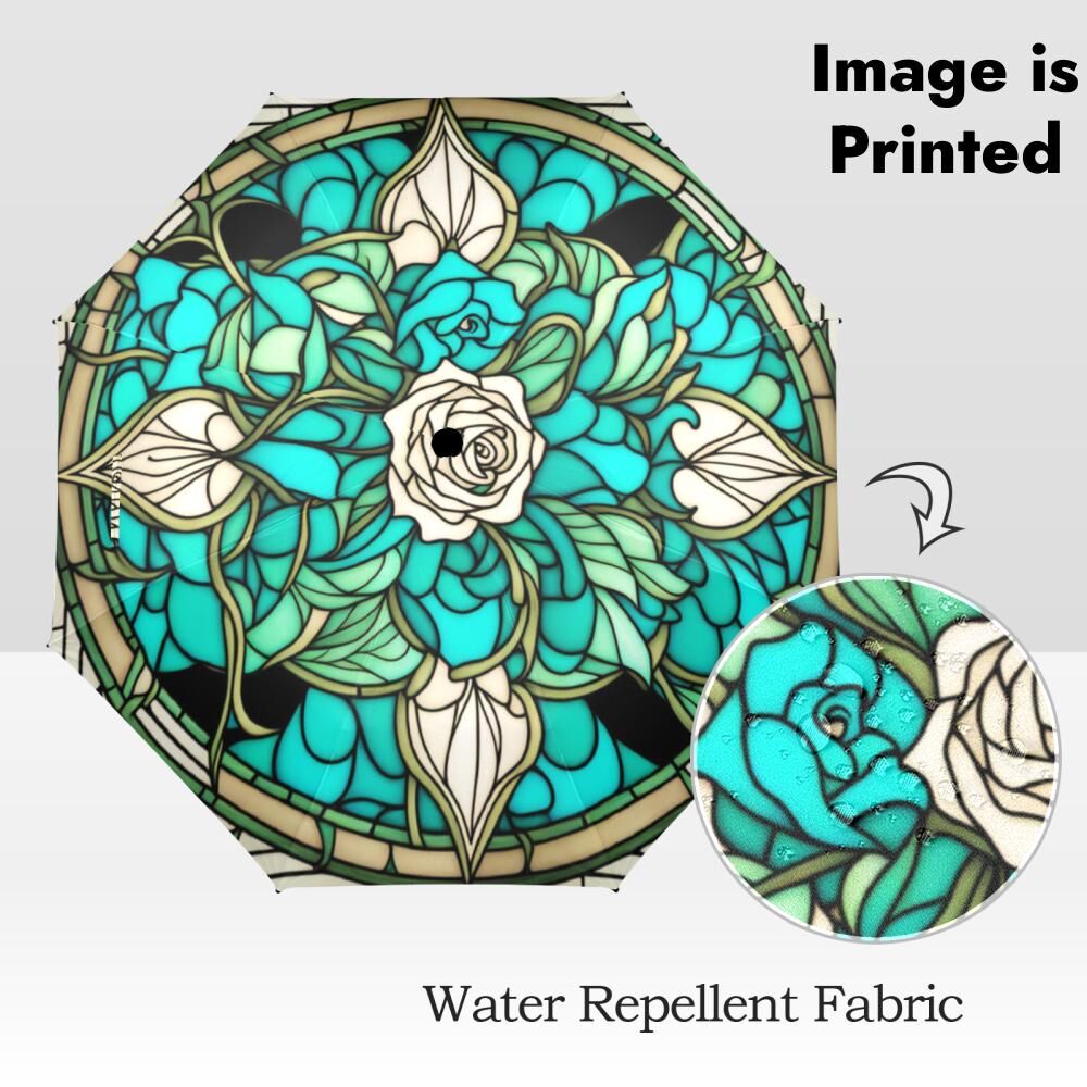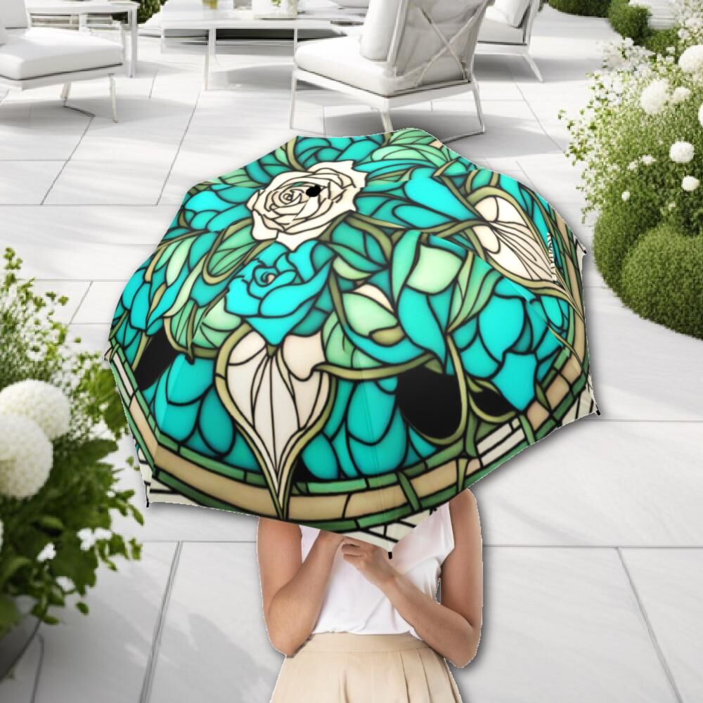 Blue Green Rose Umbrella Stained Glass Umbrella Romantic Flowers Parasol Semi-Automatic Floral Sun Rain Waterproof Foldable Umbrella