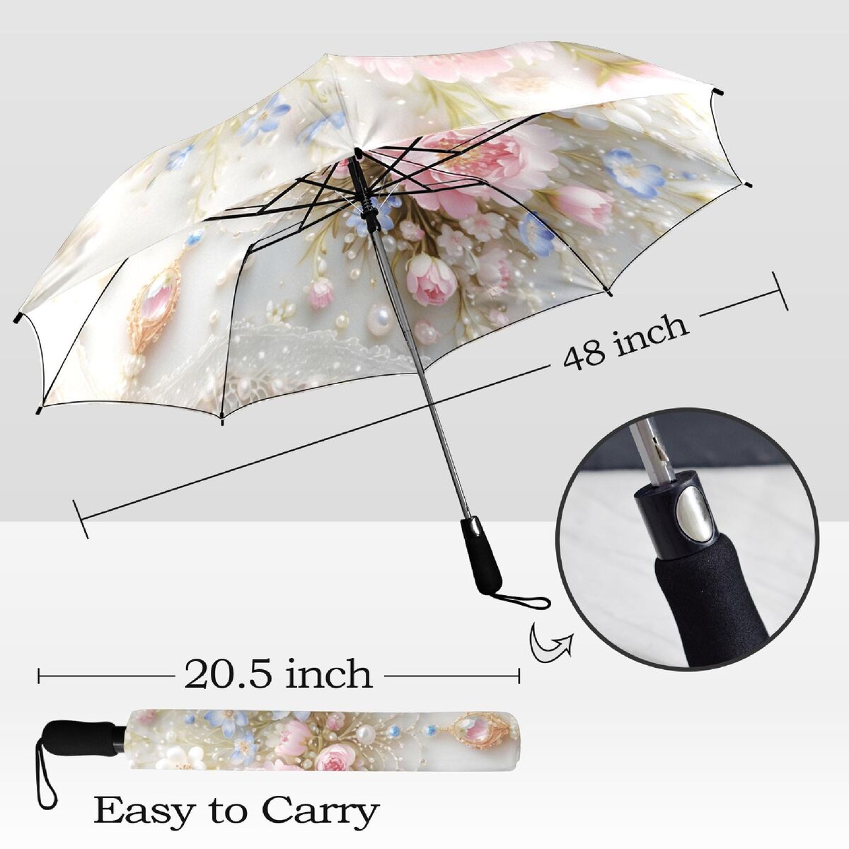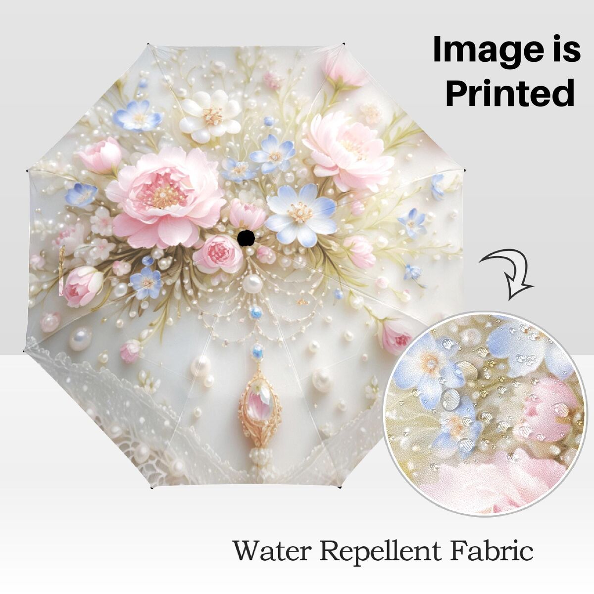 Blue Pink Floral Unique Umbrella Art Nouveau Style Printed Faux Flowers Beads Parasol Semi-Automatic Waterproof Foldable Umbrella