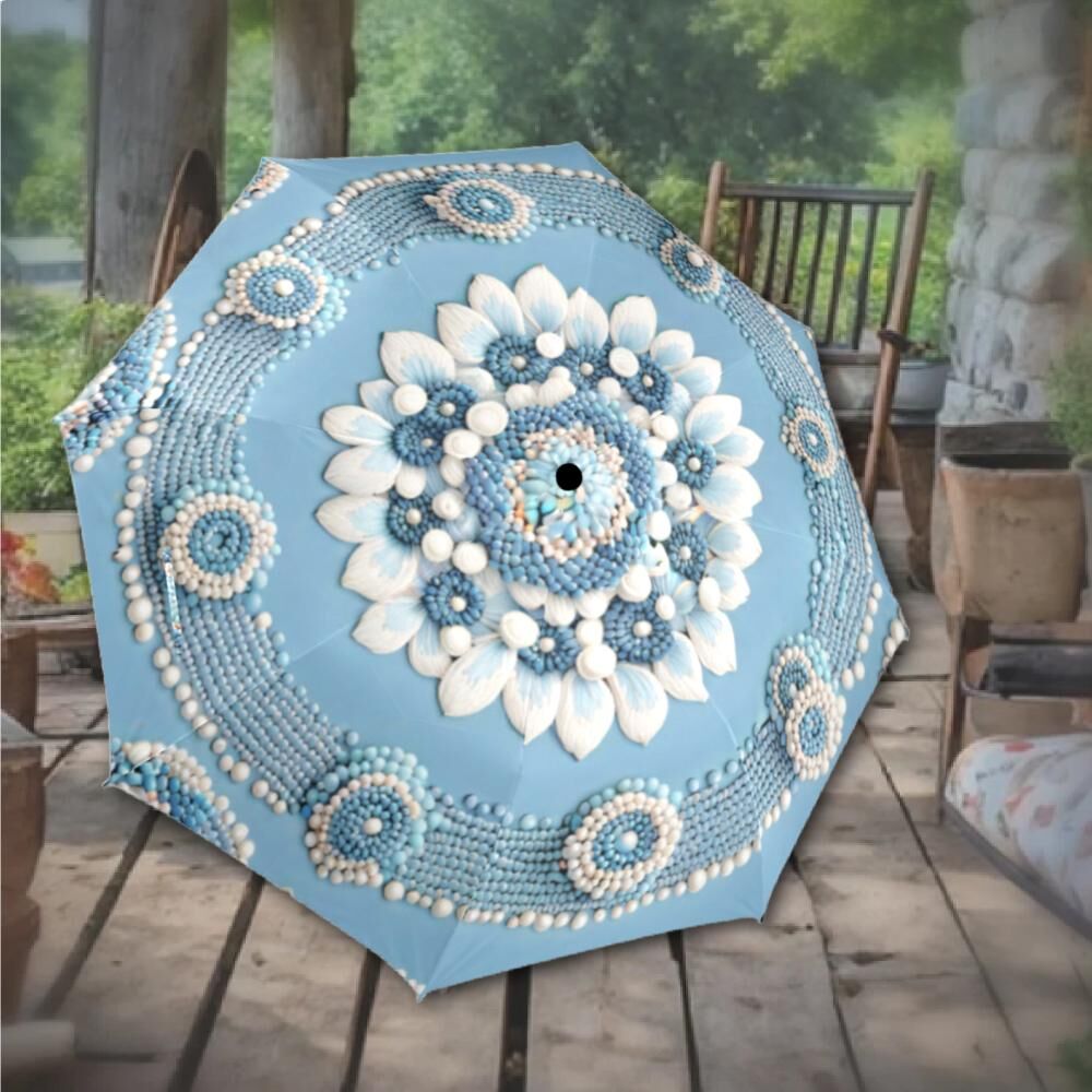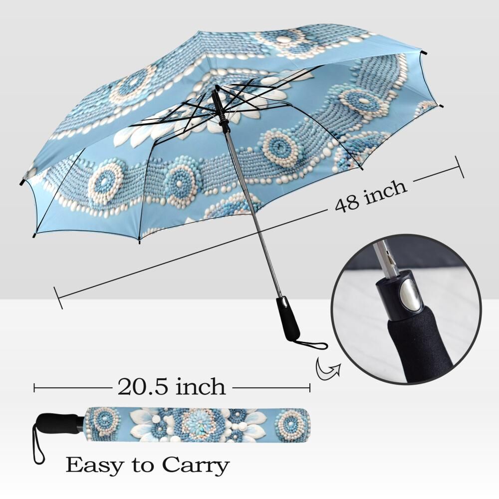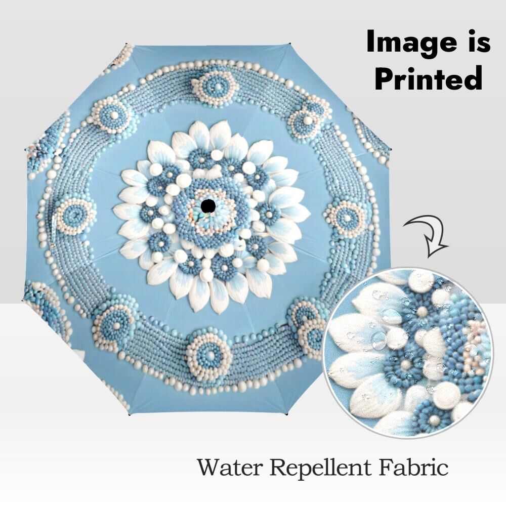 Blue Umbrella Victorian Inspired Faux Beaded Parasol Semi-Automatic Waterproof Foldable Umbrella