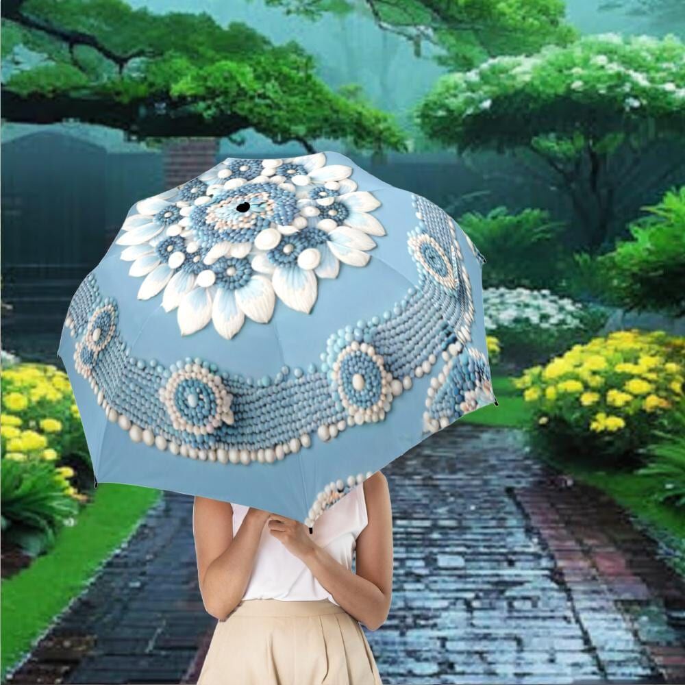 Blue Silver Floral Unique Umbrella Art Nouveau Style Printed Faux Flower Lace Parasol Semi-Automatic Waterproof Foldable Umbrella