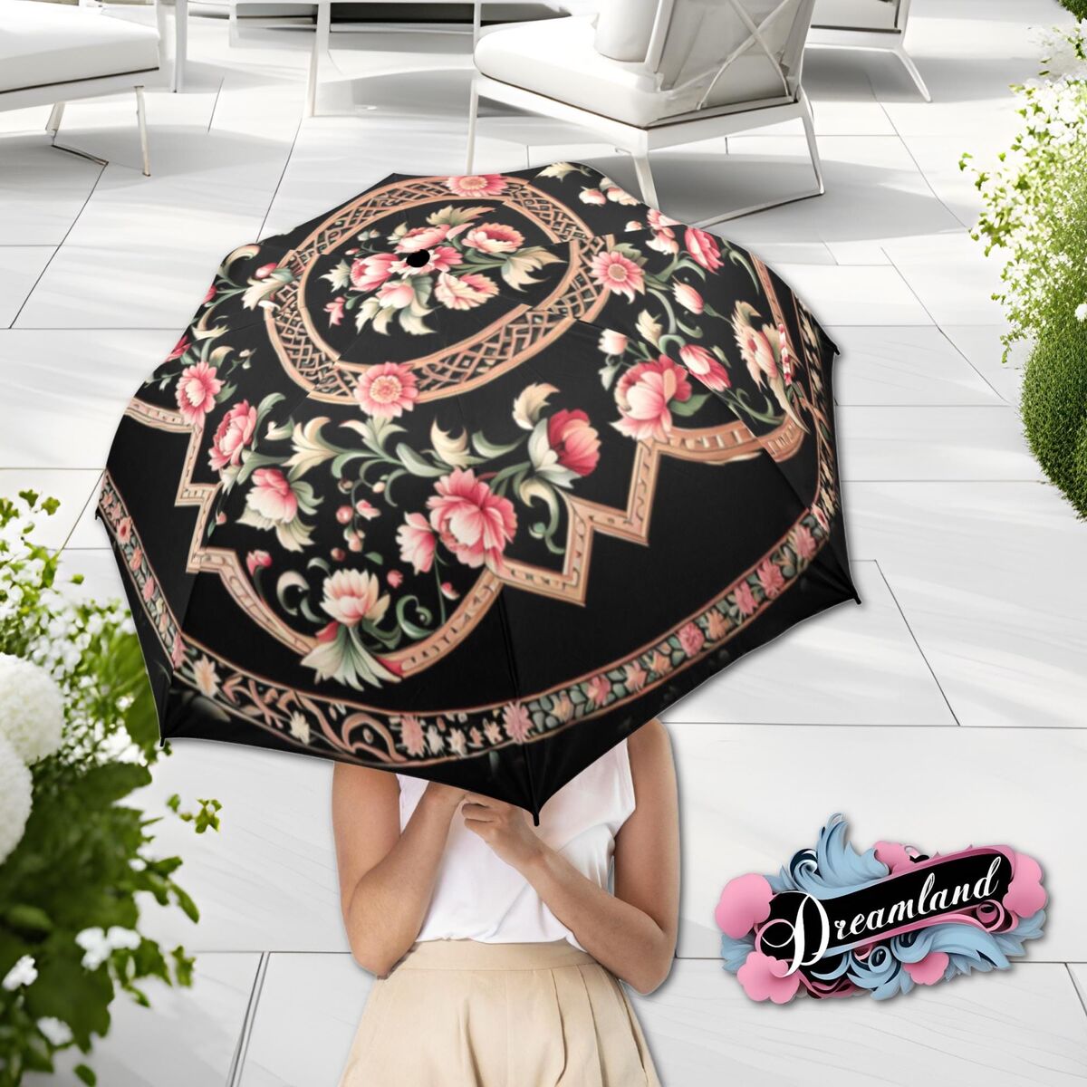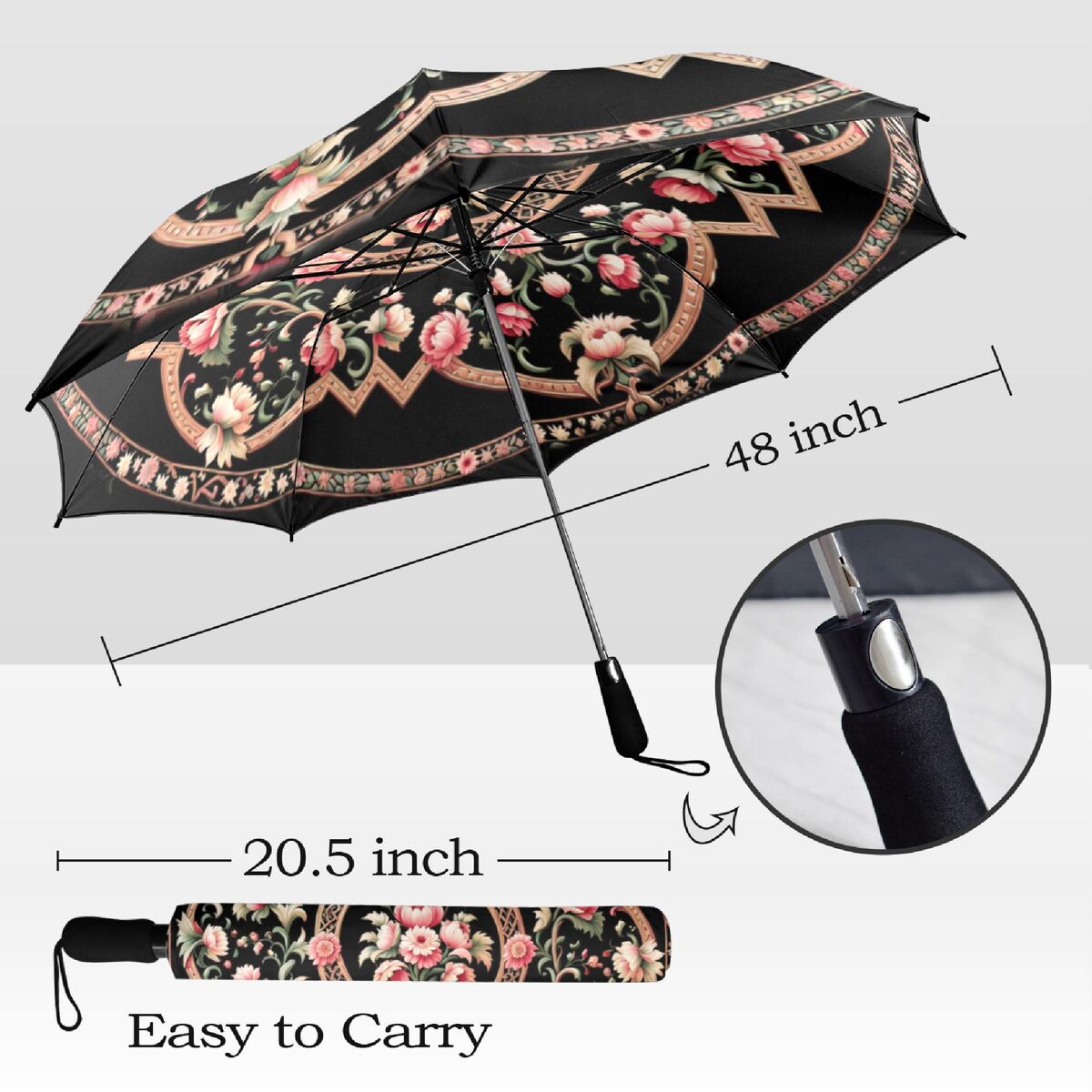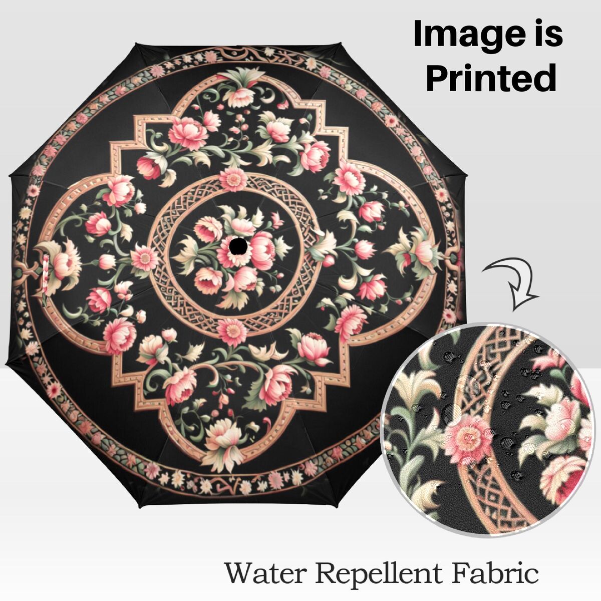 Boho Black Pink Roses Umbrella Art Nouveau Printed Victorian Style Parasol Semi-Automatic Waterproof Foldable Umbrella
