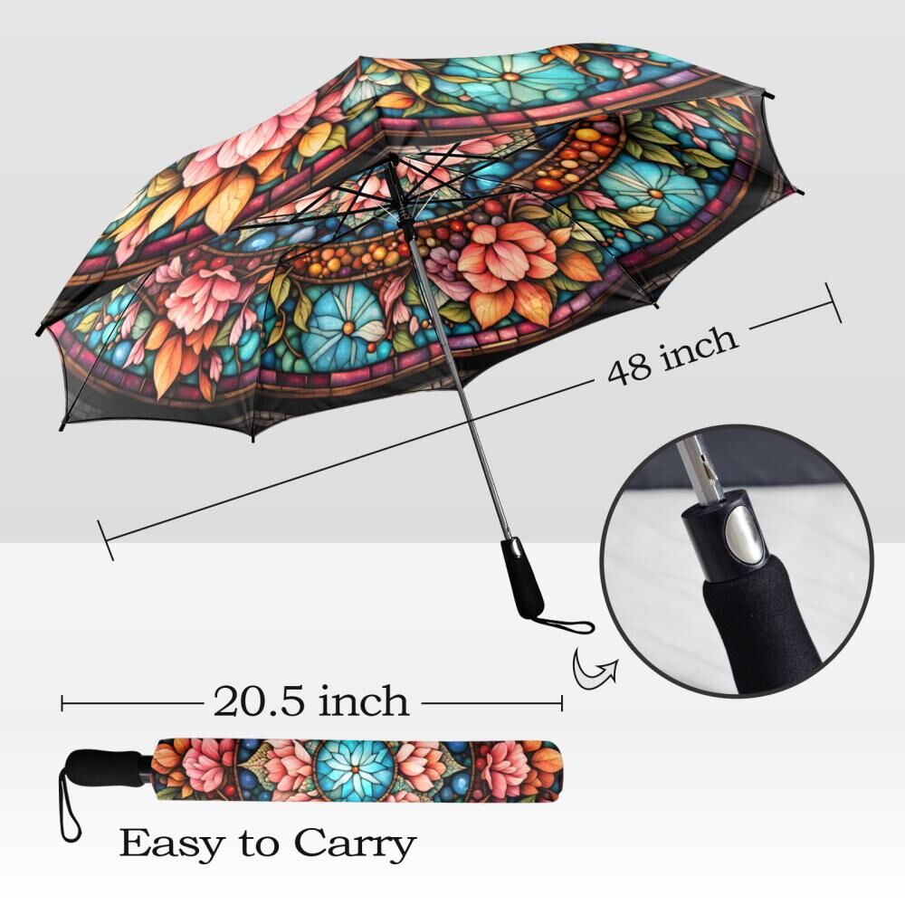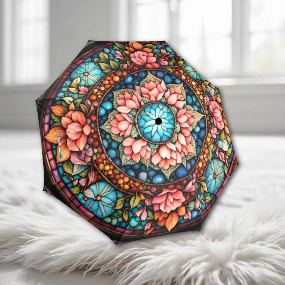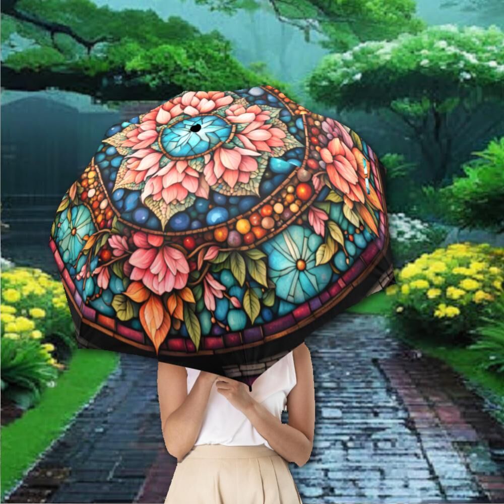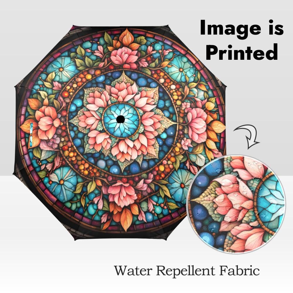 Boho Umbrella Pink Stained Glass Art Nouveau Flower Parasol Semi-Automatic Waterproof Foldable Umbrella