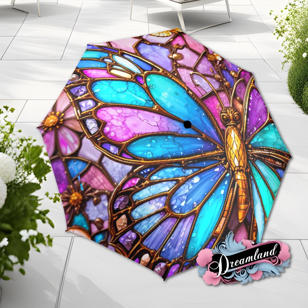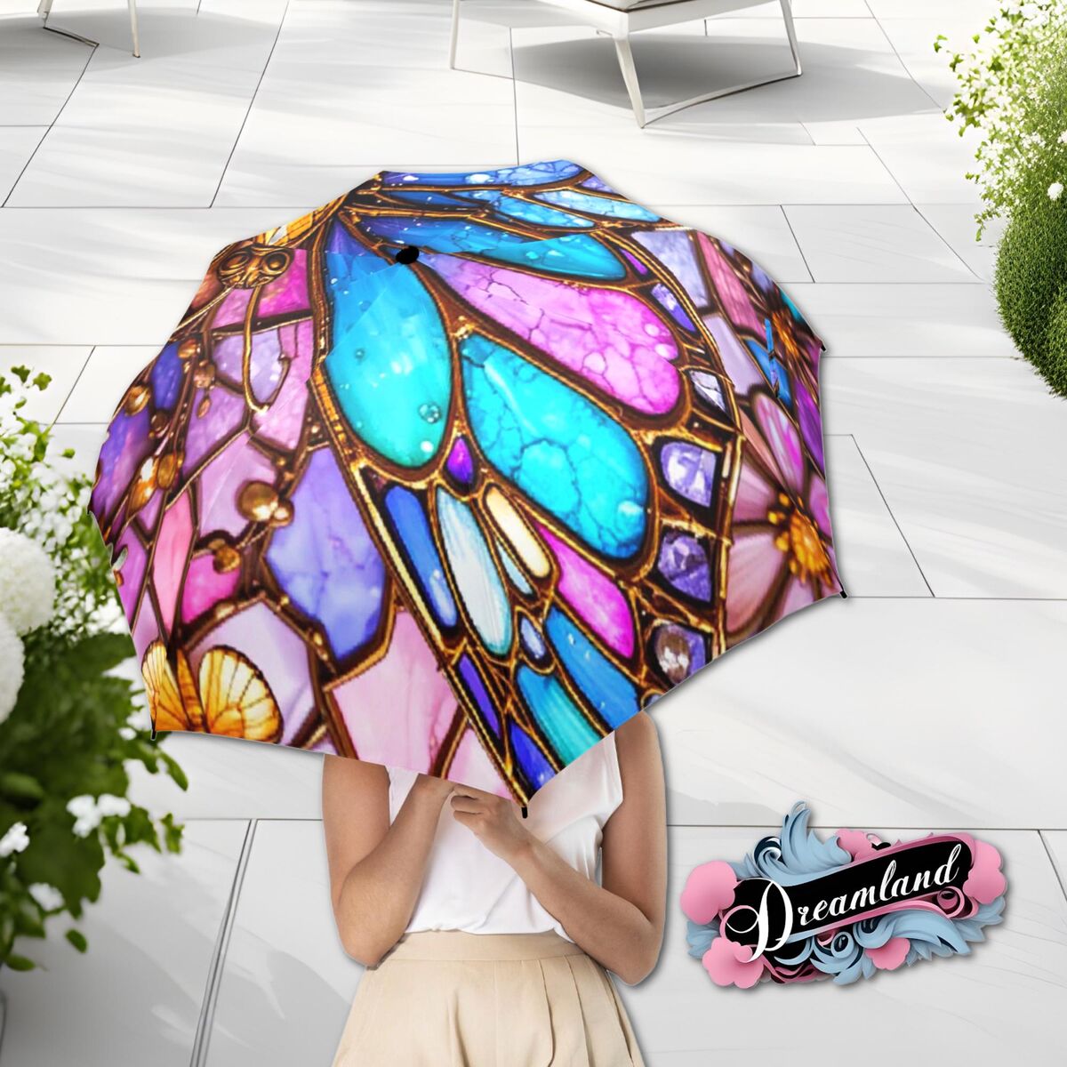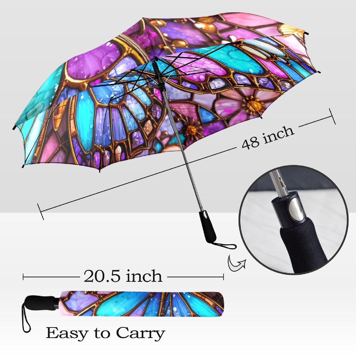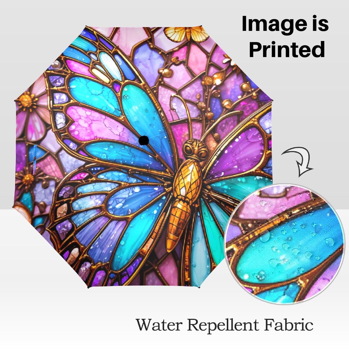 Butterfly Umbrella Romantic Purple Blue Gold Art Nouveau Faux Stained Glass Parasol Semi-Automatic Waterproof Foldable Umbrella