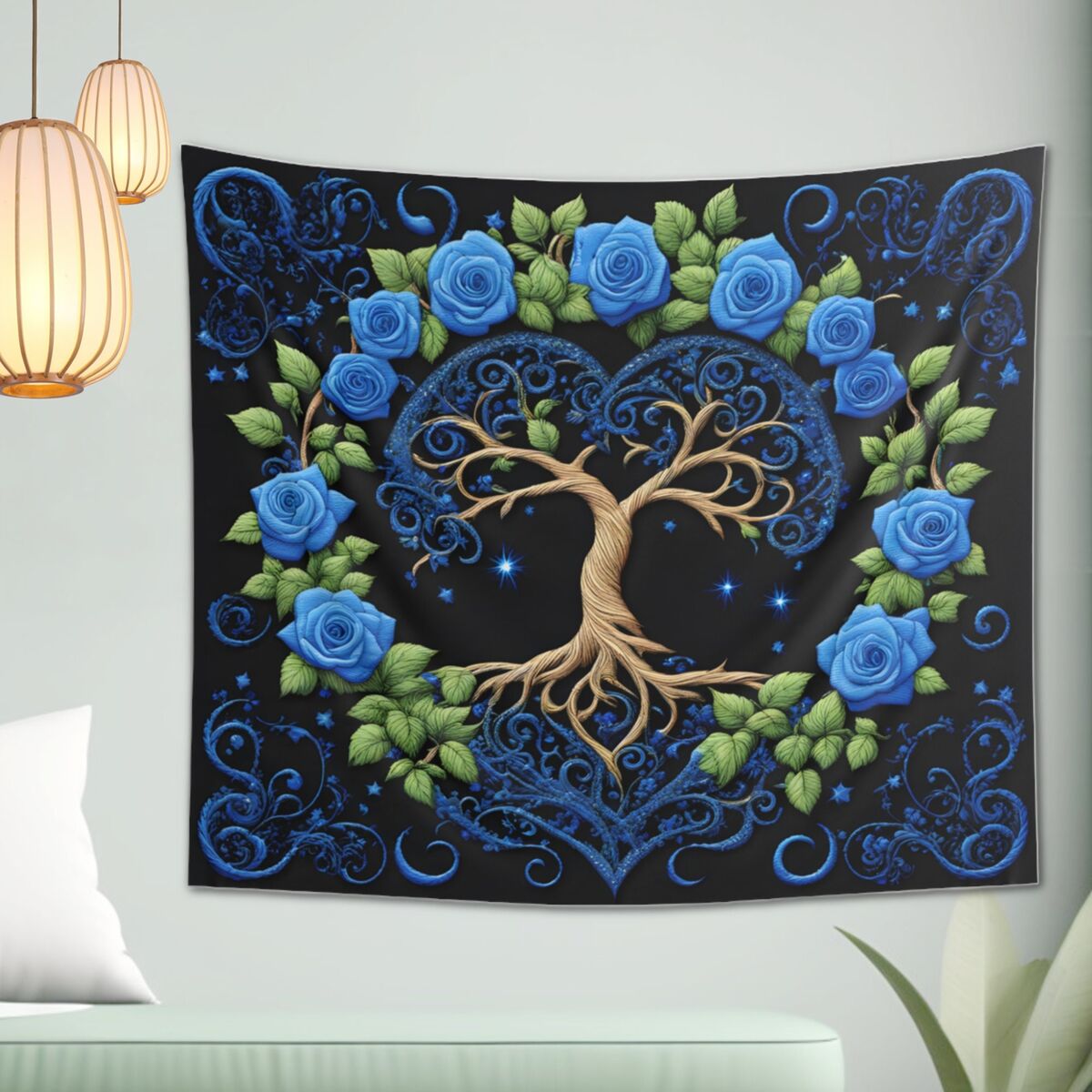 Enhance the ambiance of your living space with our Celestial Tapestry Boho Indoor Wall Hanging. Featuring a captivating Tree of Life design under a mystical witchy moon and stars in shades of blue, this wall decor adds a touch of magic to any room.