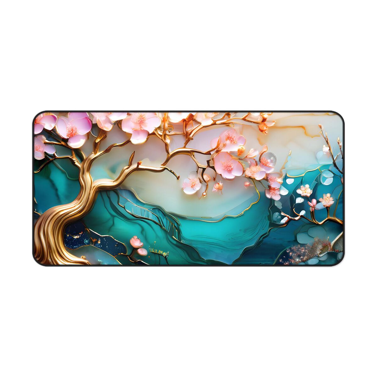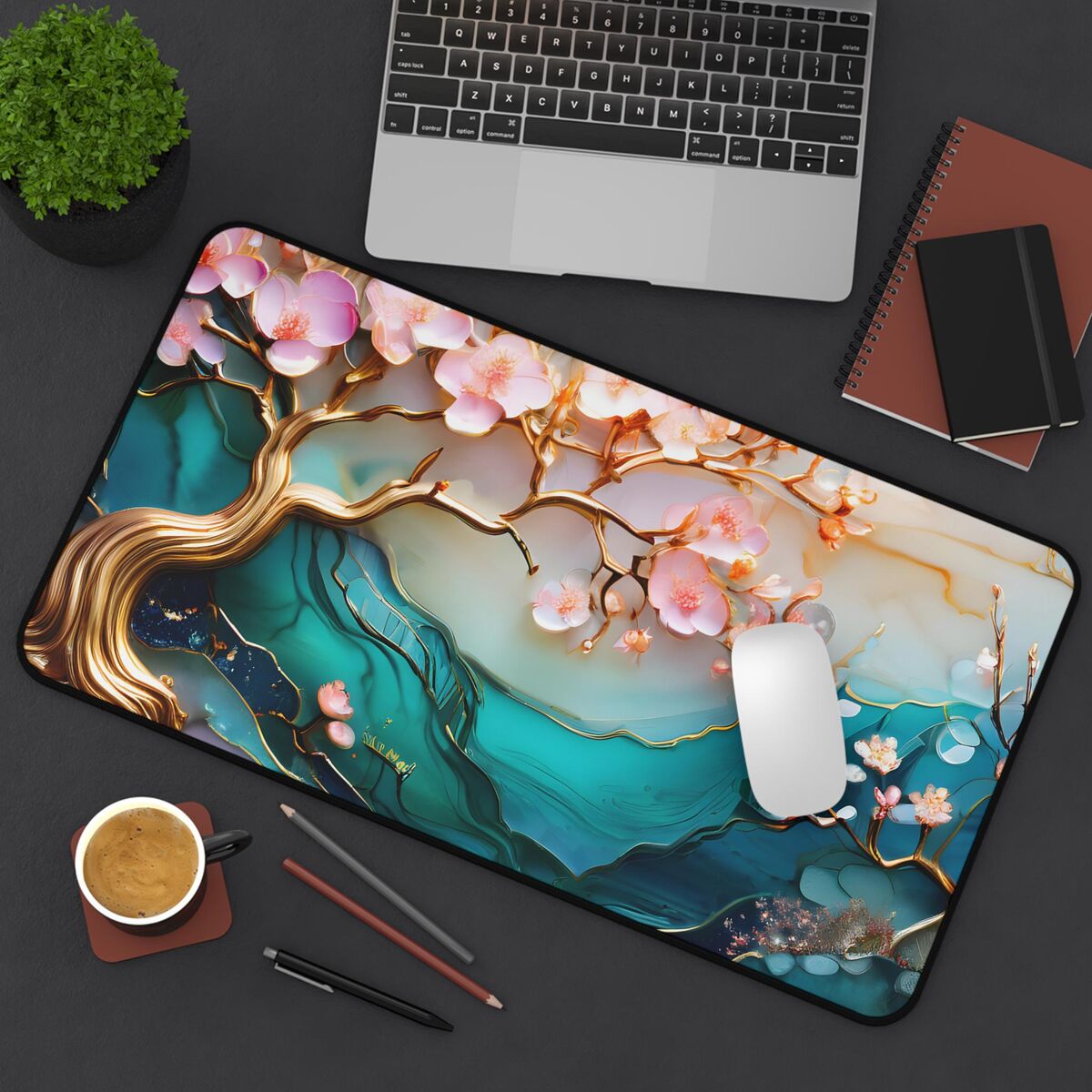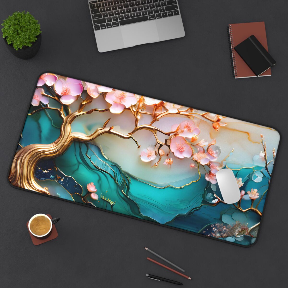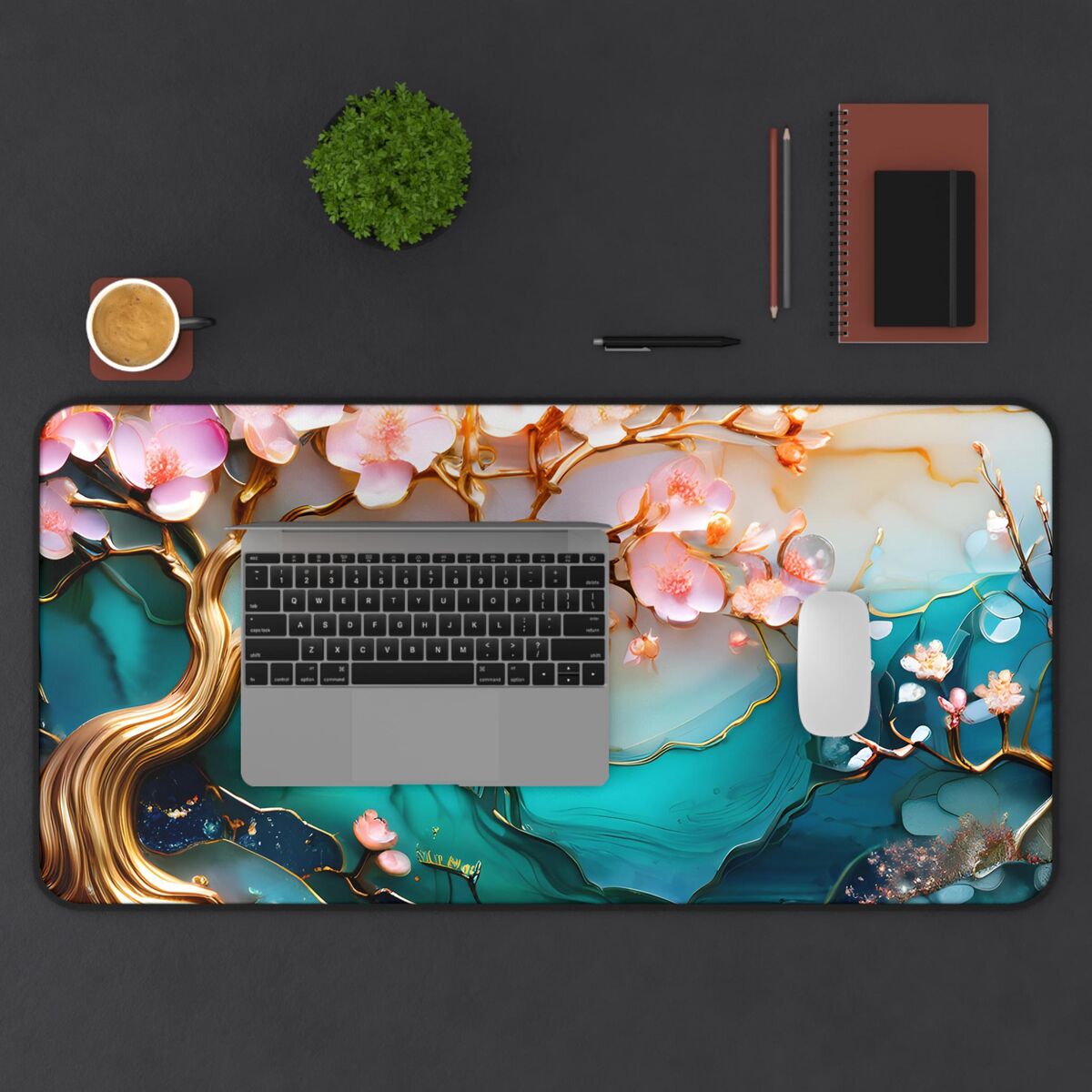 Cherry Blossom Desk Mat Mousepad Cute Aesthetic Sakura Asian Japanese Inspired Gold Pink Floral Office Decor Large Gaming Mat Pad