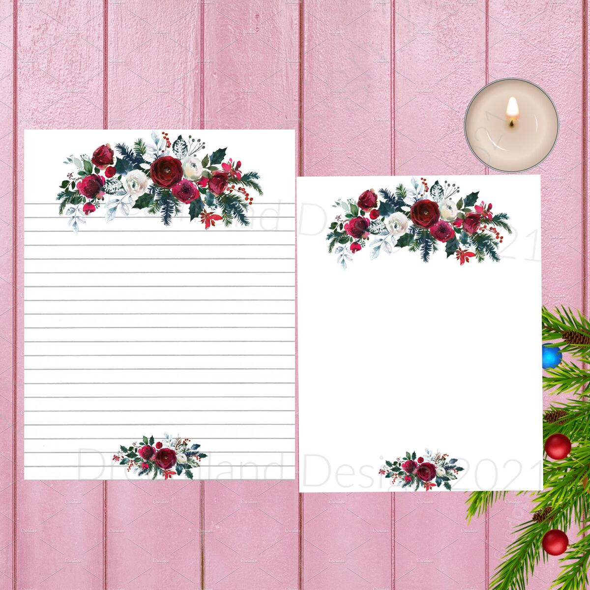 Christmas Stationary Printable Blank Digital Writing Paper Red White Holiday Floral Lined Note Book Flower Watercolor Roses Paper