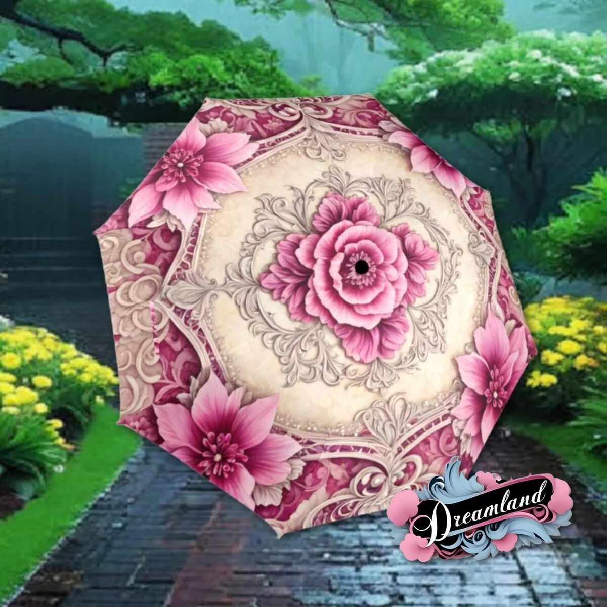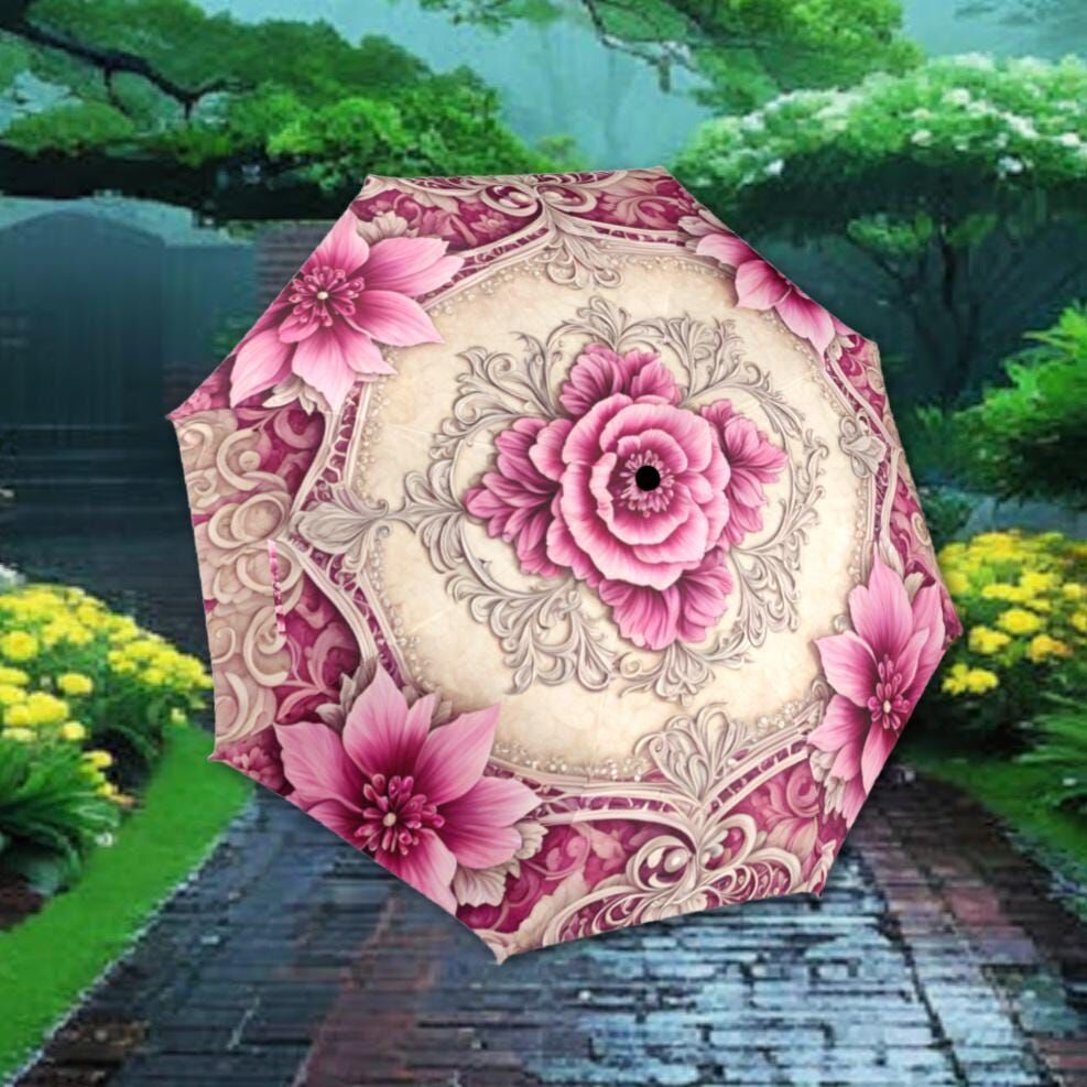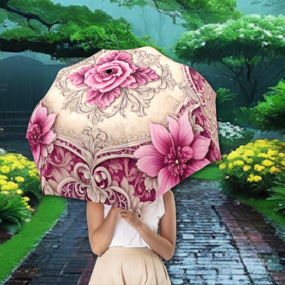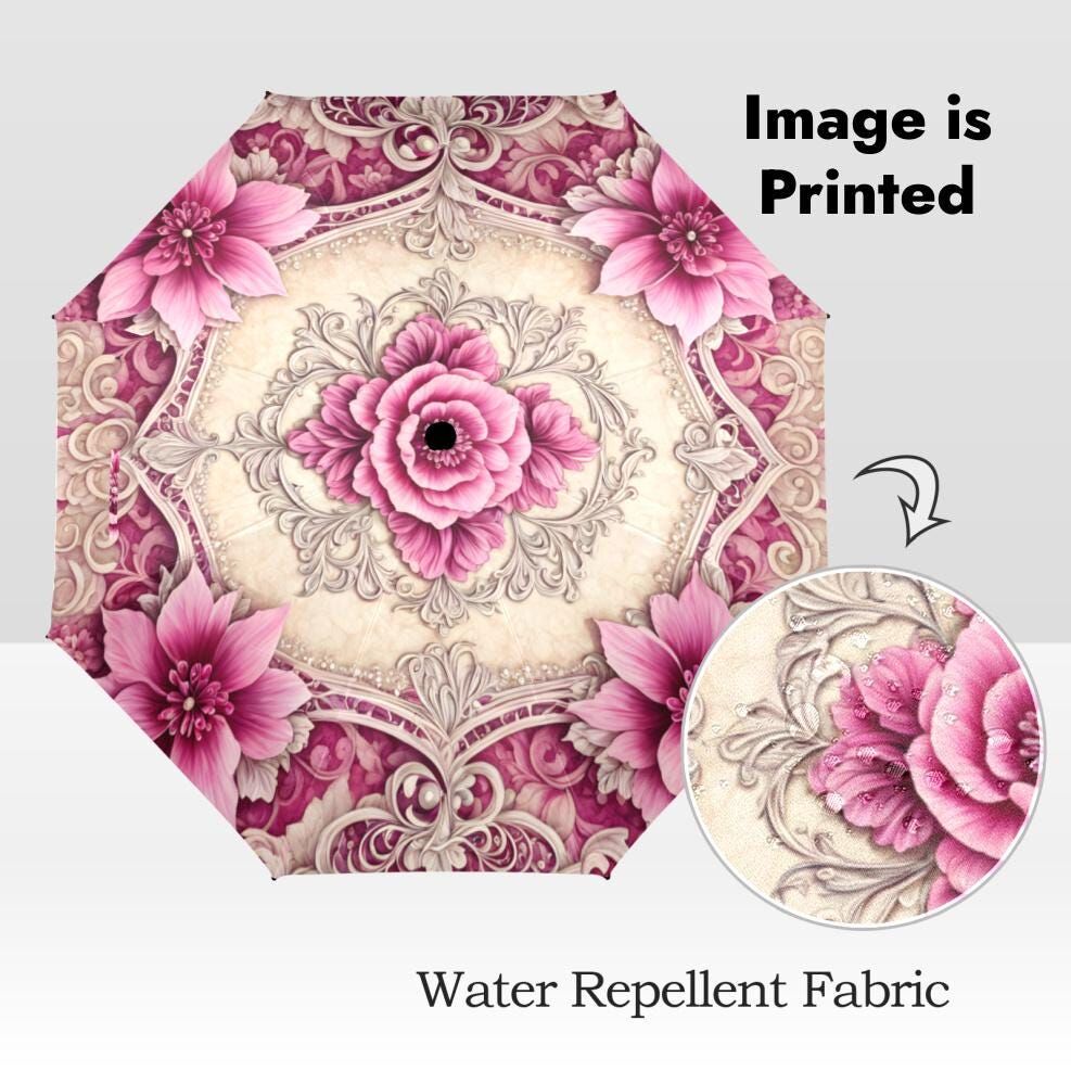 Cream Pink Romantic Umbrella Victorian Inspired Boho Flower Parasol Semi-Automatic Waterproof Foldable Umbrella