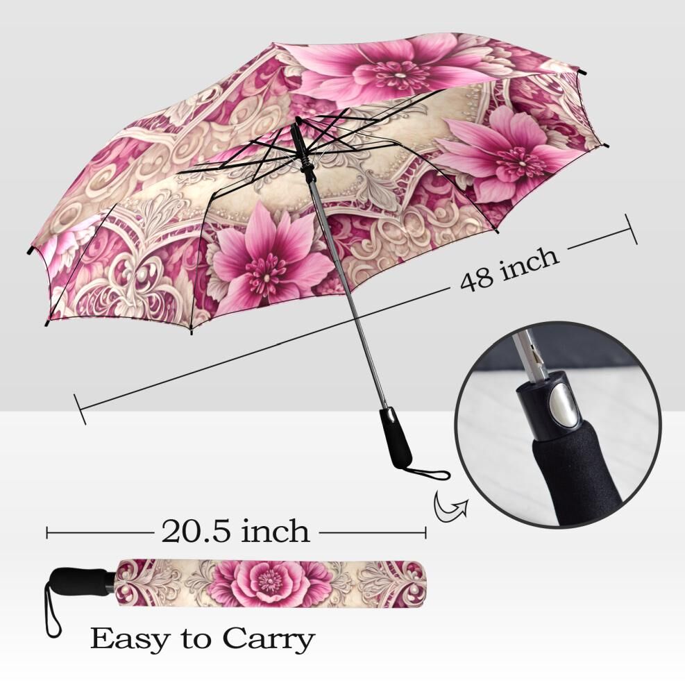 Pink Lotus Flower Umbrella Pink Art Nouveau Printed Flowers Floral Parasol Semi-Automatic Waterproof Foldable Umbrella