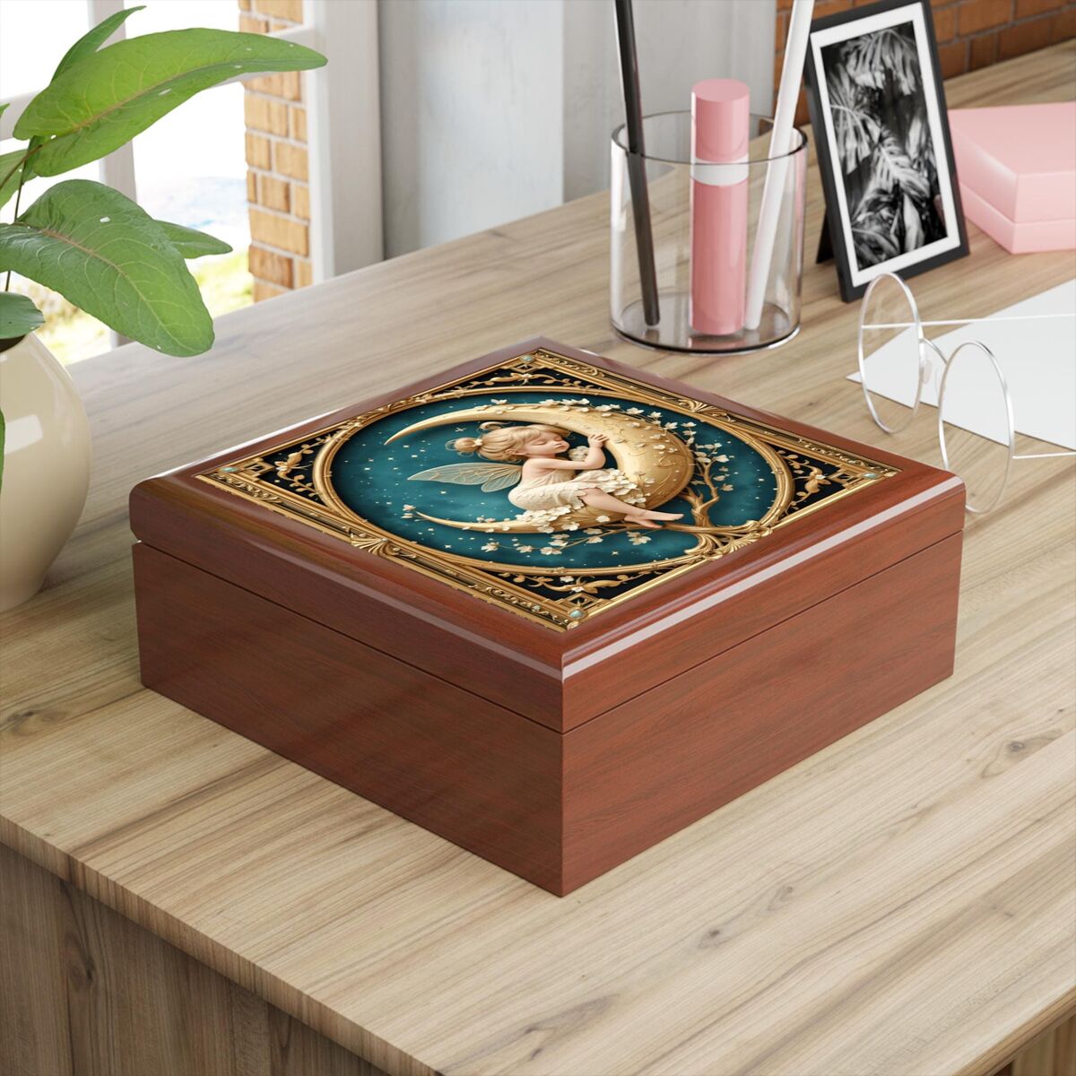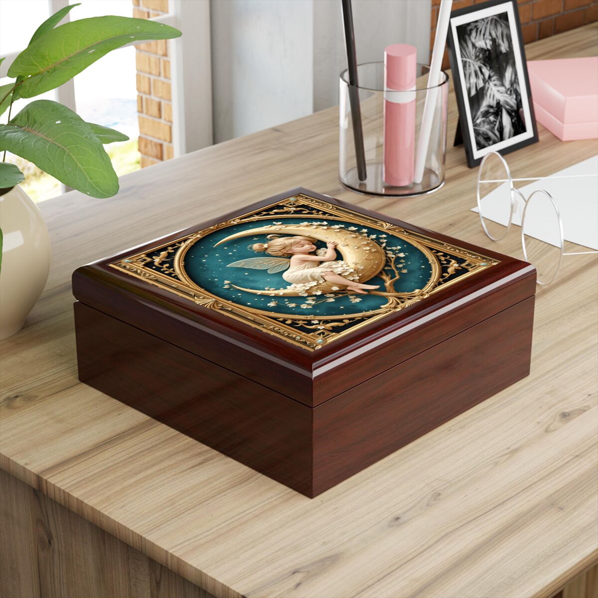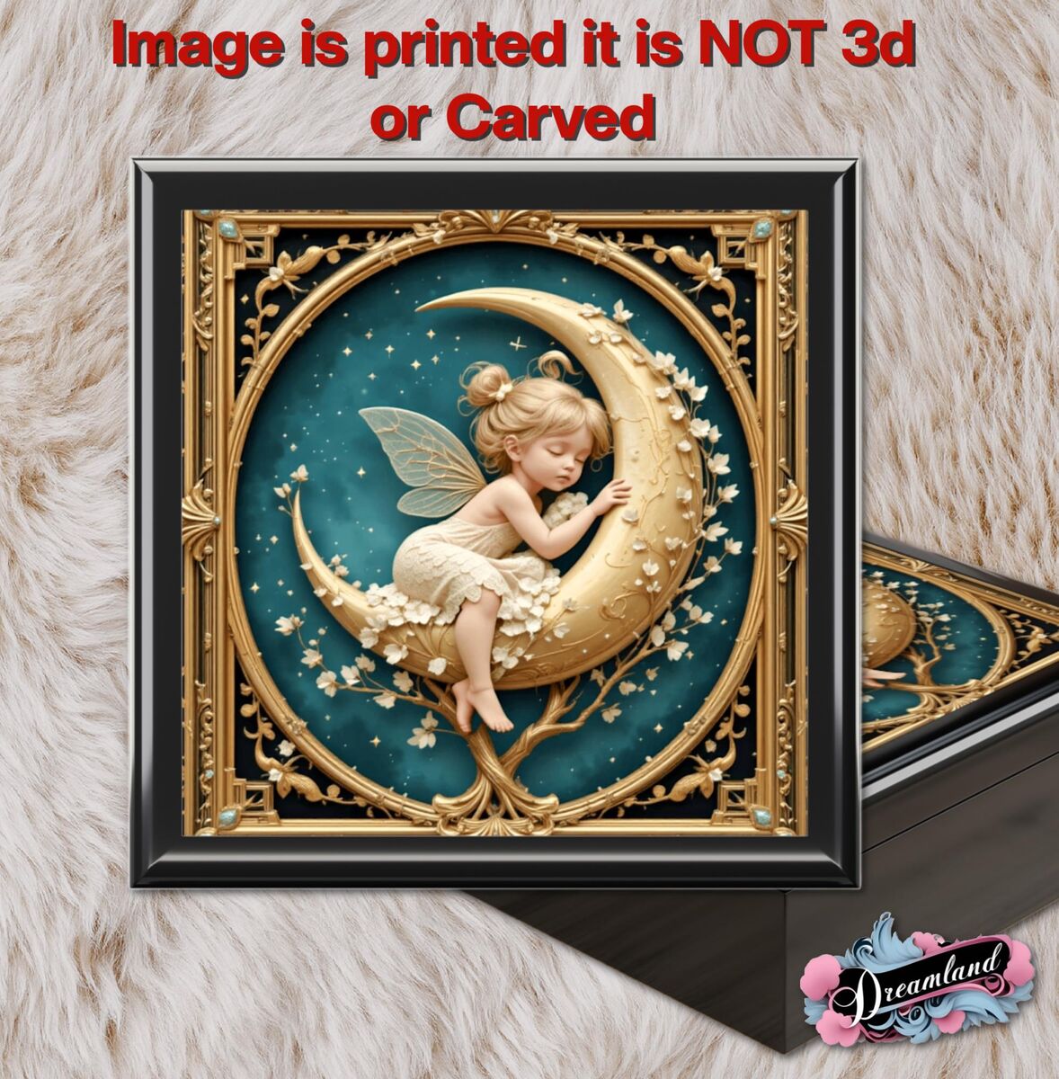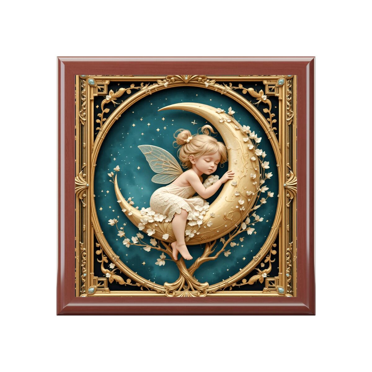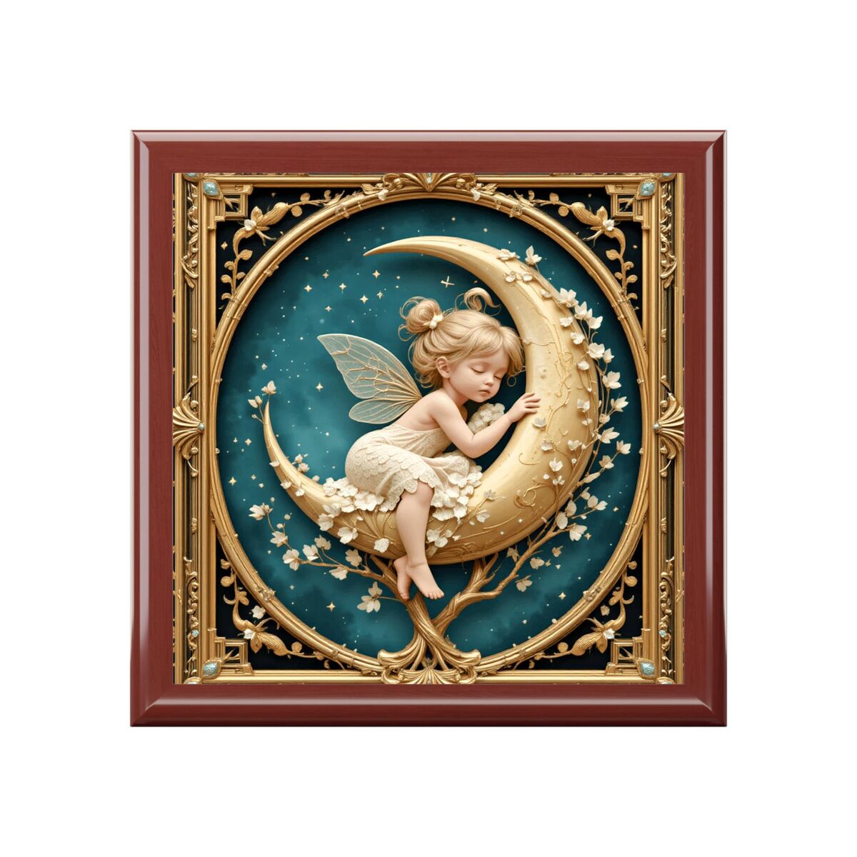 The image on the box is printed it is not carved Discover the enchanting allure of the Fairy Moon Art Nouveau Wood Jewelry Box, a stunning keepsake that beautifully marries Art Deco elegance with whimsical charm. Crafted from high-quality wood, this intricately designed box features a captivating printed style that showcases delicate fairy motifs, making it a perfect addition to any decor. Ideal for storing your cherished jewelry or treasured memories, this box is not just functional but also a striking piece of art.