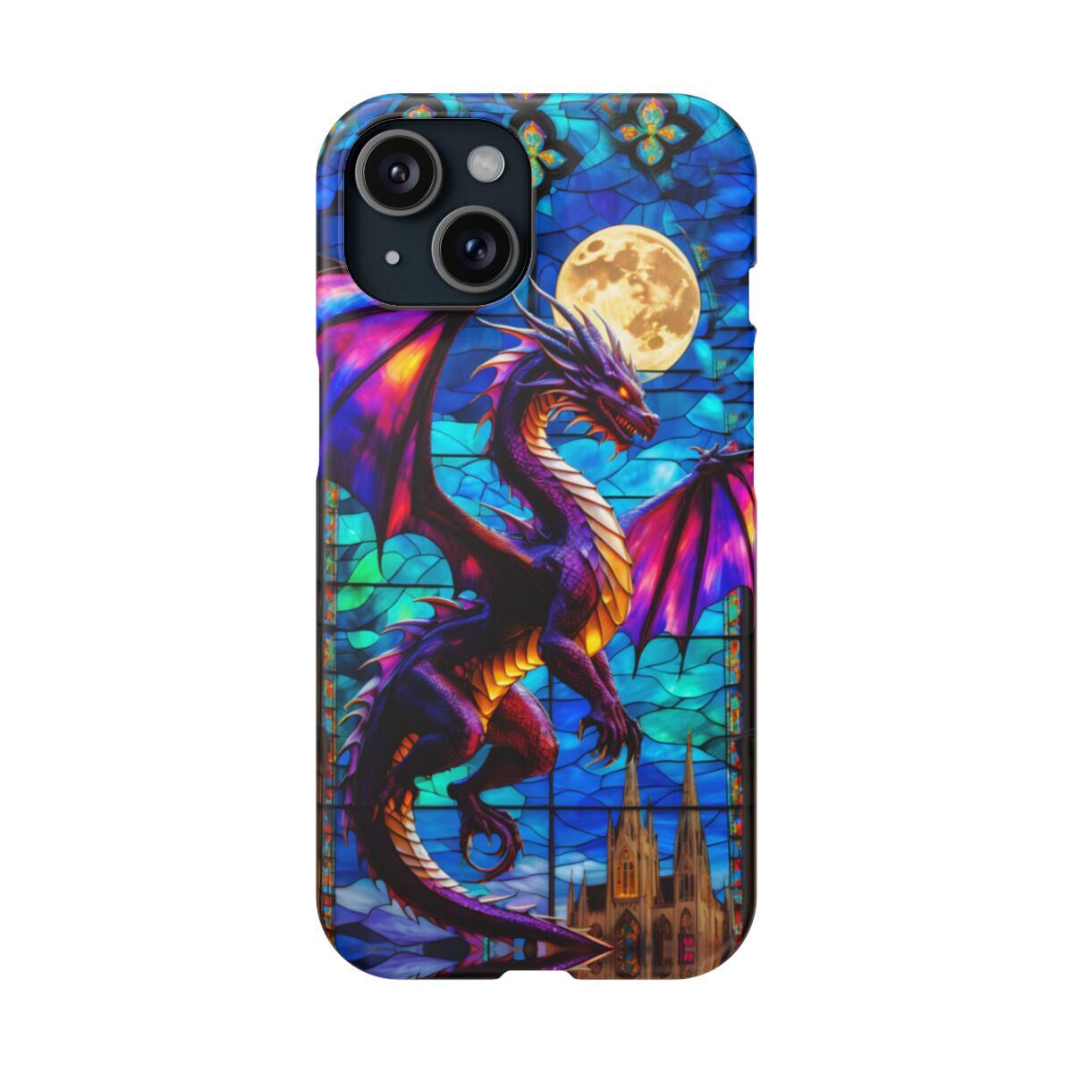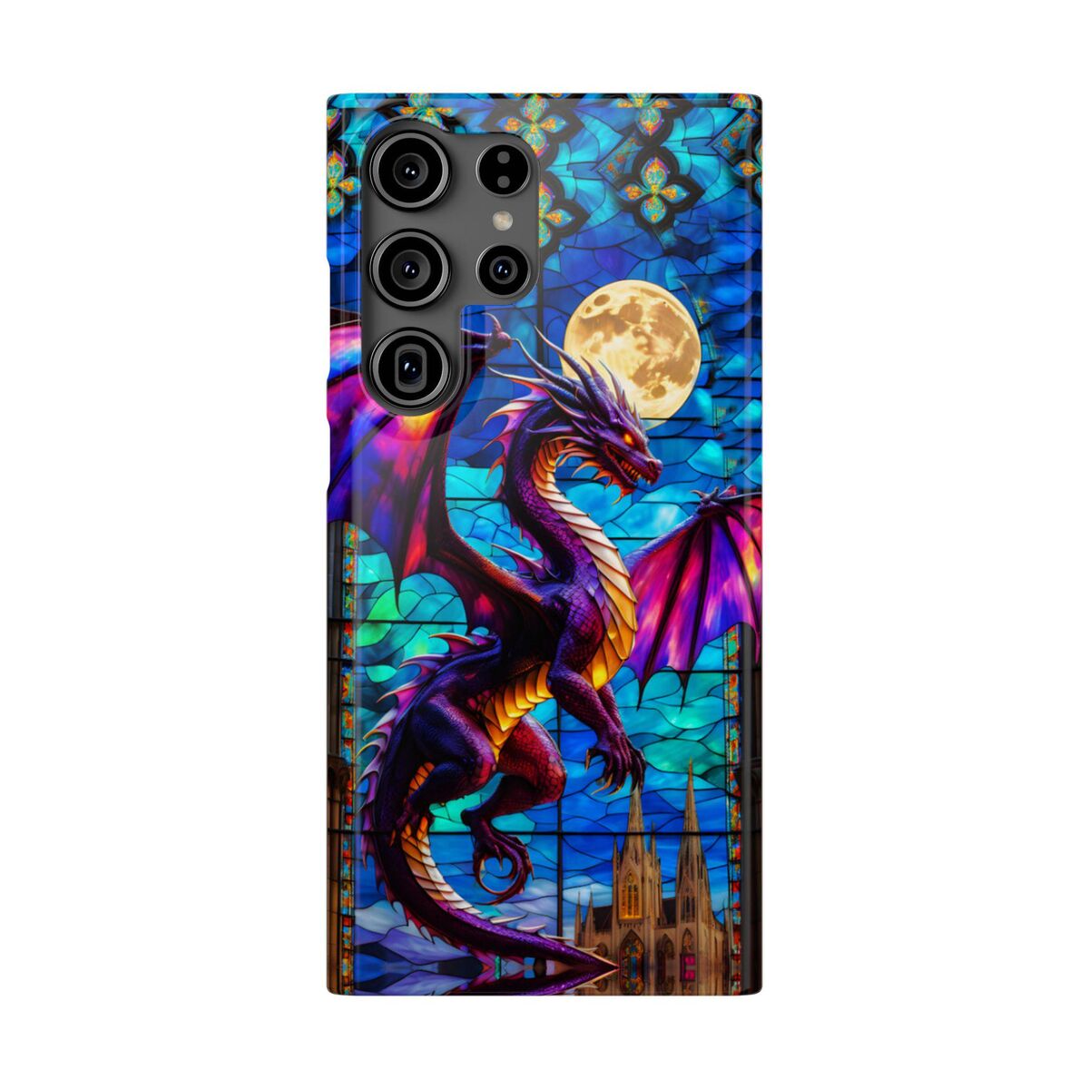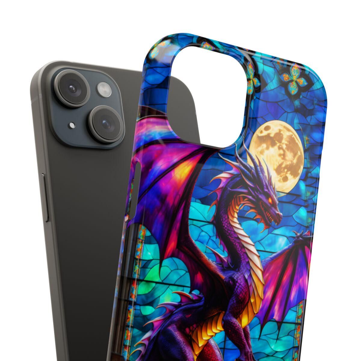 Protect your phone with the dragon Stained Glass Slim Phone Case. This durable case features a witchy dragon and moon design that adds a touch of mystique to your device while keeping it safe from drops and scratches.
