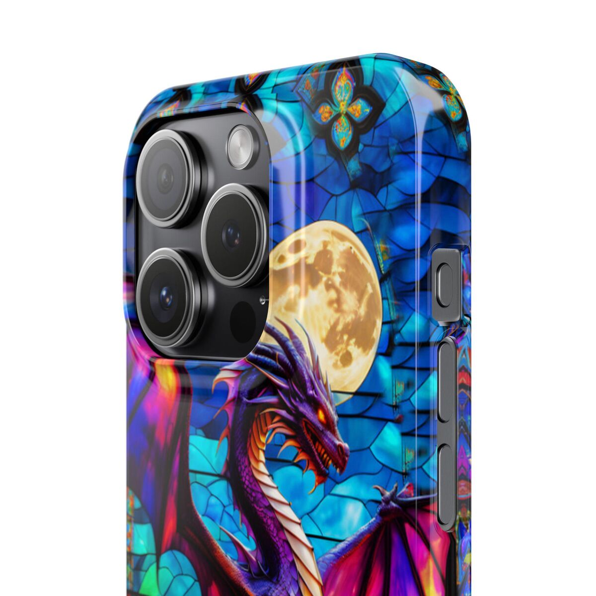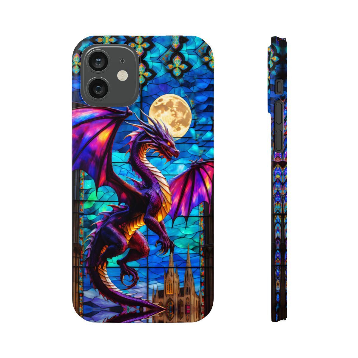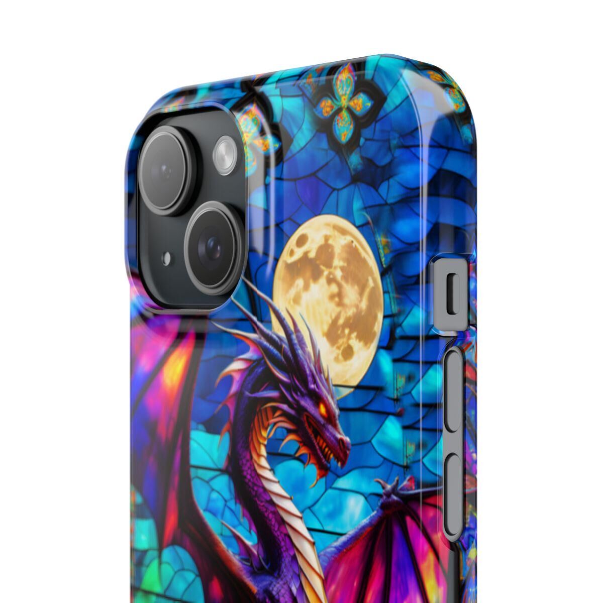 Protect your phone with the dragon Stained Glass Slim Phone Case. This durable case features a witchy dragon and moon design that adds a touch of mystique to your device while keeping it safe from drops and scratches.