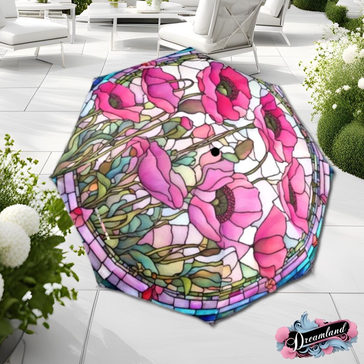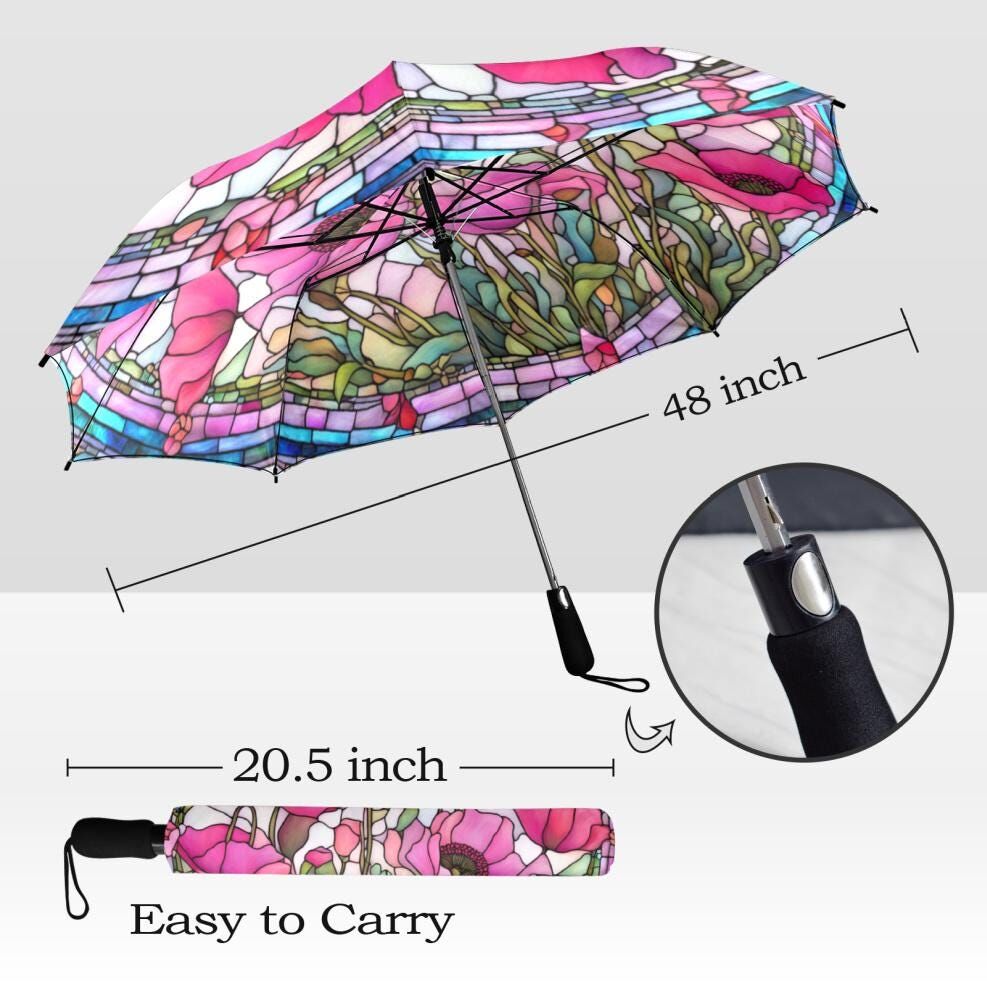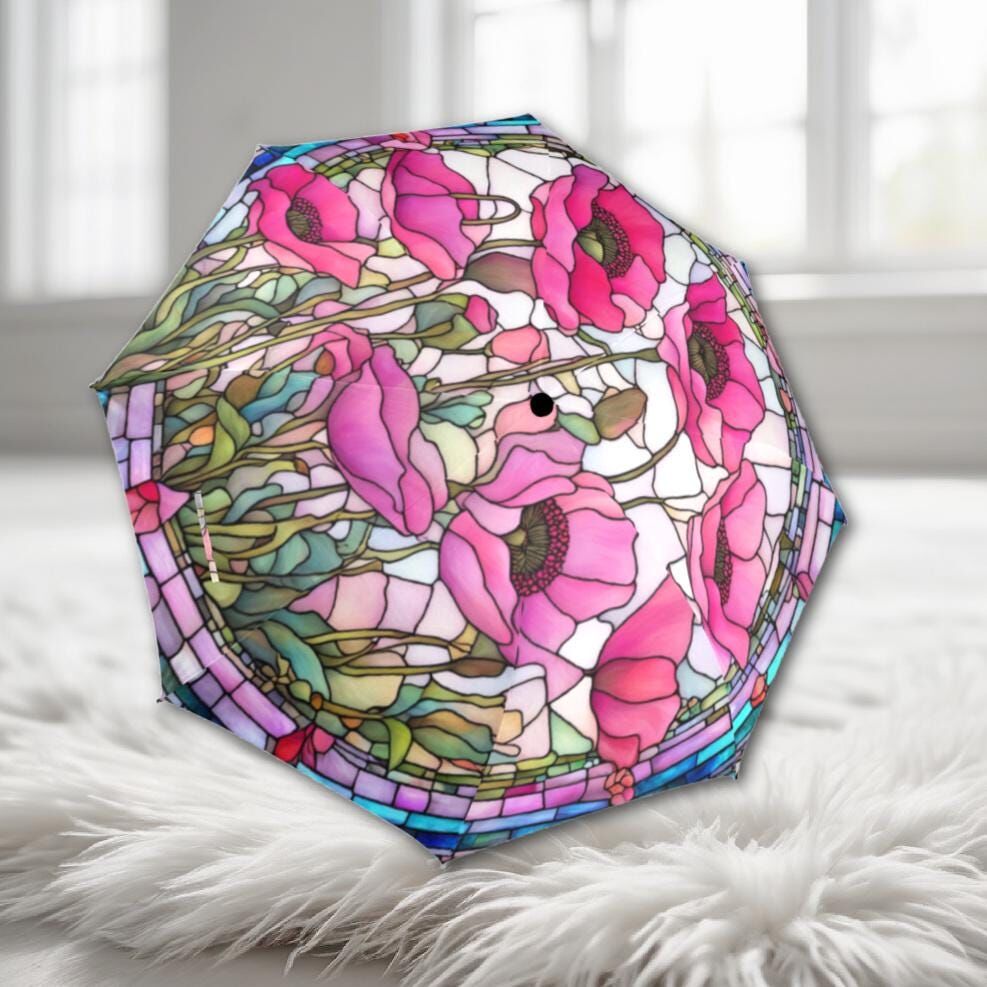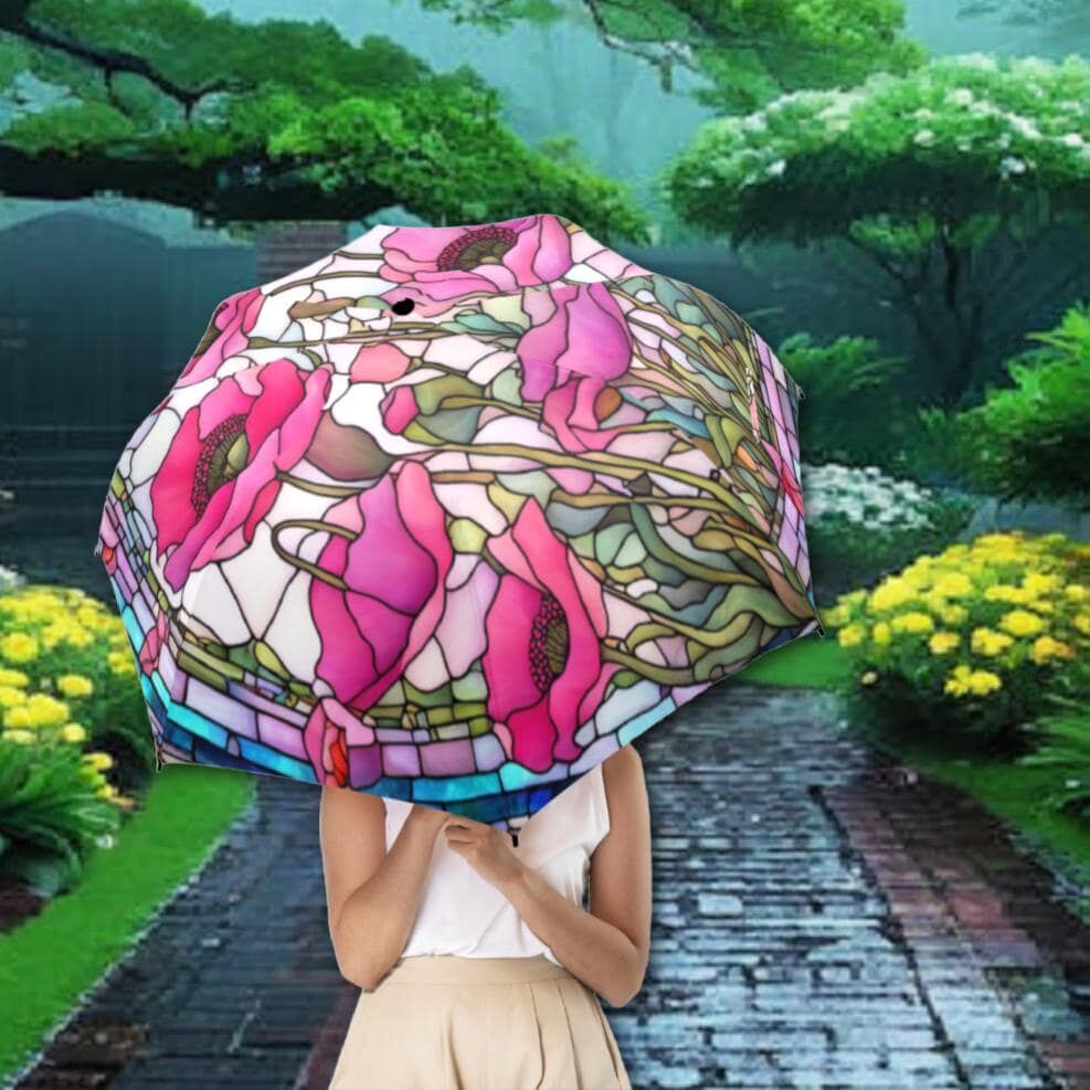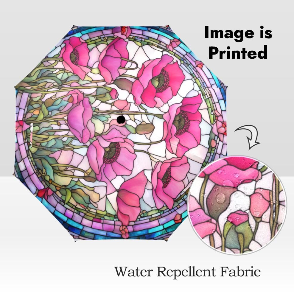 Floral Pink Poppy Romantic Umbrella Victorian Inspired Faux Stained Glass Flower Parasol Semi-Automatic Waterproof Foldable Umbrella