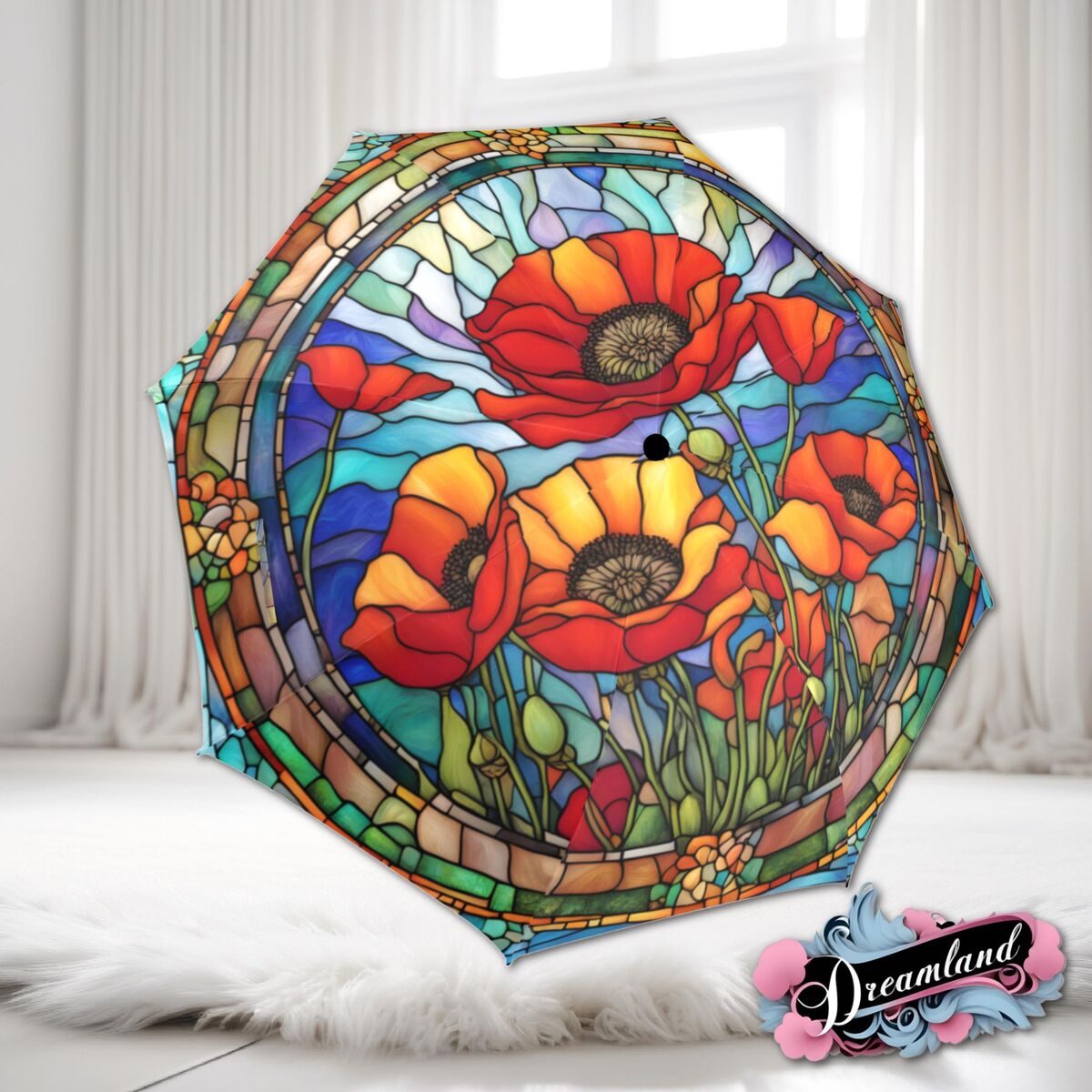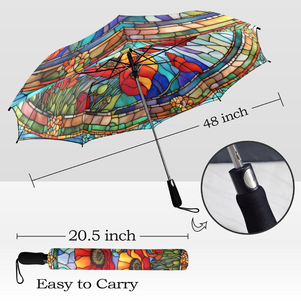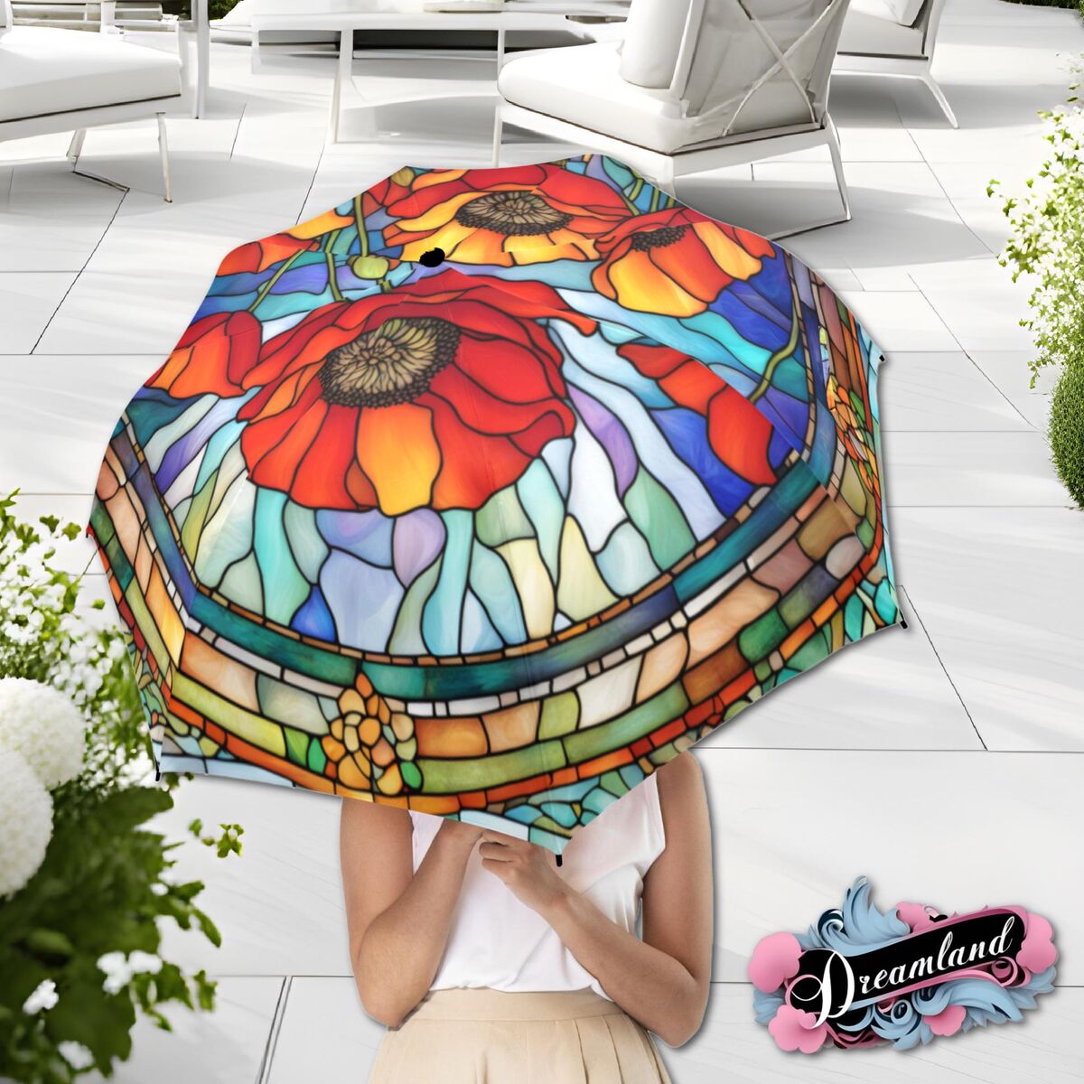 Flower Romantic Umbrella Poppy Field Blossoms Faux Stained Glass Flower Parasol Semi-Automatic Waterproof Foldable Umbrella