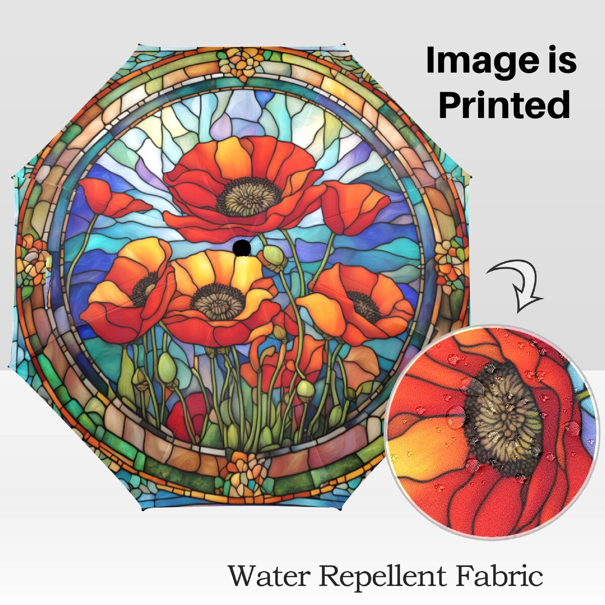 Red Poppy Flower Romantic Umbrella Blossoms Faux Stained Glass Flower Parasol Semi-Automatic Waterproof Foldable Umbrella