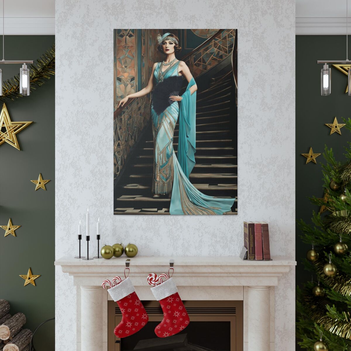 . Enhance the elegance of your living room with our Art Deco Wall Art Canvas Poster Print. Inspired by the iconic Gatsby era, this stunning piece showcases a captivating mid-century lady in a striking gold and teal black color scheme. The intricate details and bold lines of this painting exude a sense of sophistication and glamour, making it a perfect addition to any art lover's collection.