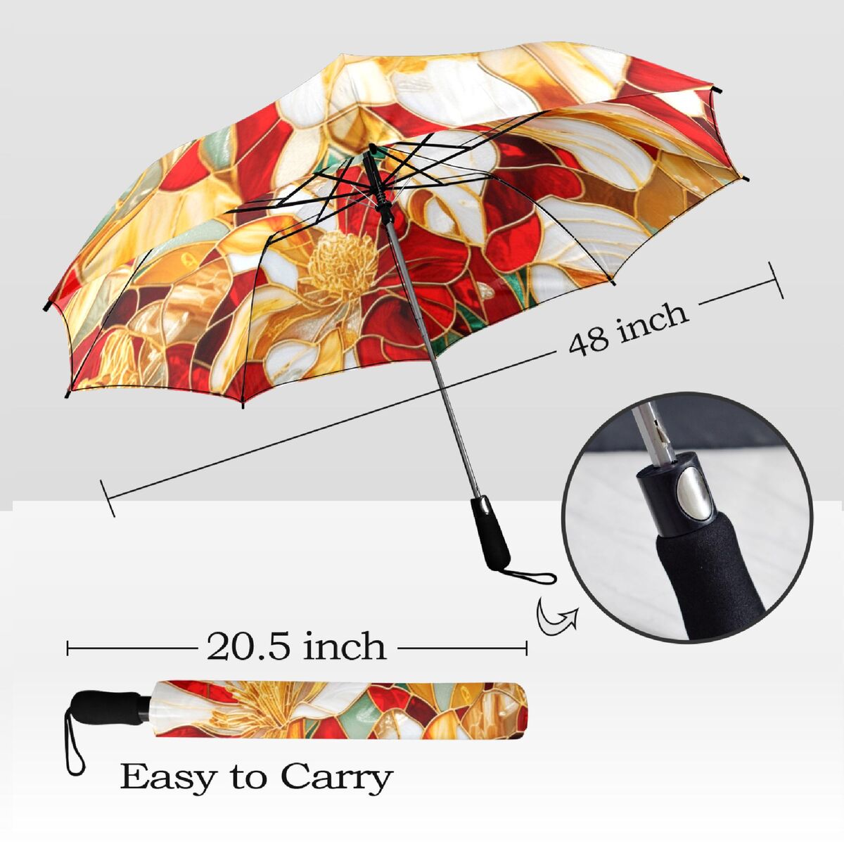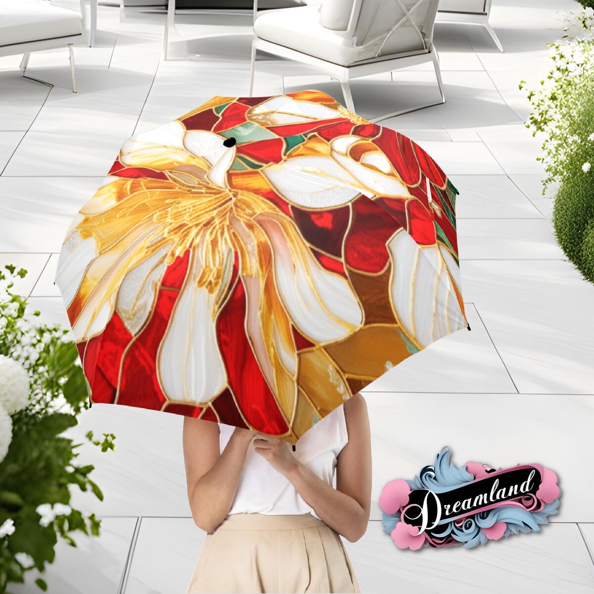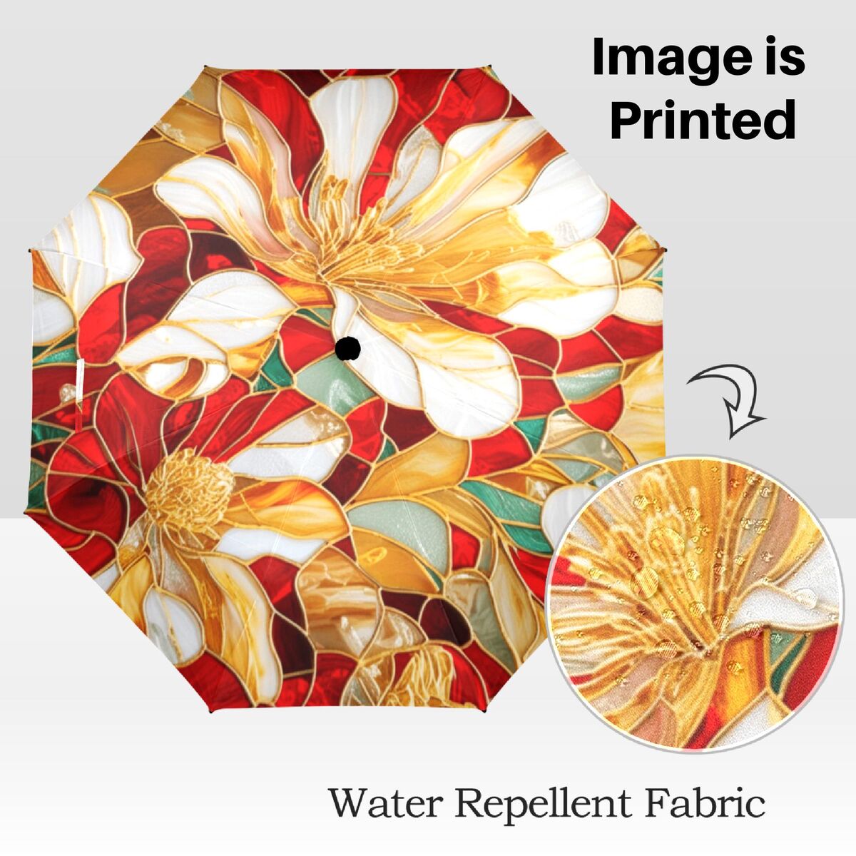 Gold Red White Flower Umbrella Romantic Magnolia Floral Art Nouveau Faux Stained Glass Parasol Semi-Automatic Waterproof Foldable Umbrella