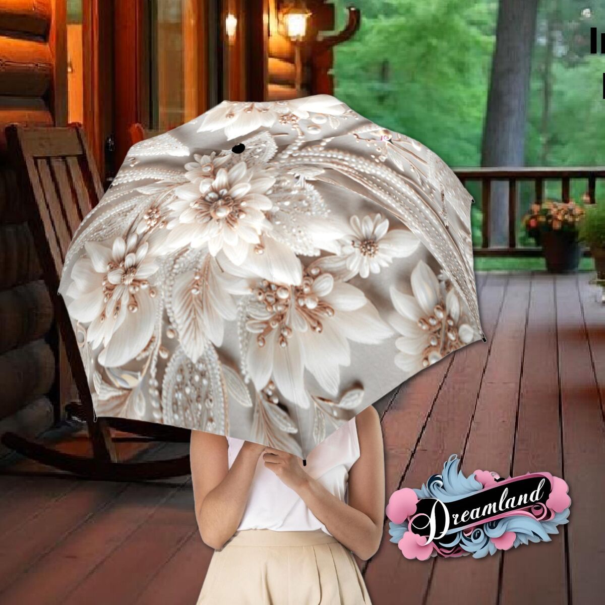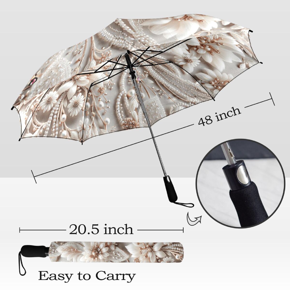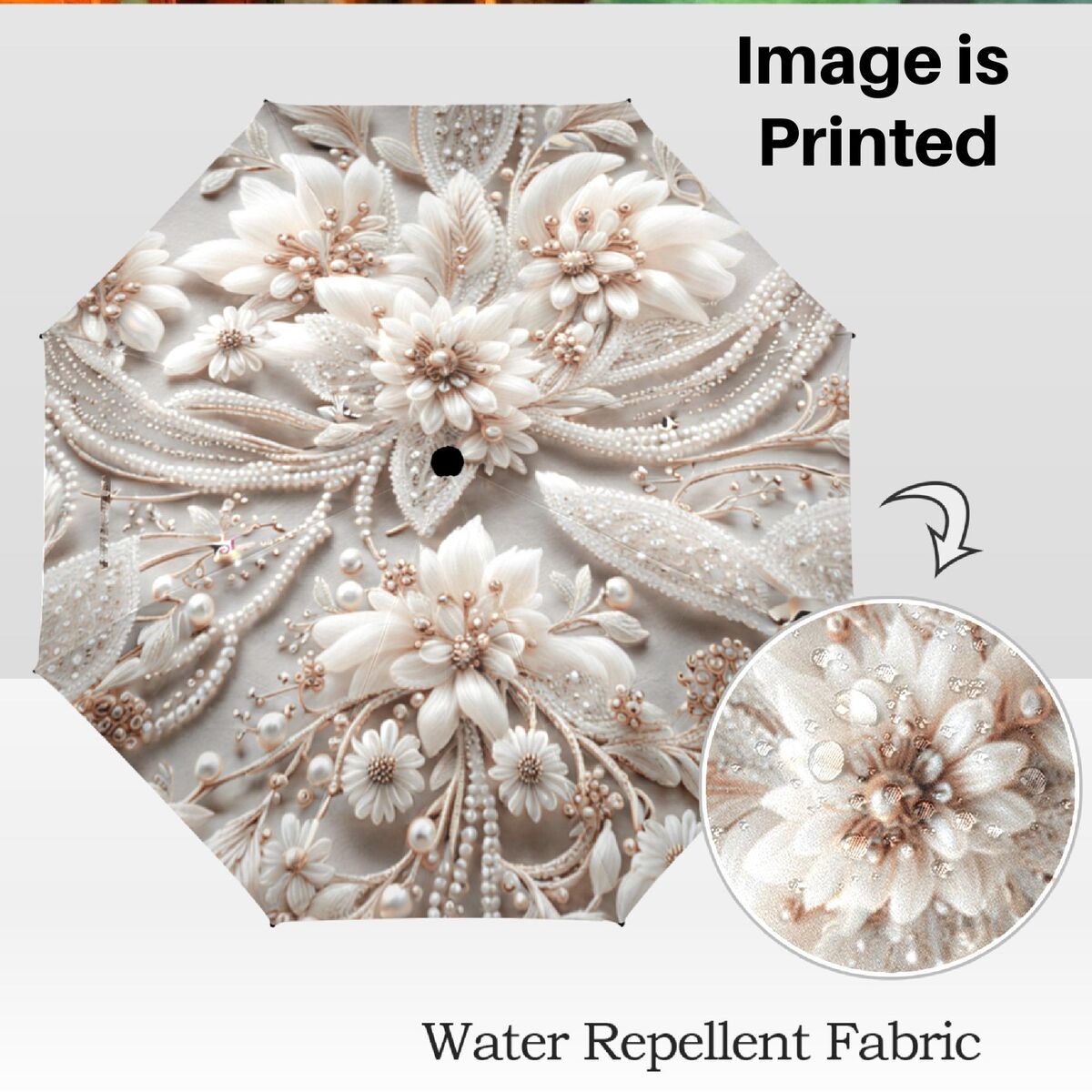 Gold Silver Gray Umbrella Flower Floral Art Nouveau Style Printed Faux Floral Beads Parasol Semi-Automatic Waterproof Foldable Umbrella