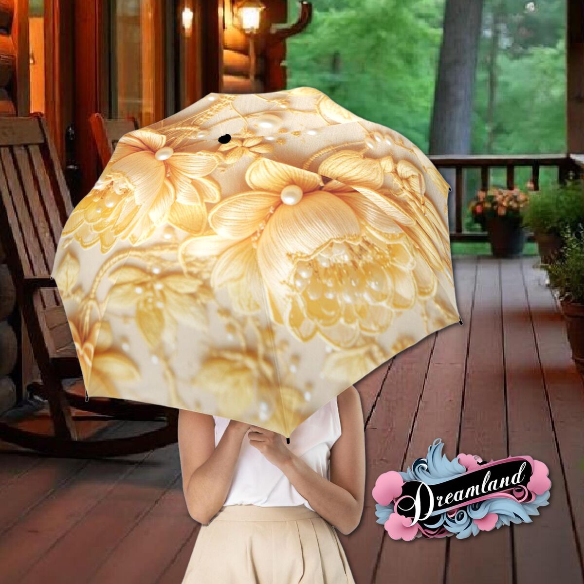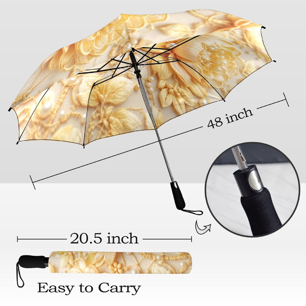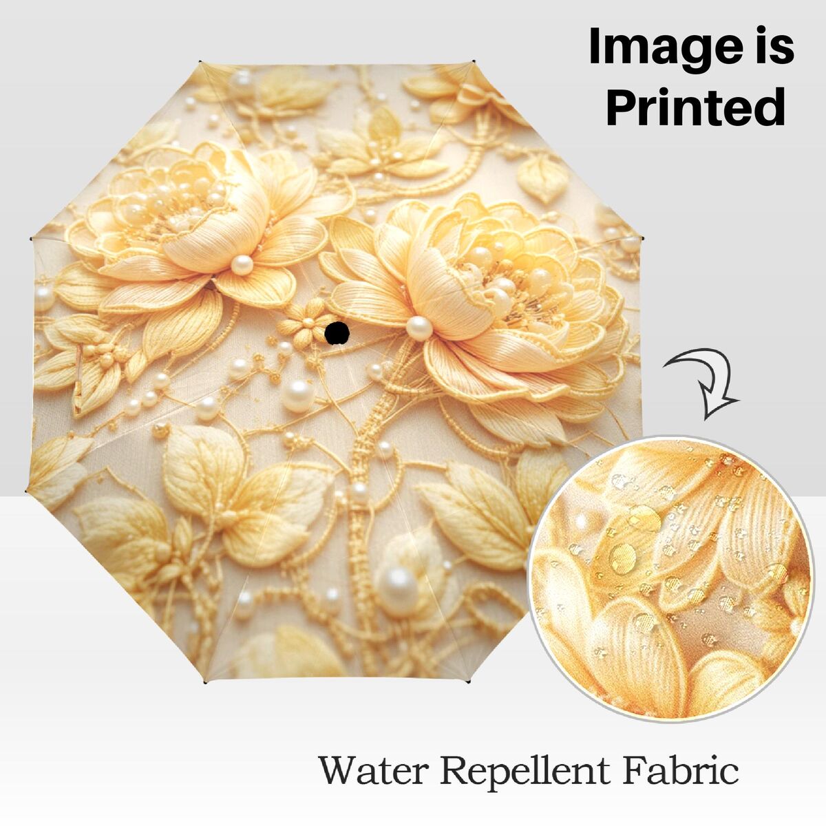 Golden Yellow Flower Umbrella Art Nouveau Printed Flowers Floral Parasol Semi-Automatic Waterproof Foldable Umbrella