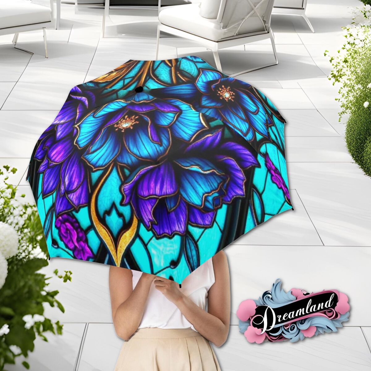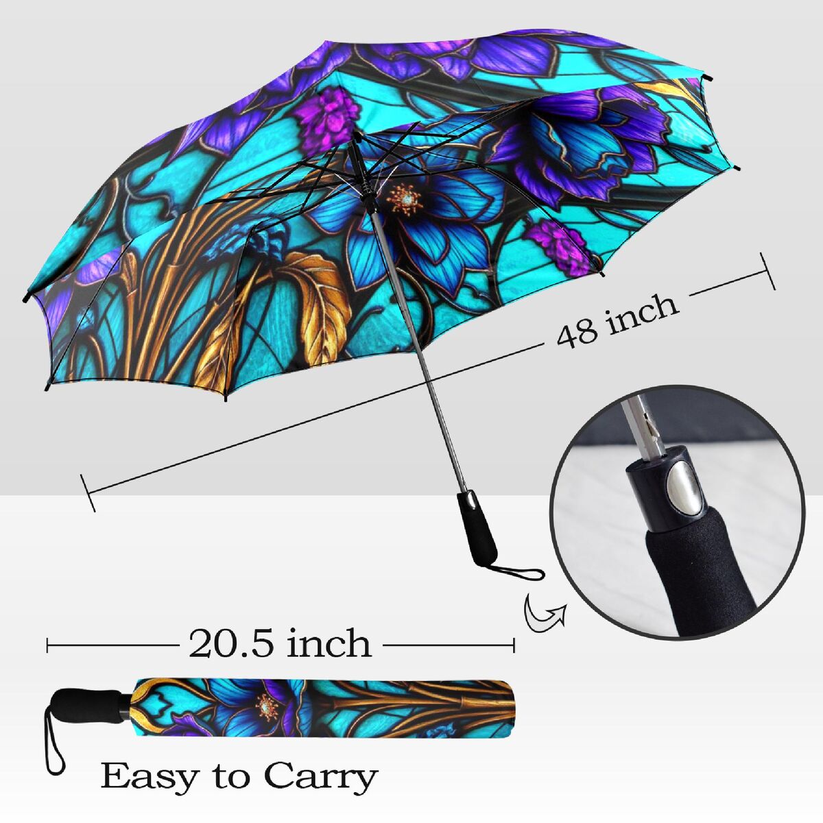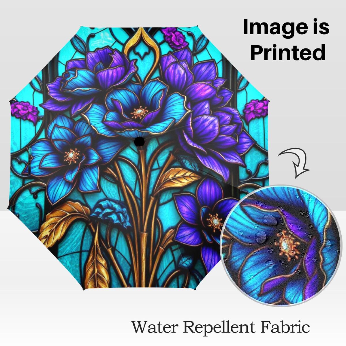 Gothic Blue Purple Flower Umbrella Romantic Floral Art Nouveau Faux Stained Glass Parasol Semi-Automatic Waterproof Foldable Umbrella
