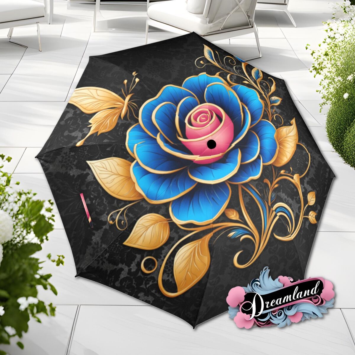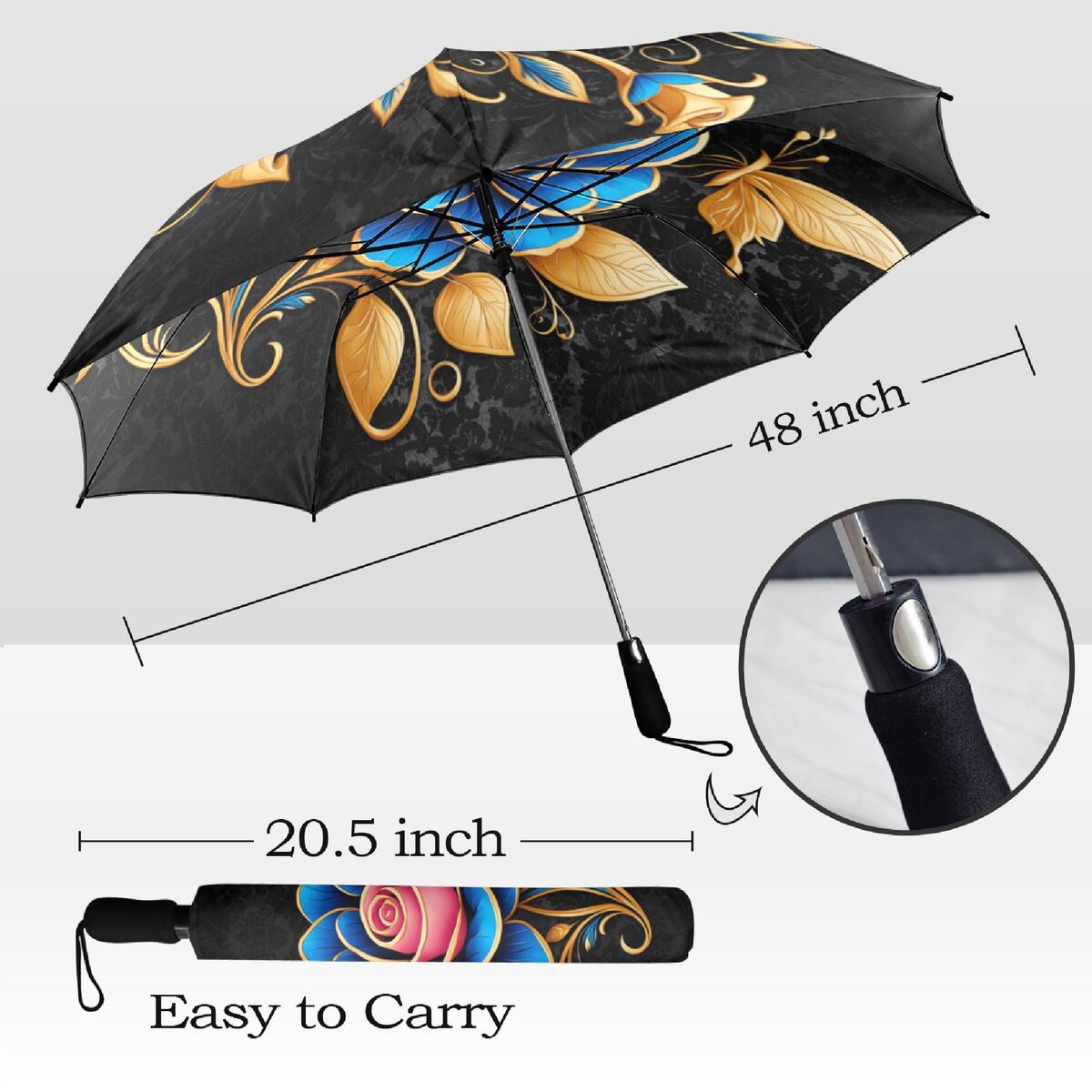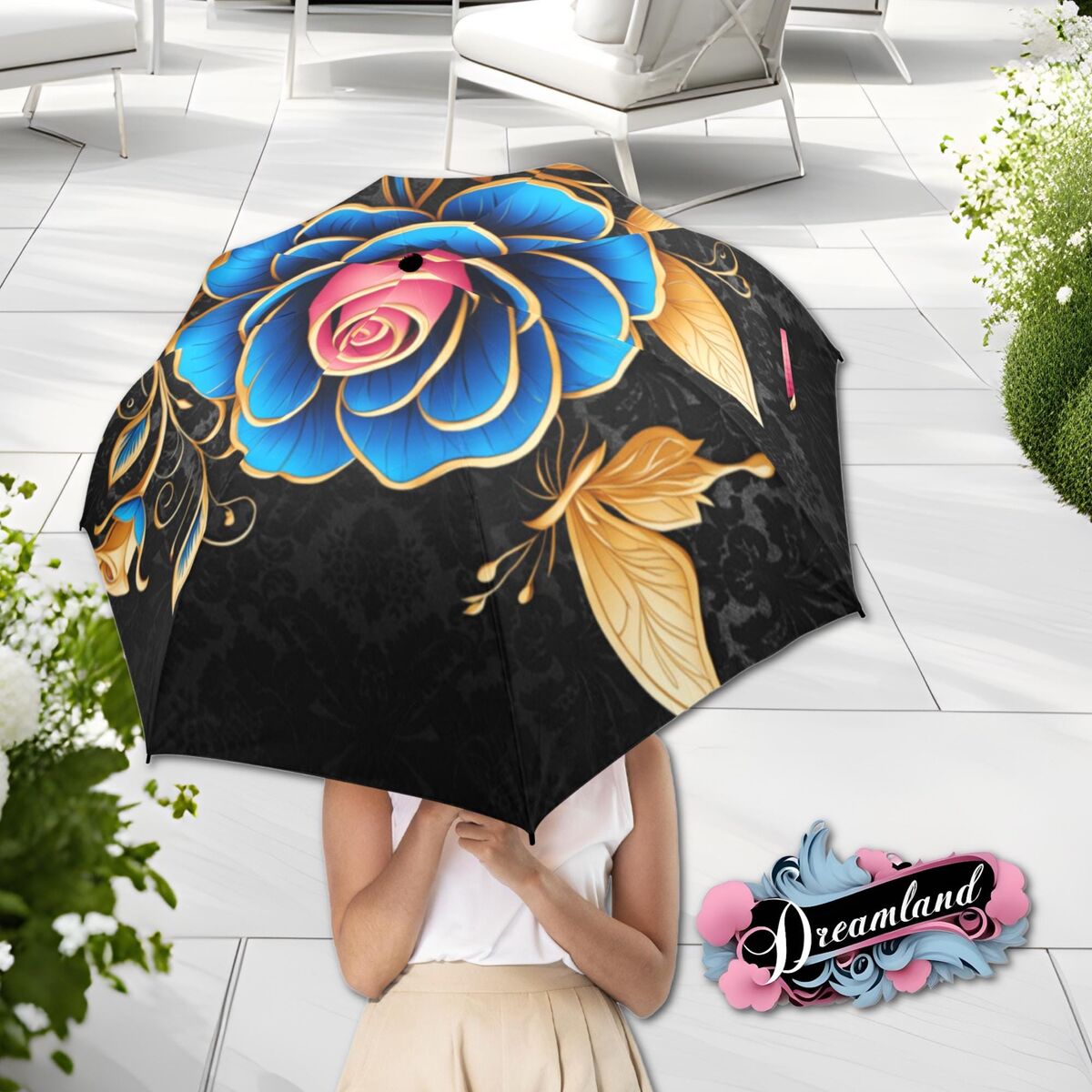 Gothic Blue Rose Umbrella Unique Style Printed Faux Flower Lace Parasol Semi-Automatic Waterproof Foldable Umbrella