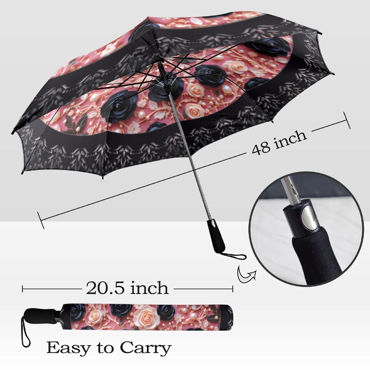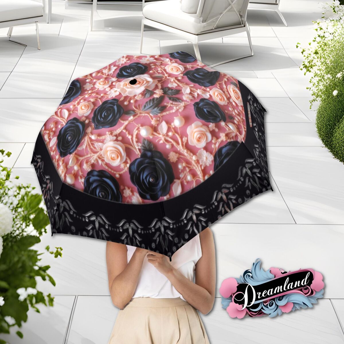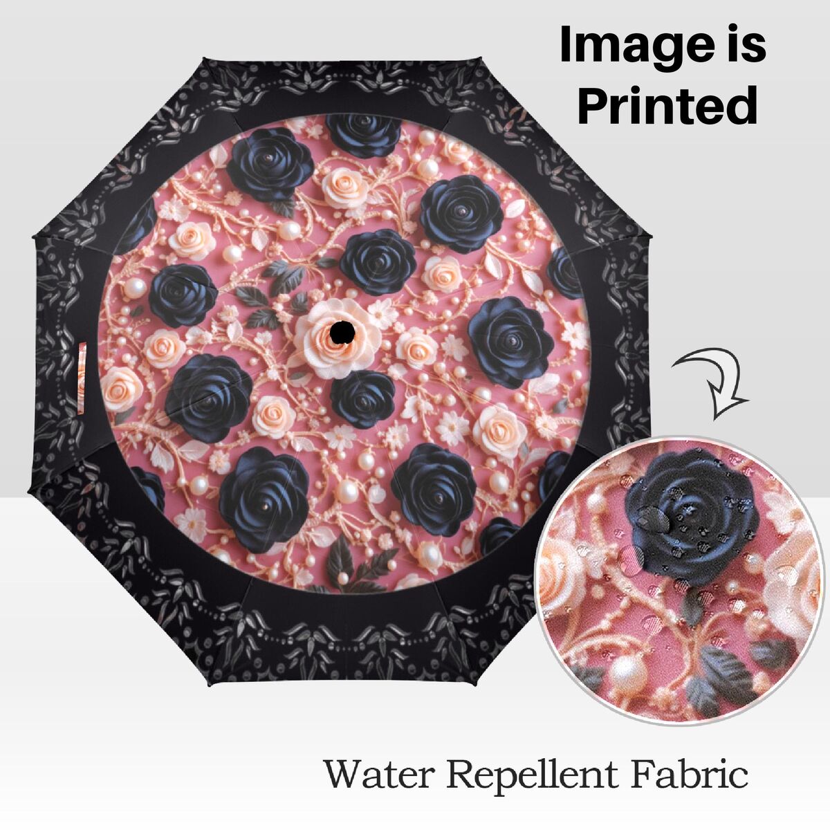 Gothic Pink Black Umbrella Flower Roses Romantic Art Nouveau Floral Faux Printed Lace Parasol Semi-Automatic Waterproof Foldable Umbrella
