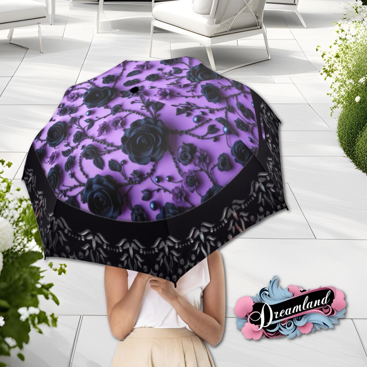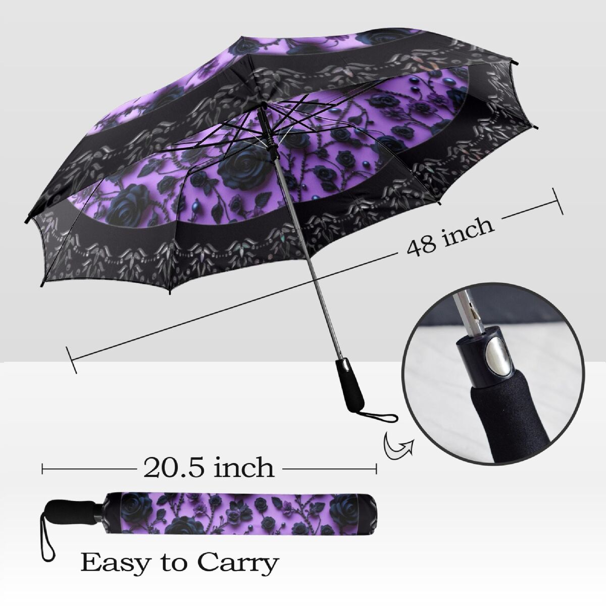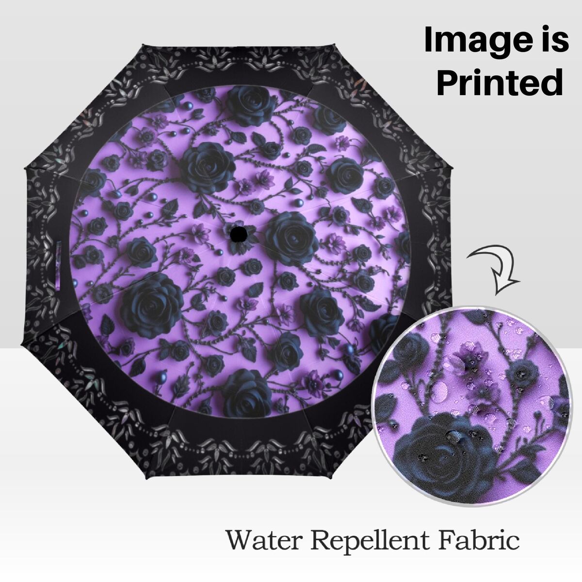 Gothic Purple Black Umbrella Flower Roses Romantic Art Nouveau Floral Faux Printed Lace Parasol Semi-Automatic Waterproof Foldable Umbrella